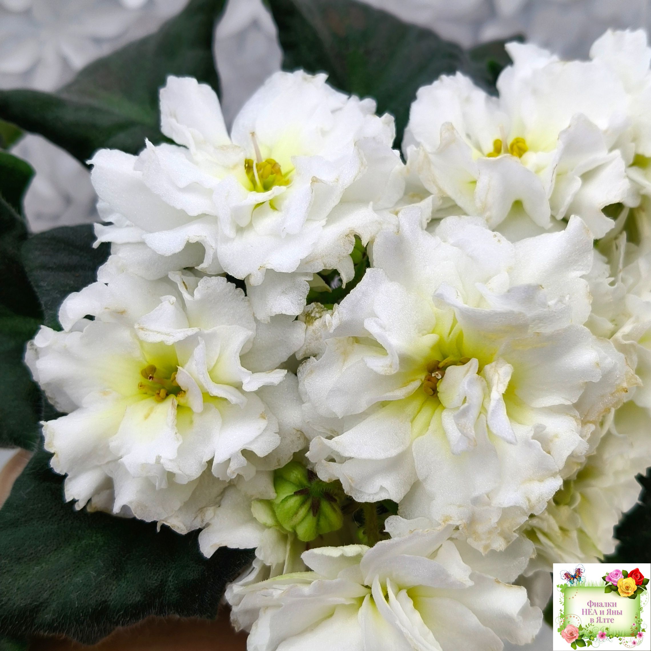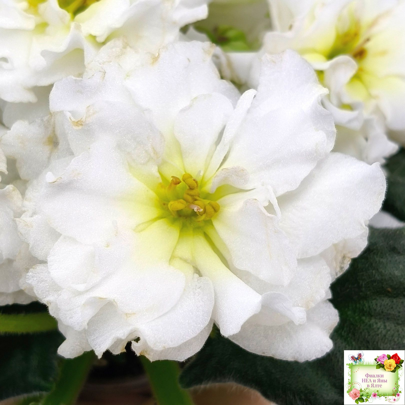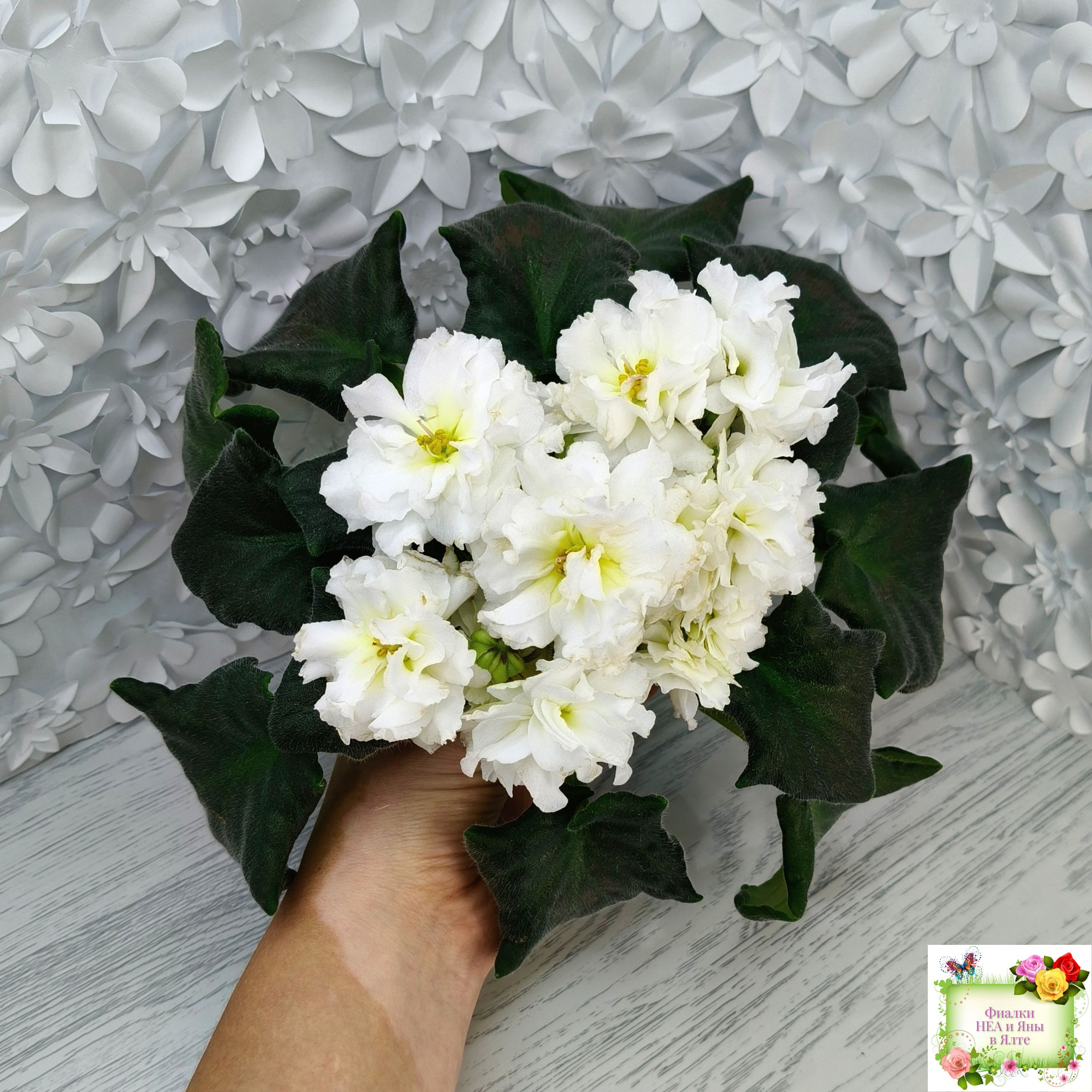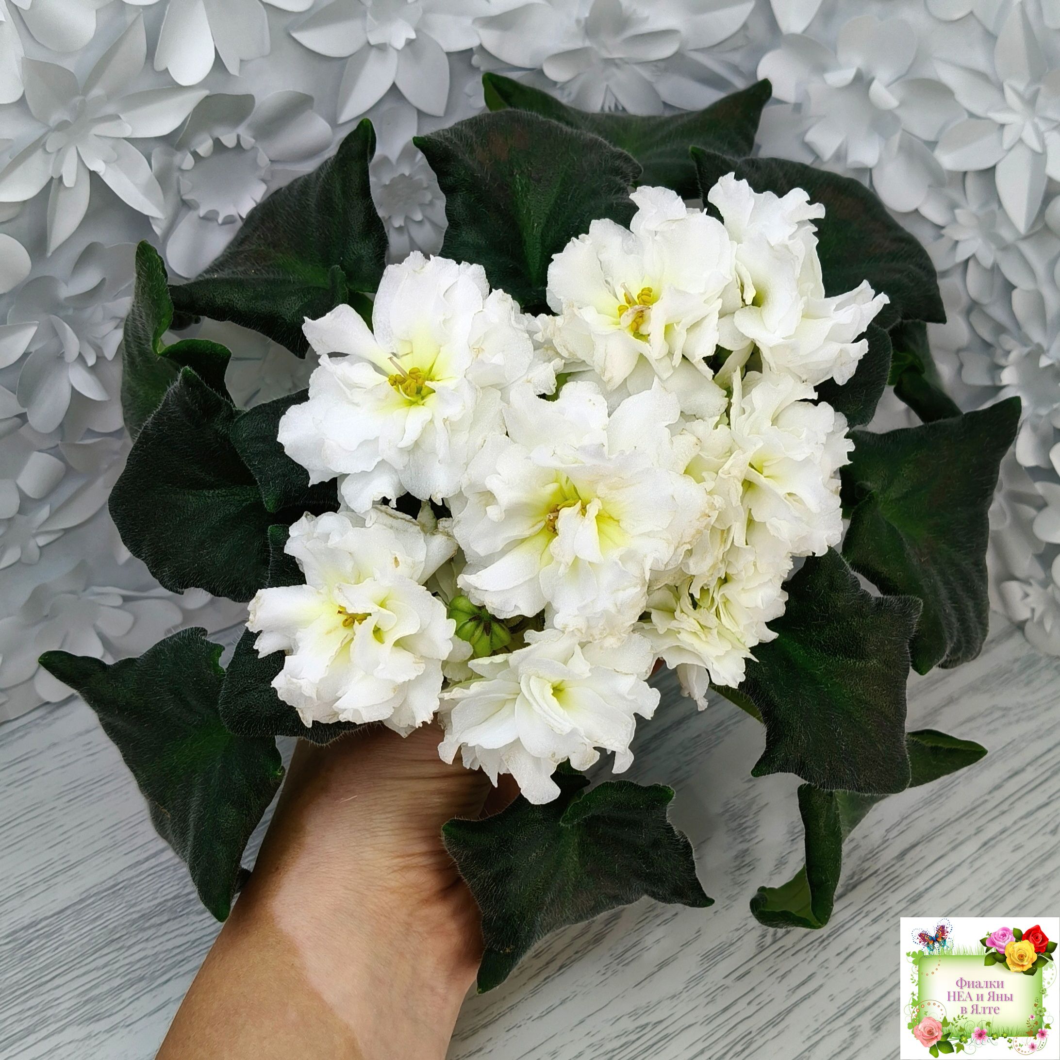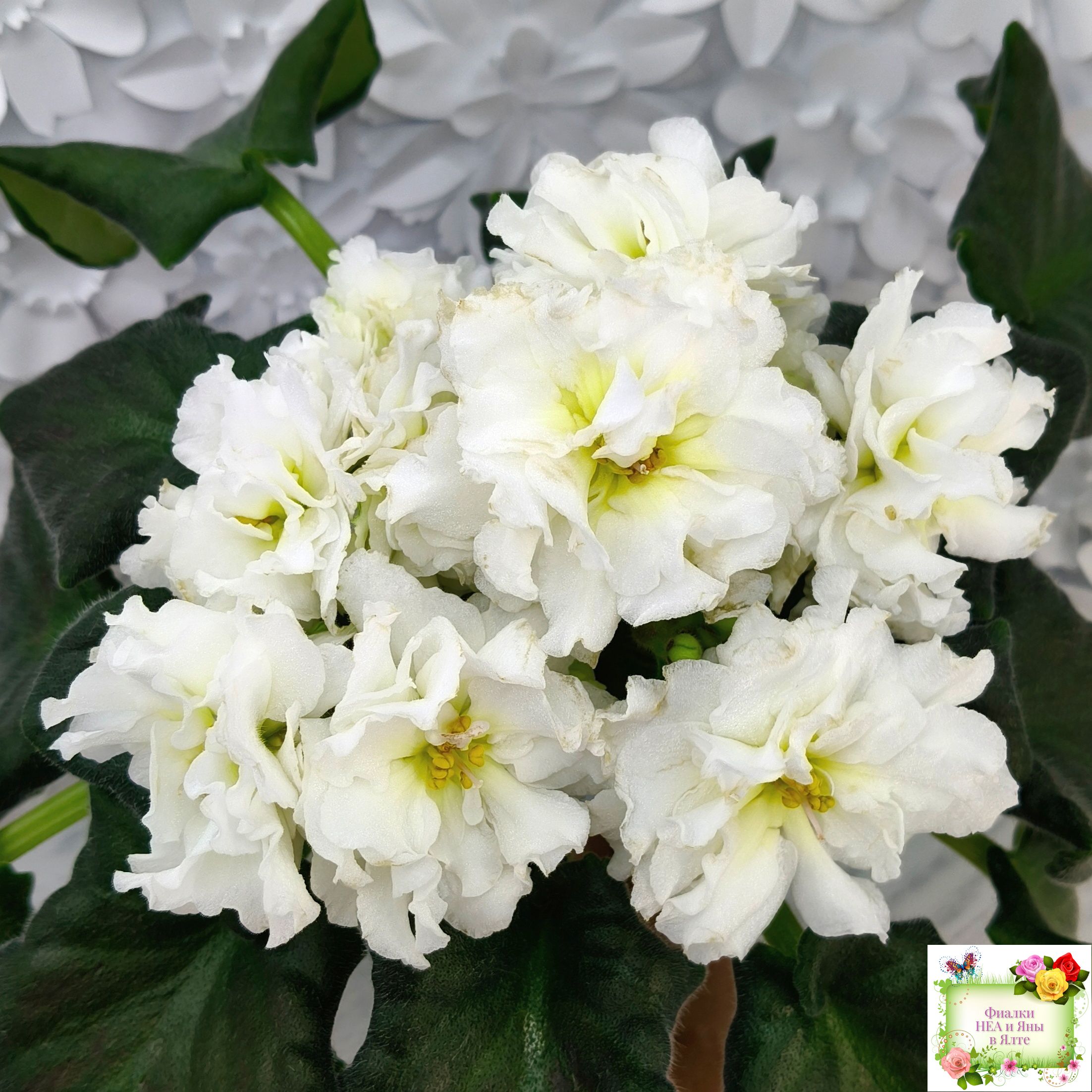 Крупные (до 7 см) махровые белые цветы с ярким небольшим жёлтым центром. Волнистые цветы на коротких цветоносах формируются в центре розетки красивым букетиком. Лист средне-зелёный, допускается незначительное покраснение снизу листа и пару розовых теней на одном цветке.