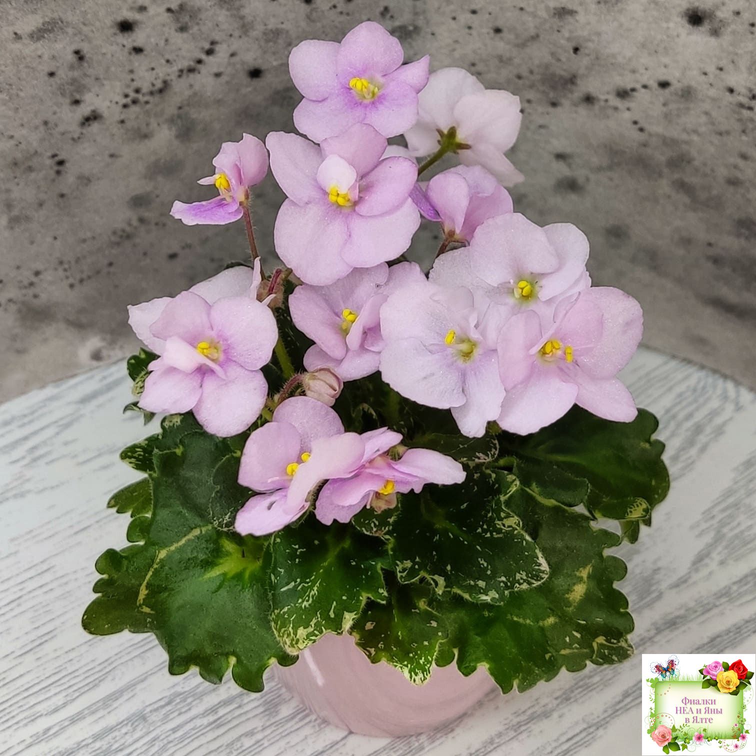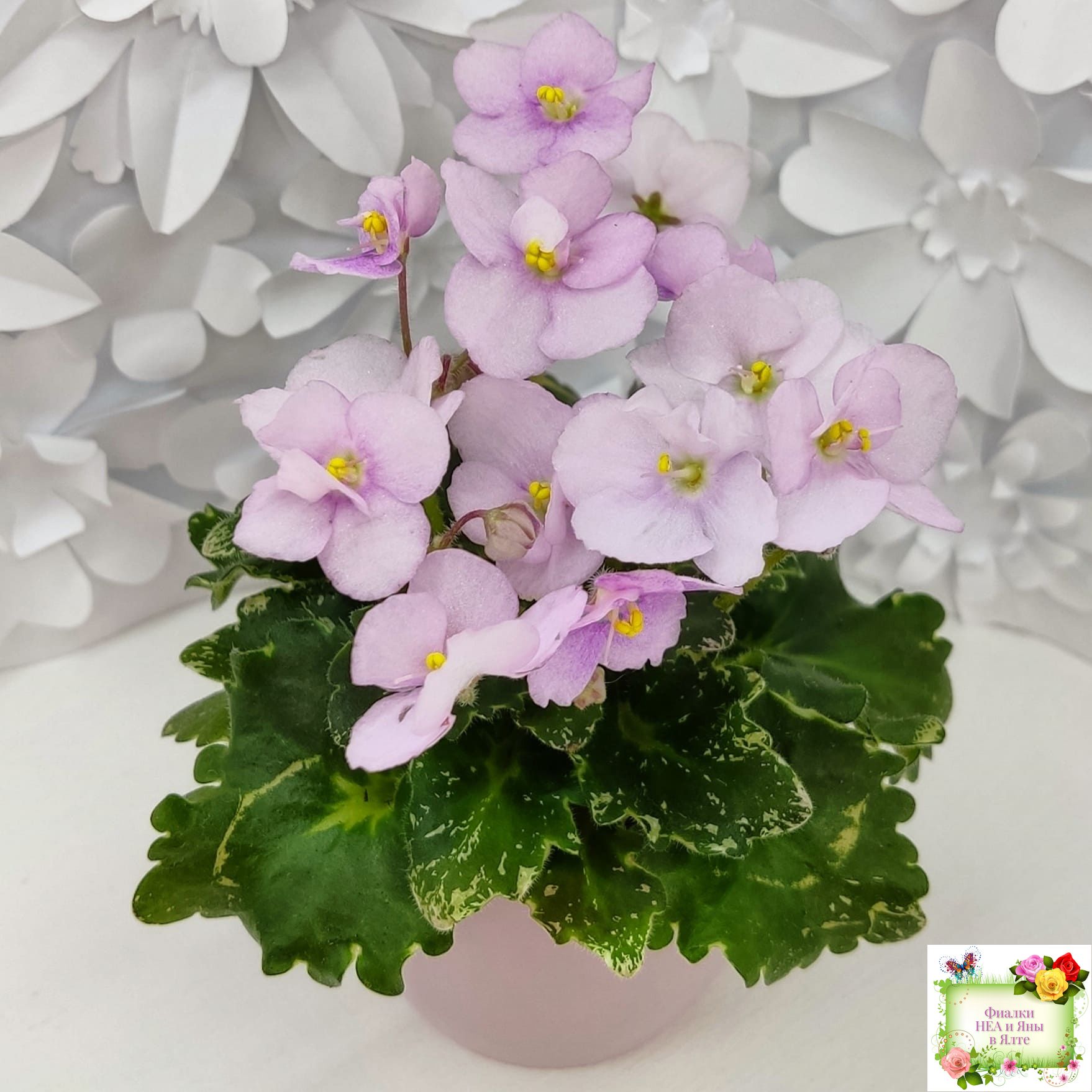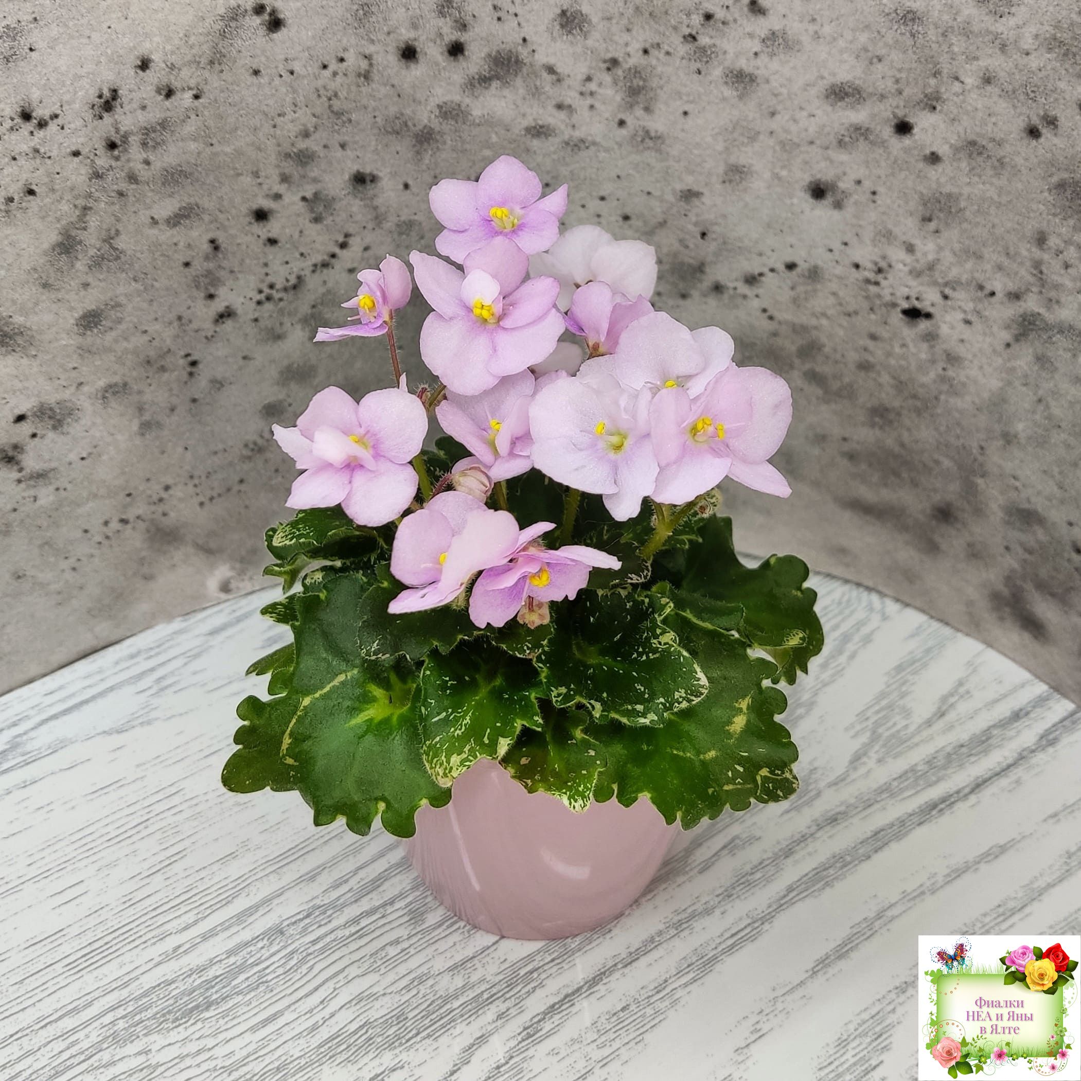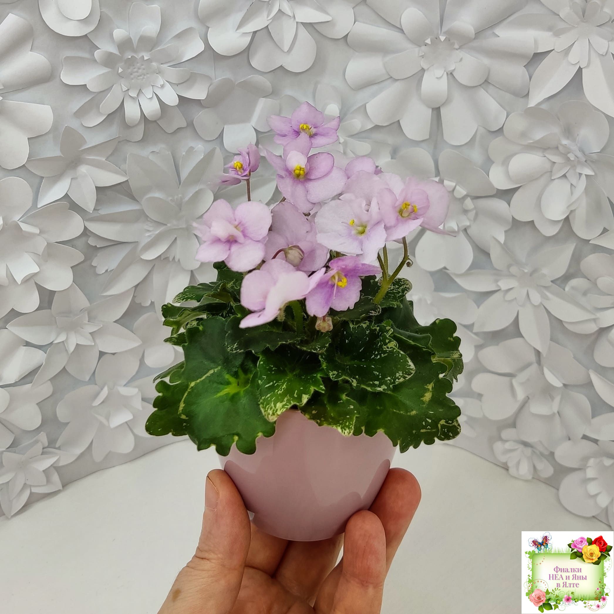 Простой розовый с более темный центром и слегка волнистым краем цветок. Тёмно-зелёная с белым зубчатая пестролистная герл листва. Миниатюра.