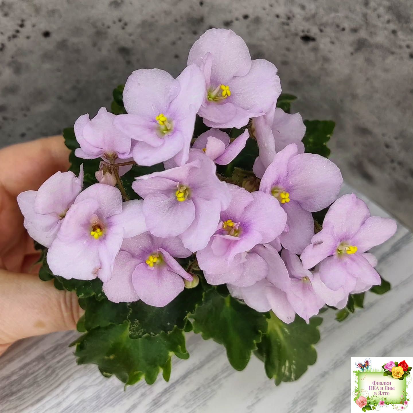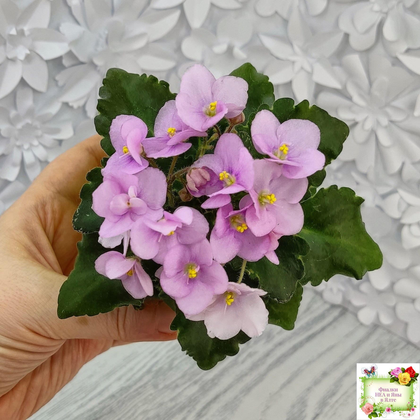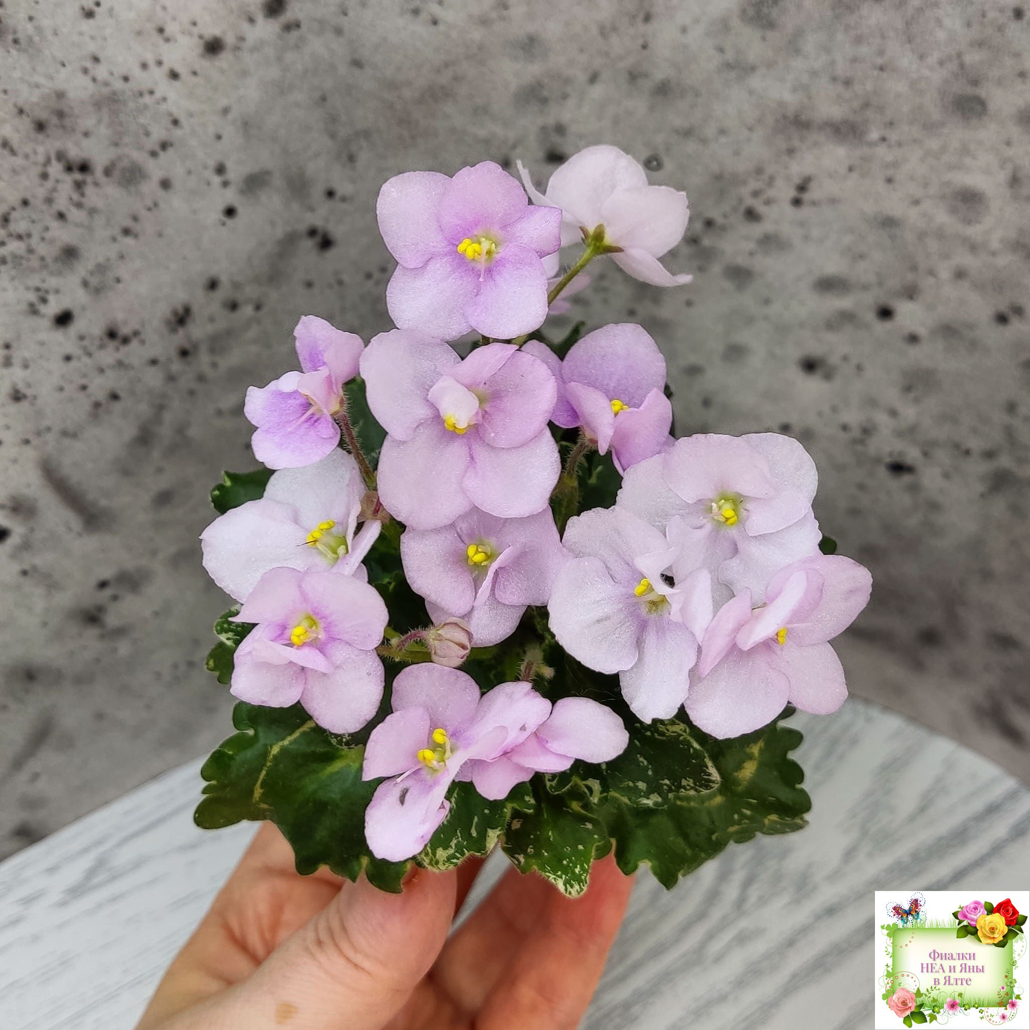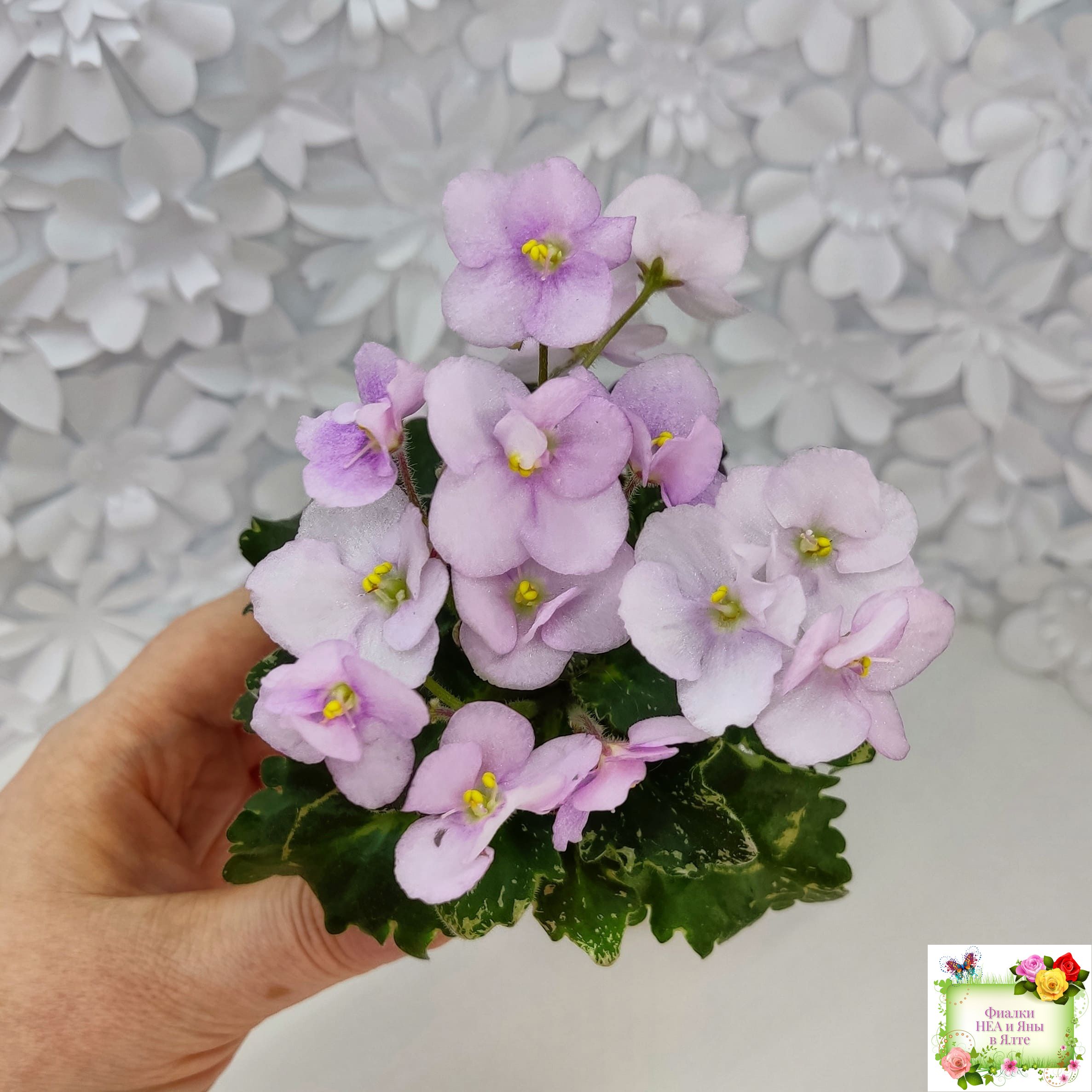 Простой розовый с более темный центром и слегка волнистым краем цветок. Тёмно-зелёная с белым зубчатая пестролистная герл листва. Миниатюра.