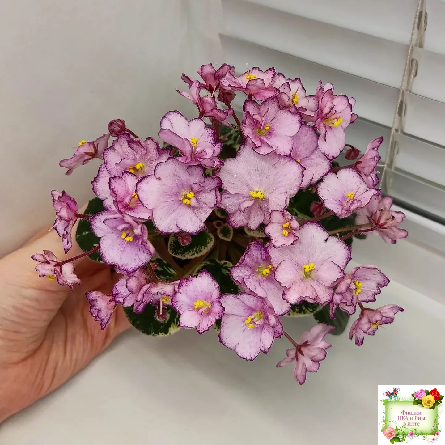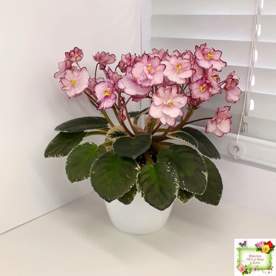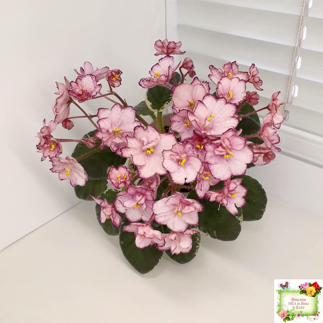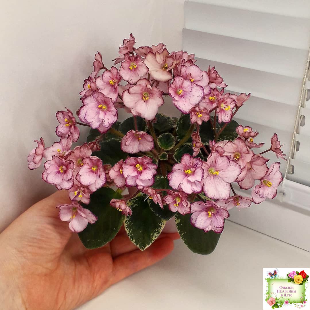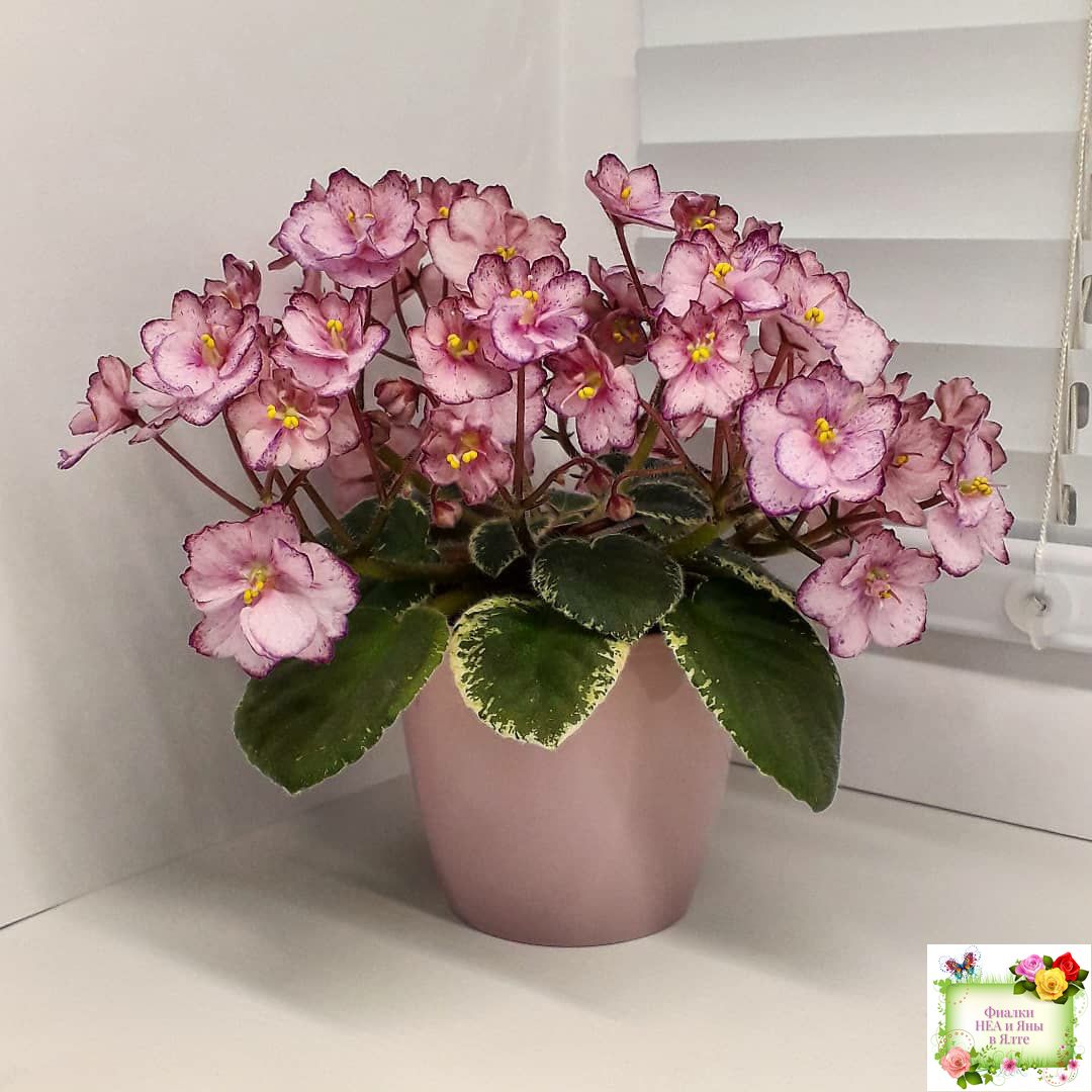 Огромное количество розовых с зеленцой в бордовую крапушку колокольчиков и полуколокольчиков, цветет постоянно, все четыре сезона".