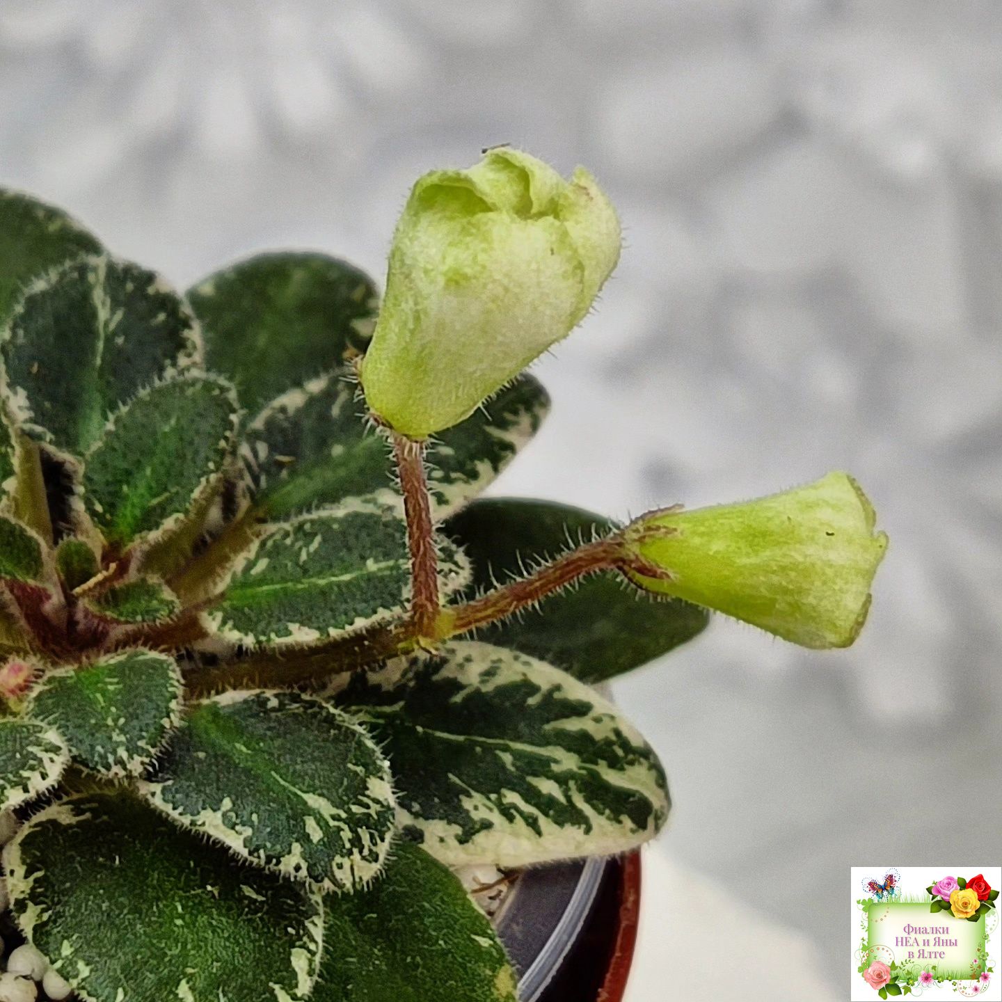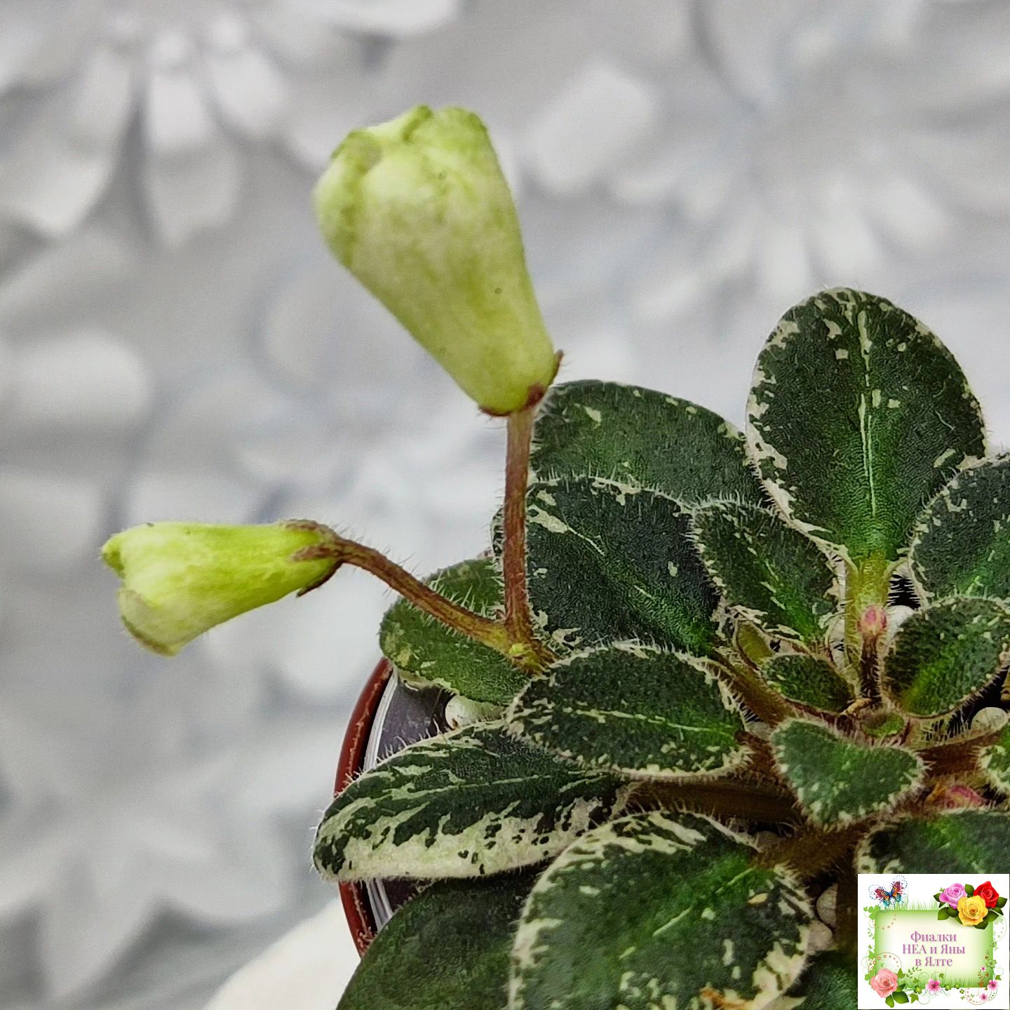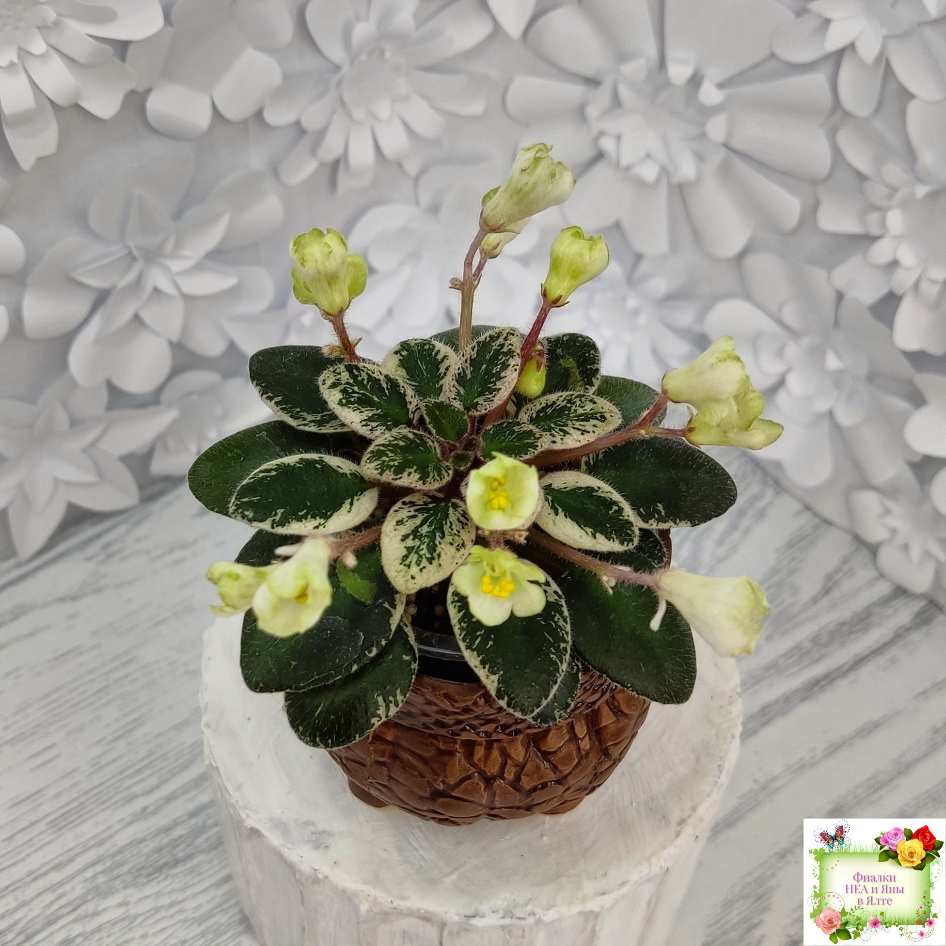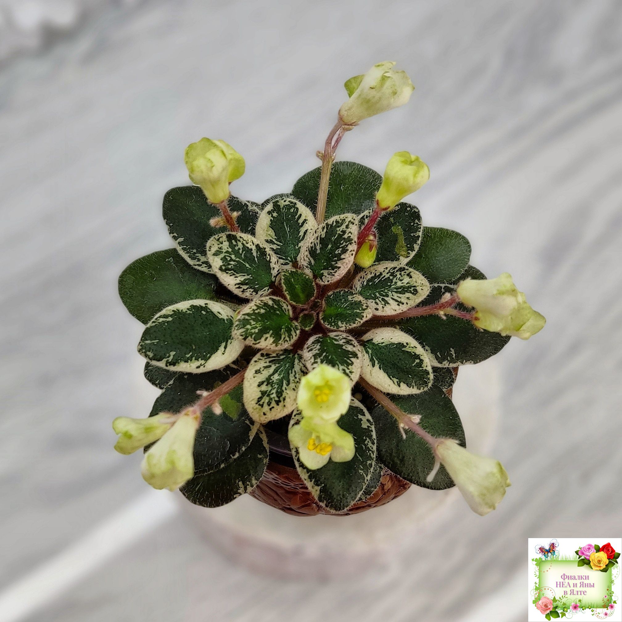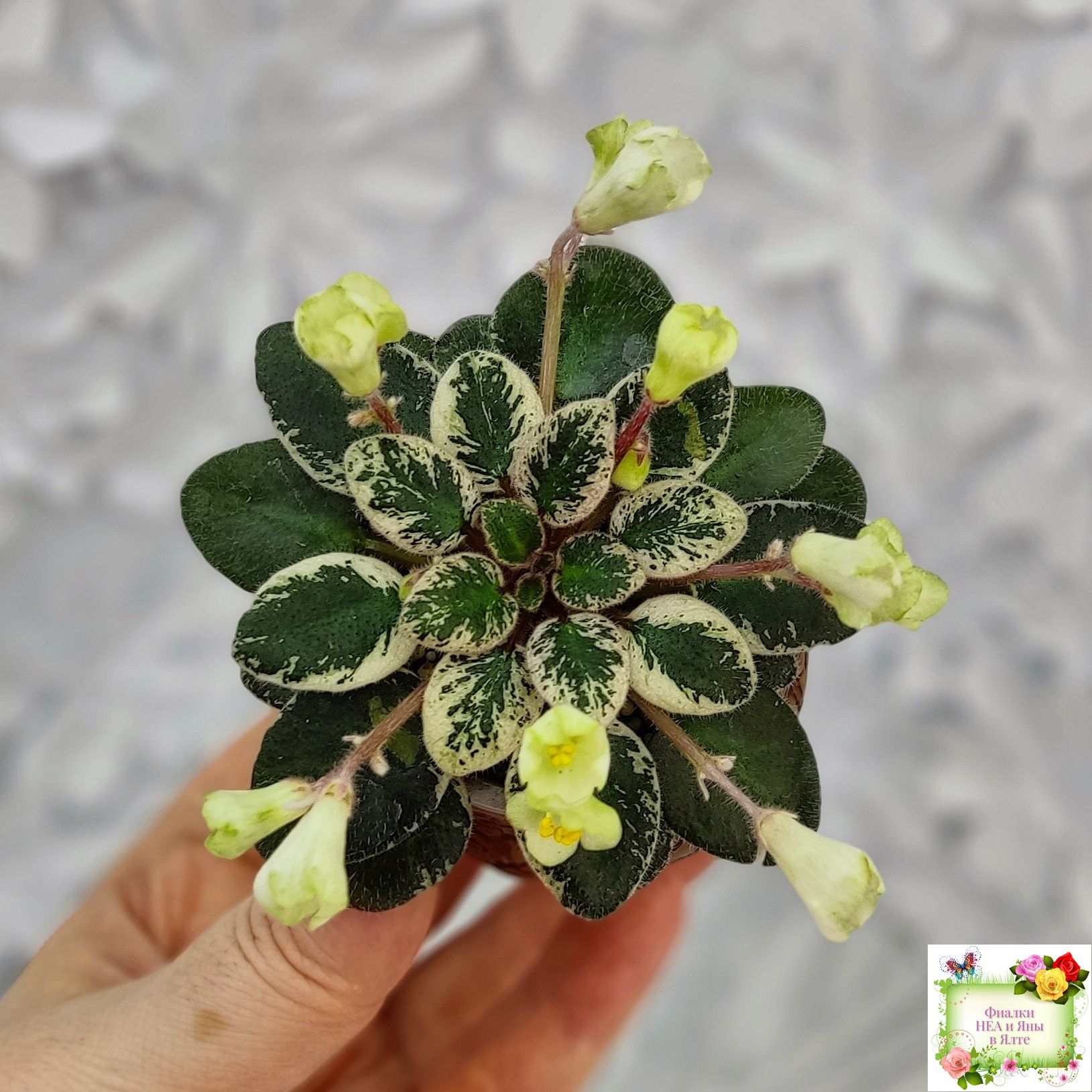 Розетка: Маленькая розеточка ( до 6 см в диаметре) темных листиков с бело-розовой пестролистностью.