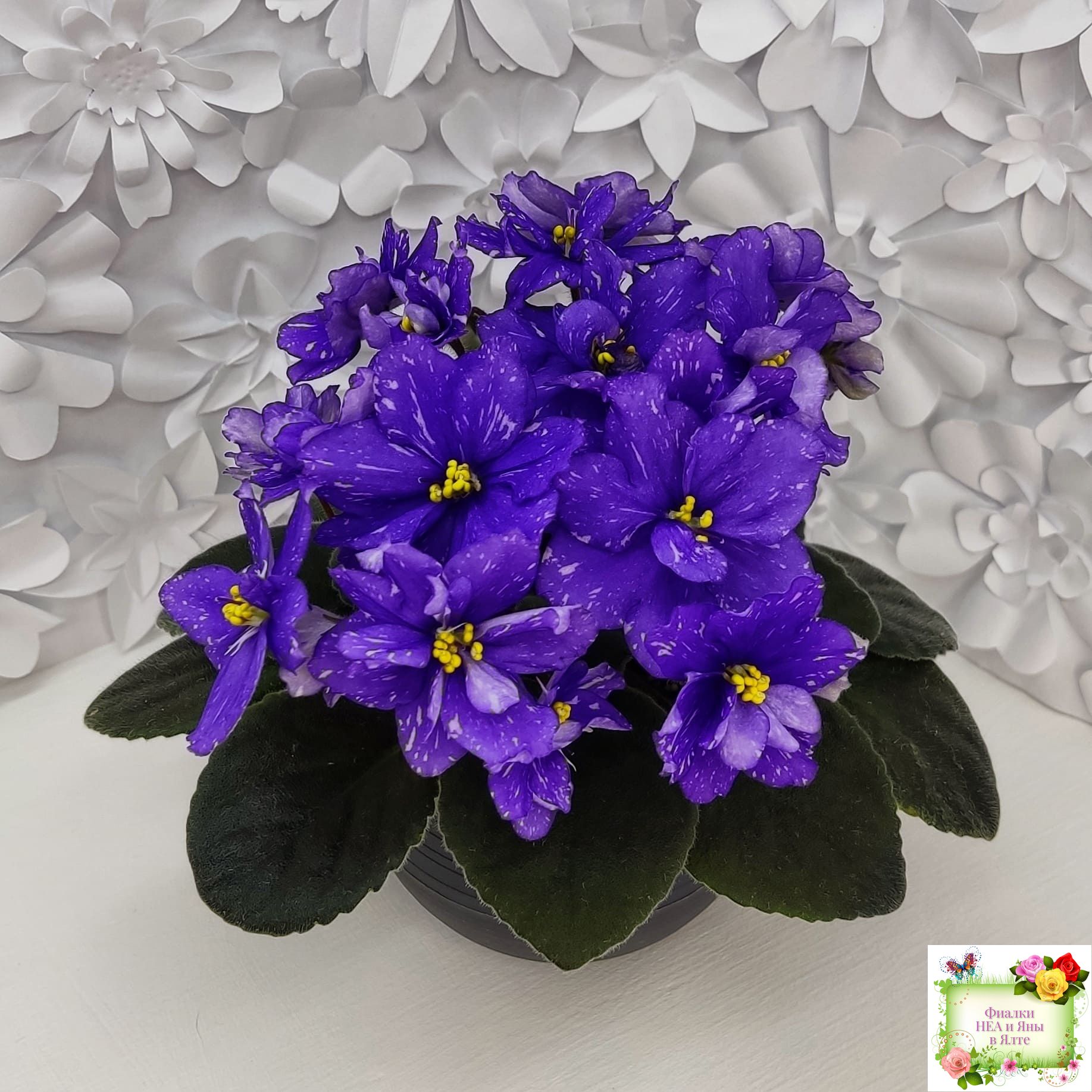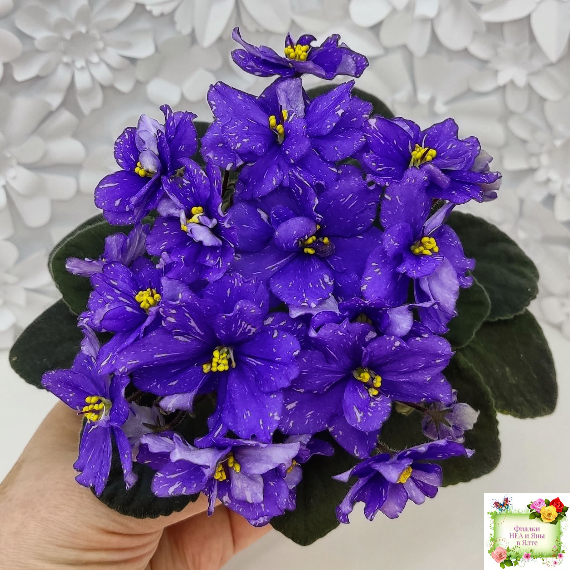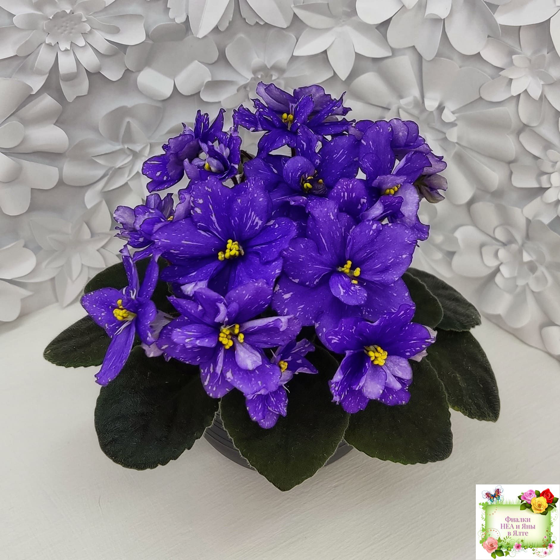 Крупные насыщенно-синие звезды, густо усыпанные контрастными белыми черточками фэнтези. Стеганая темно-зеленая листва с немного зазубренным краем. Полуминиатюра.