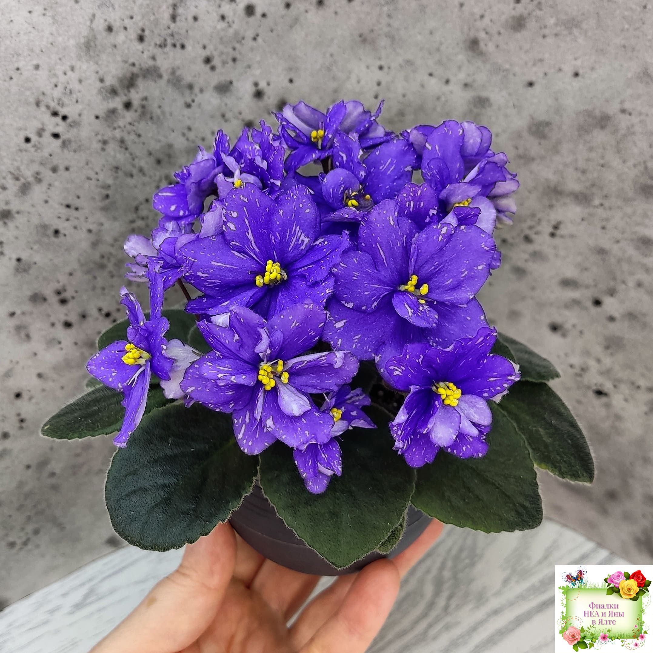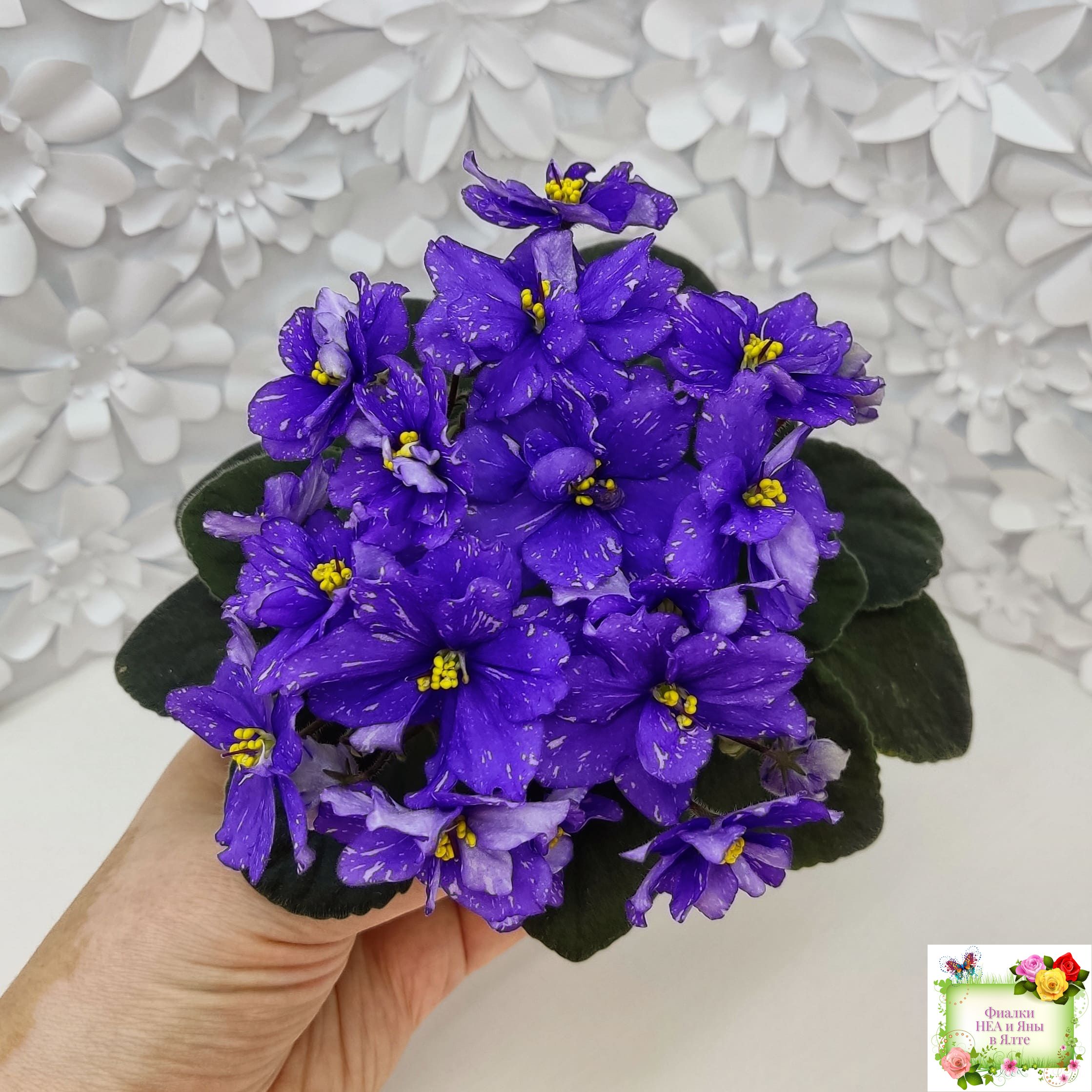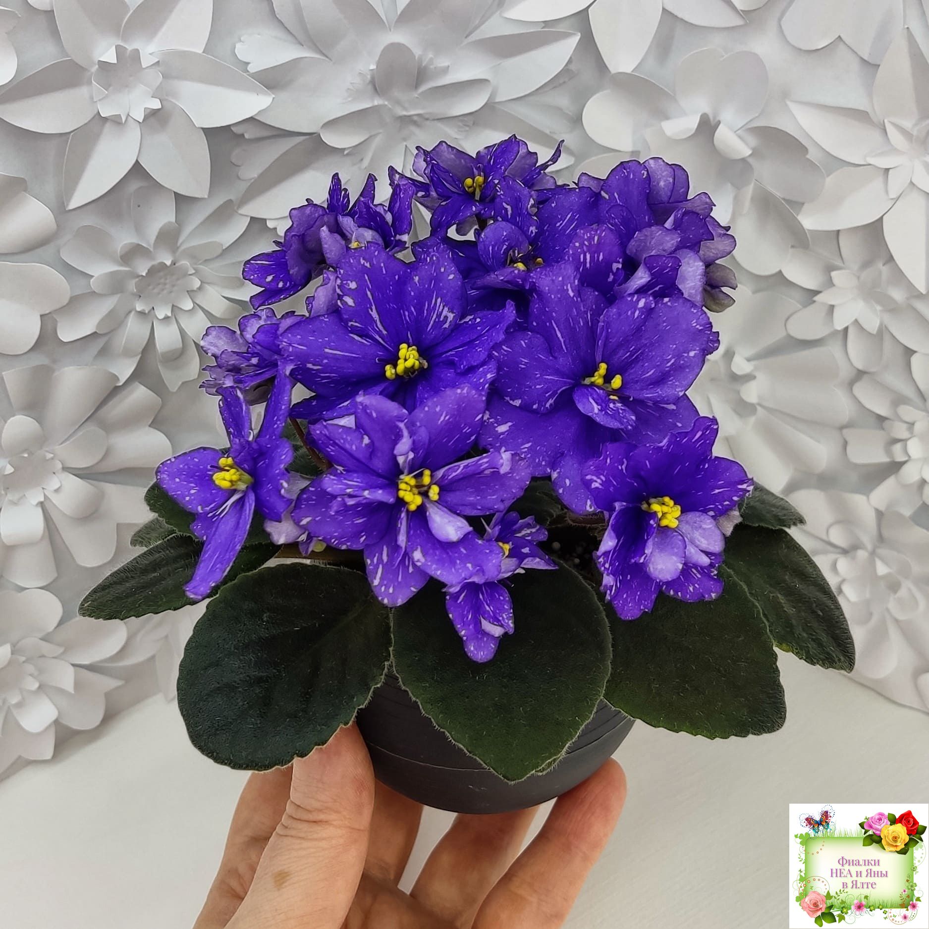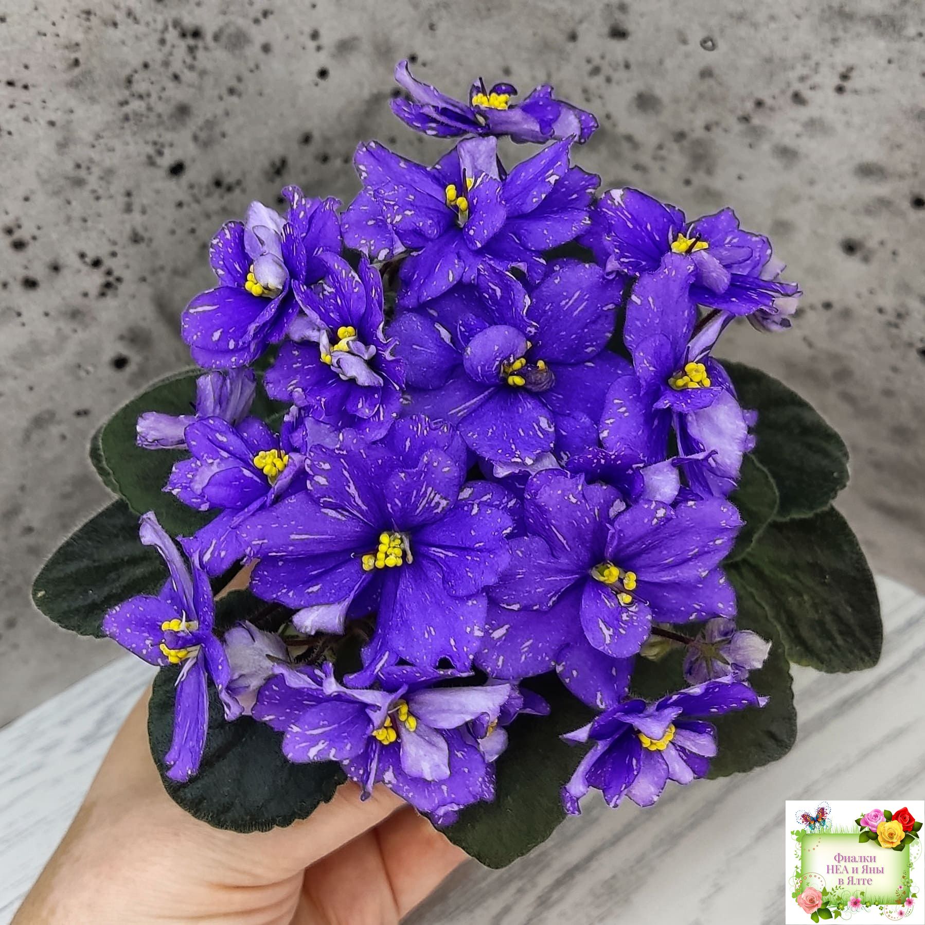 Крупные насыщенно-синие звезды, густо усыпанные контрастными белыми черточками фэнтези. Стеганая темно-зеленая листва с немного зазубренным краем. Полуминиатюра.