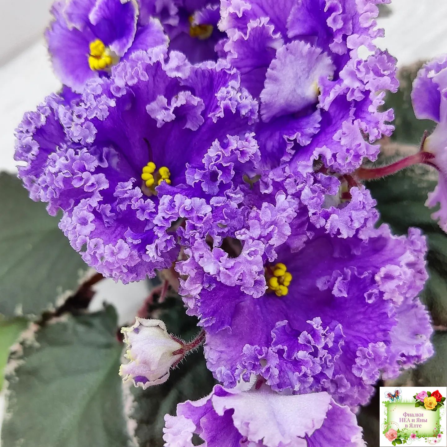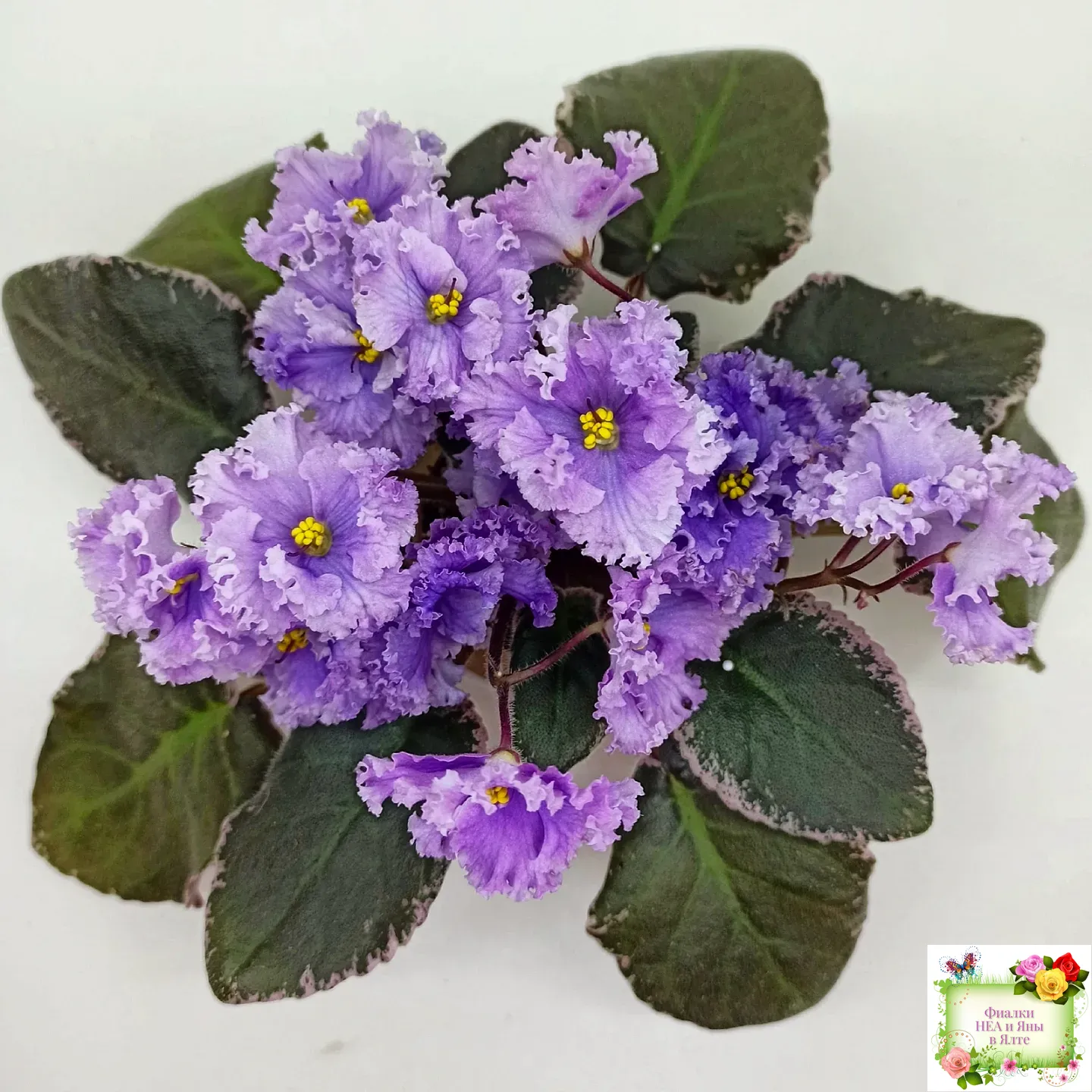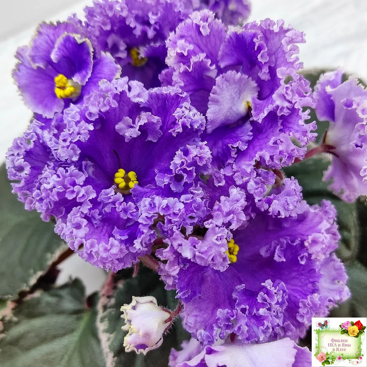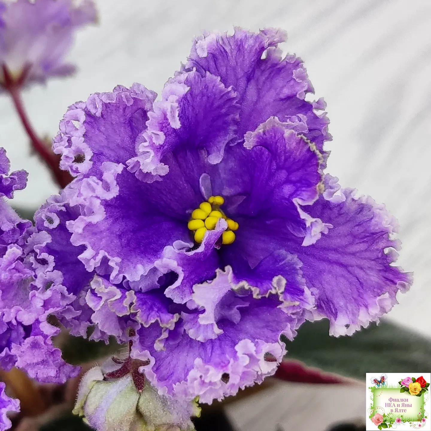 Крупные полумахровые цветы колокольчатой формы. Тёмно-фиолетово-пурпурный глазок переходит в сеточку, цвет постепенно высветляется к концам лепестков и заканчивается почти белой гофрированной оборкой.