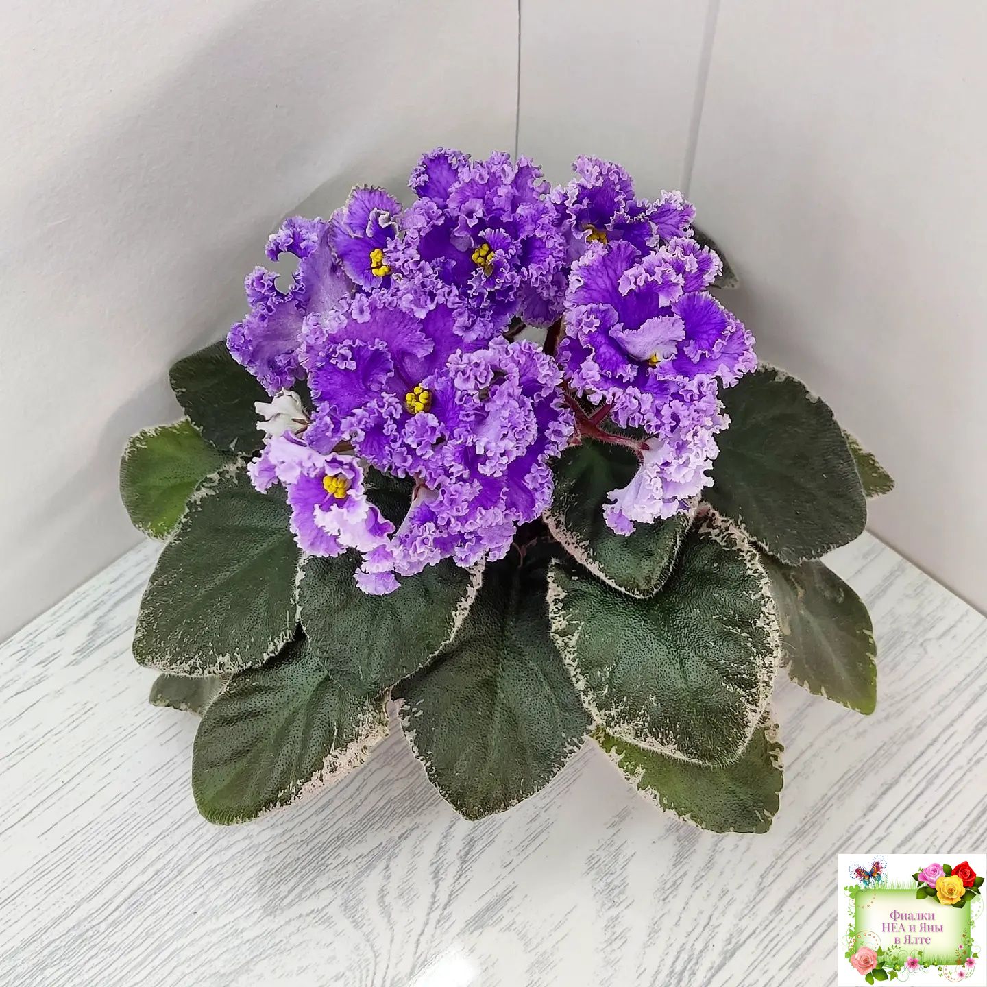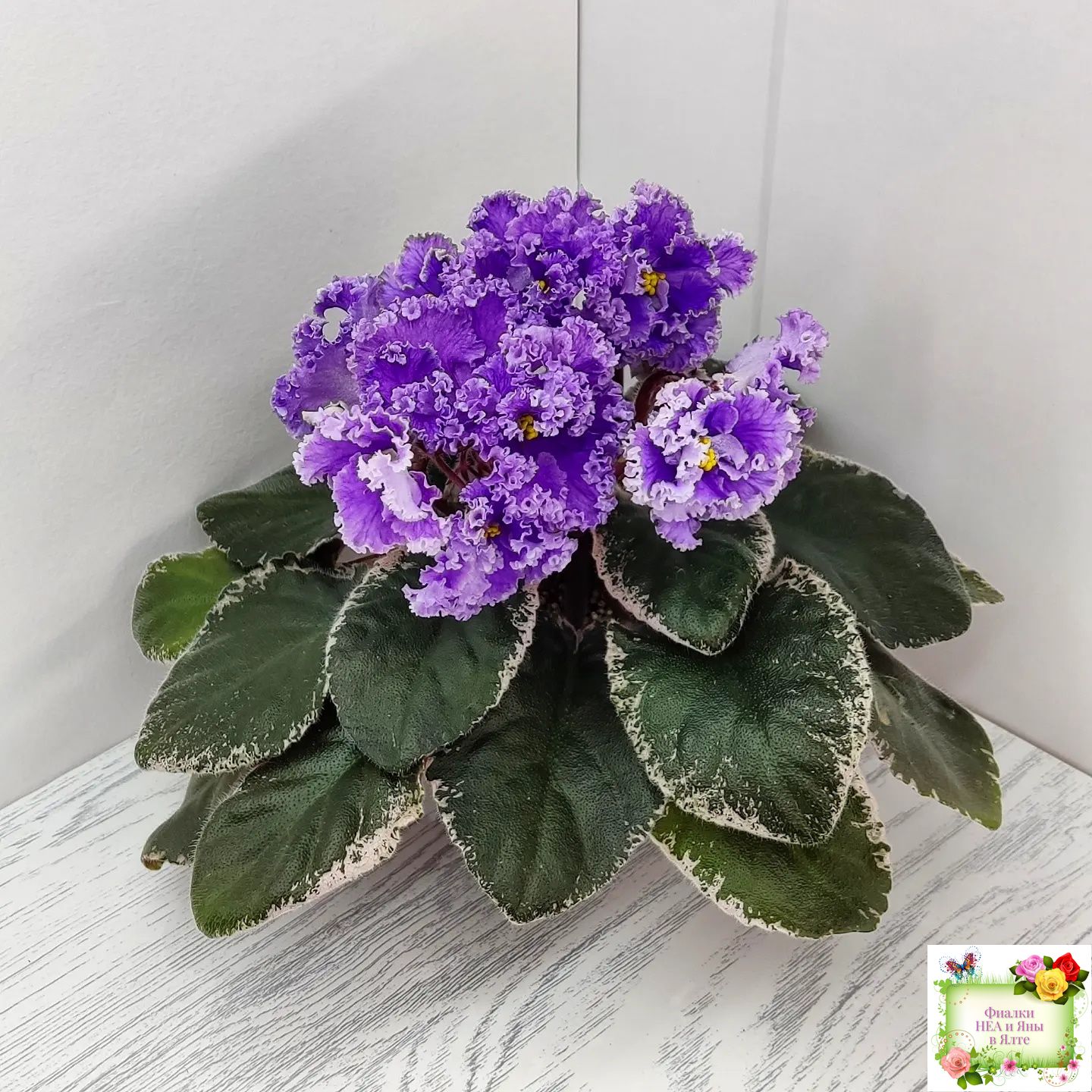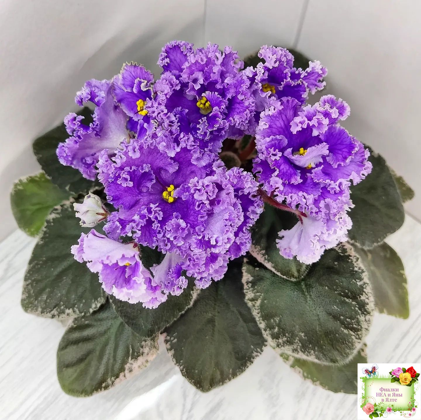 Крупные полумахровые цветы колокольчатой формы. Тёмно-фиолетово-пурпурный глазок переходит в сеточку, цвет постепенно высветляется к концам лепестков и заканчивается почти белой гофрированной оборкой.