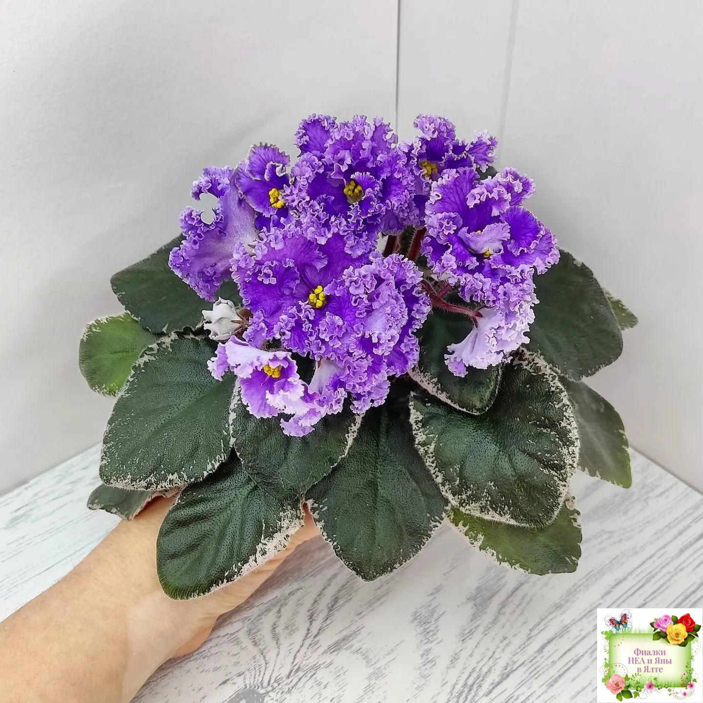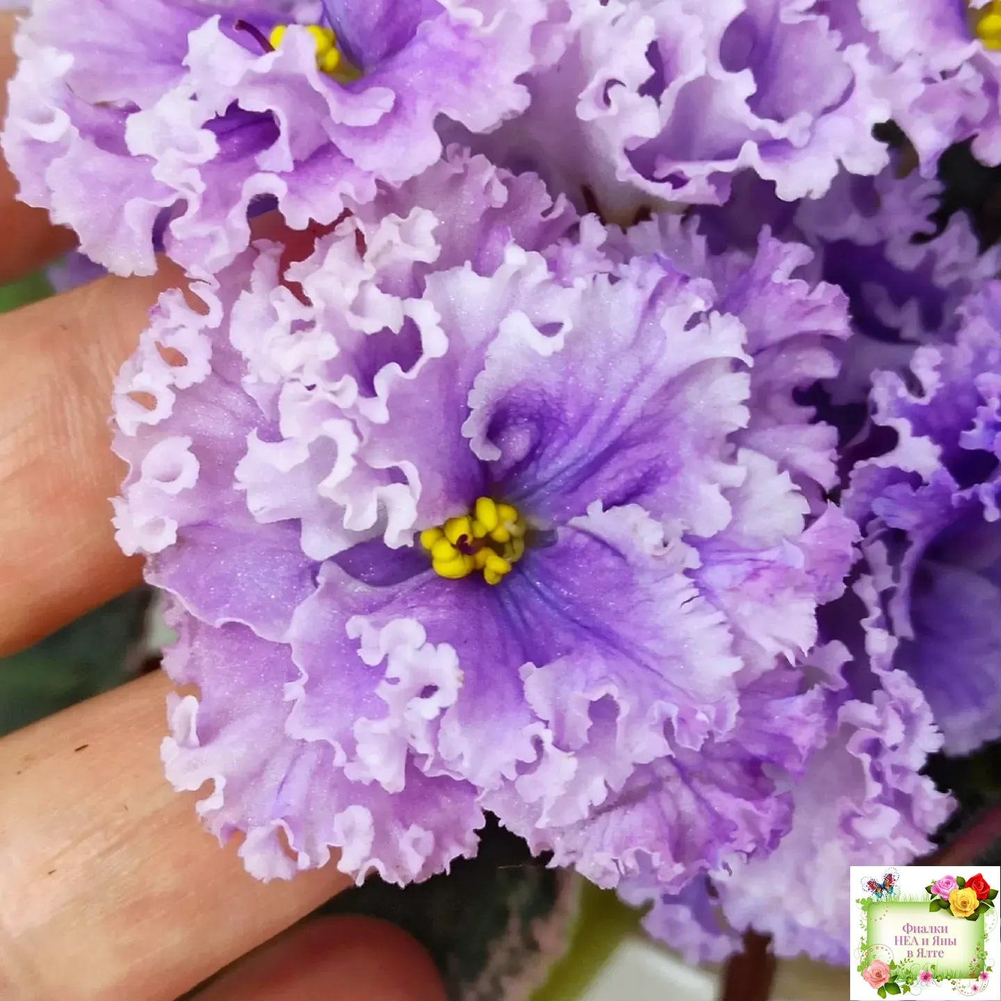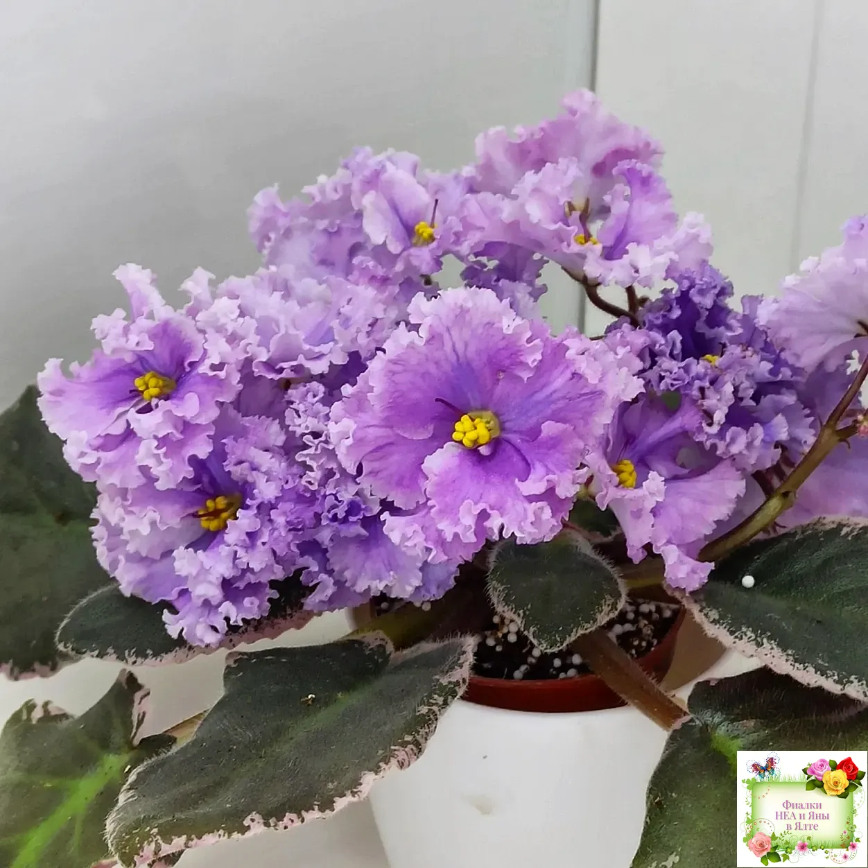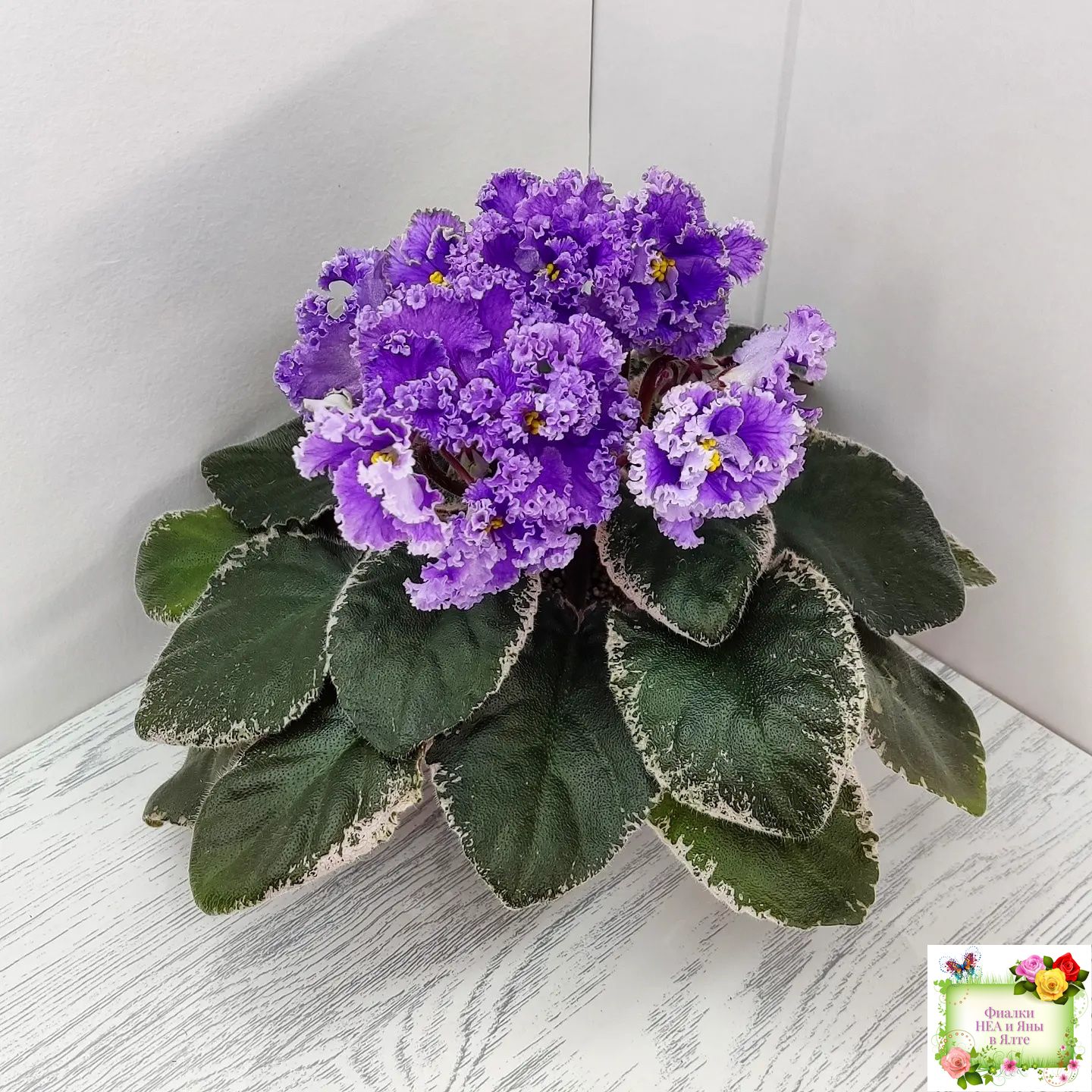 Крупные полумахровые цветы колокольчатой формы. Тёмно-фиолетово-пурпурный глазок переходит в сеточку, цвет постепенно высветляется к концам лепестков и заканчивается почти белой гофрированной оборкой.