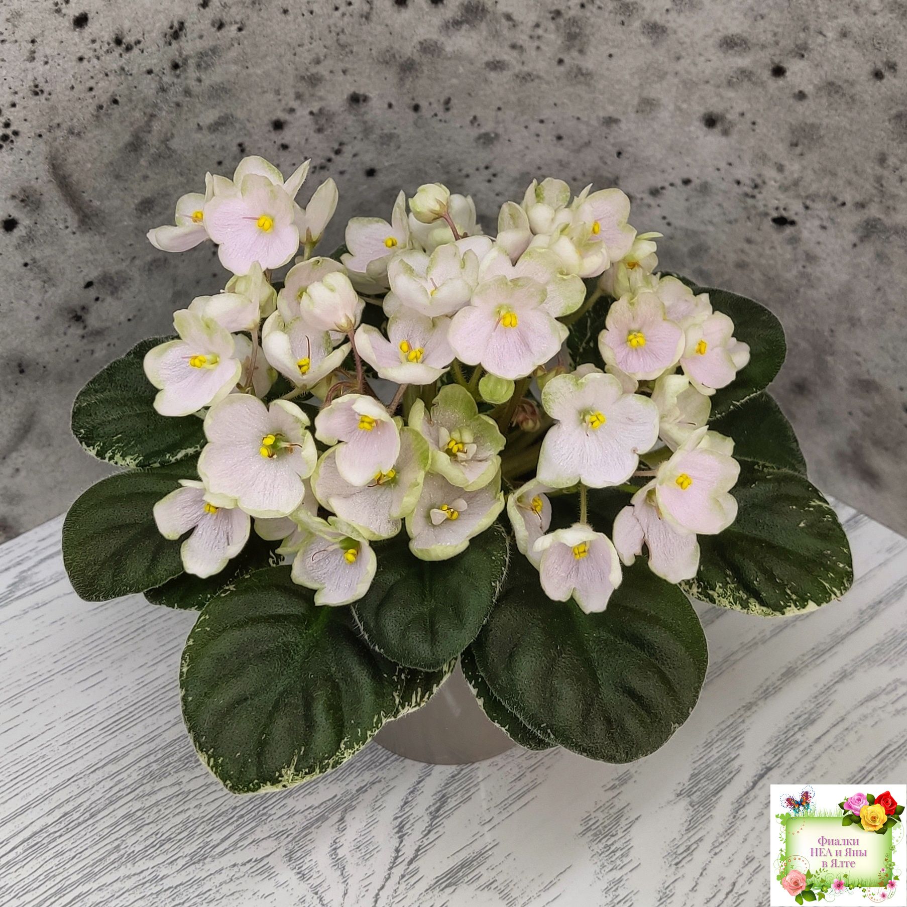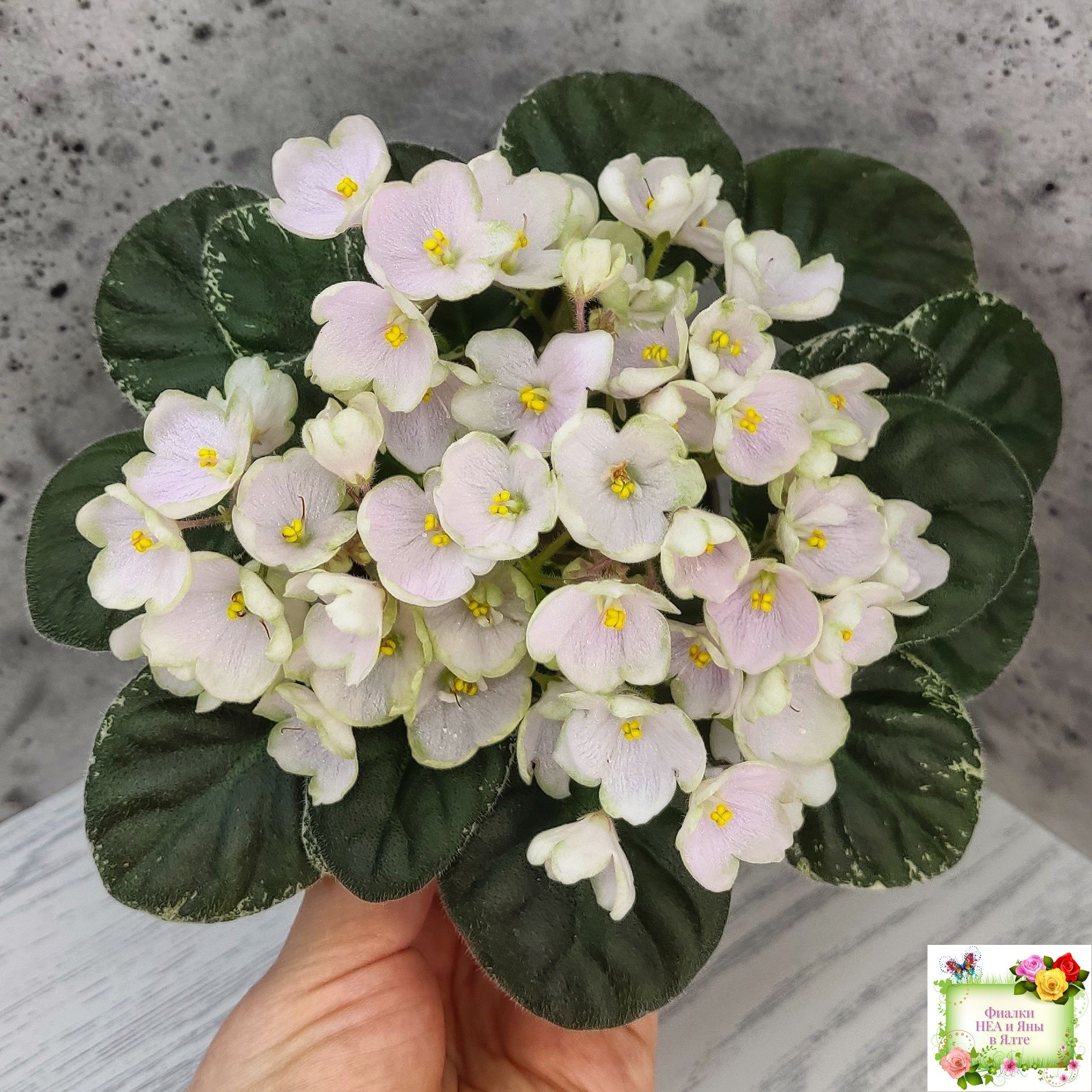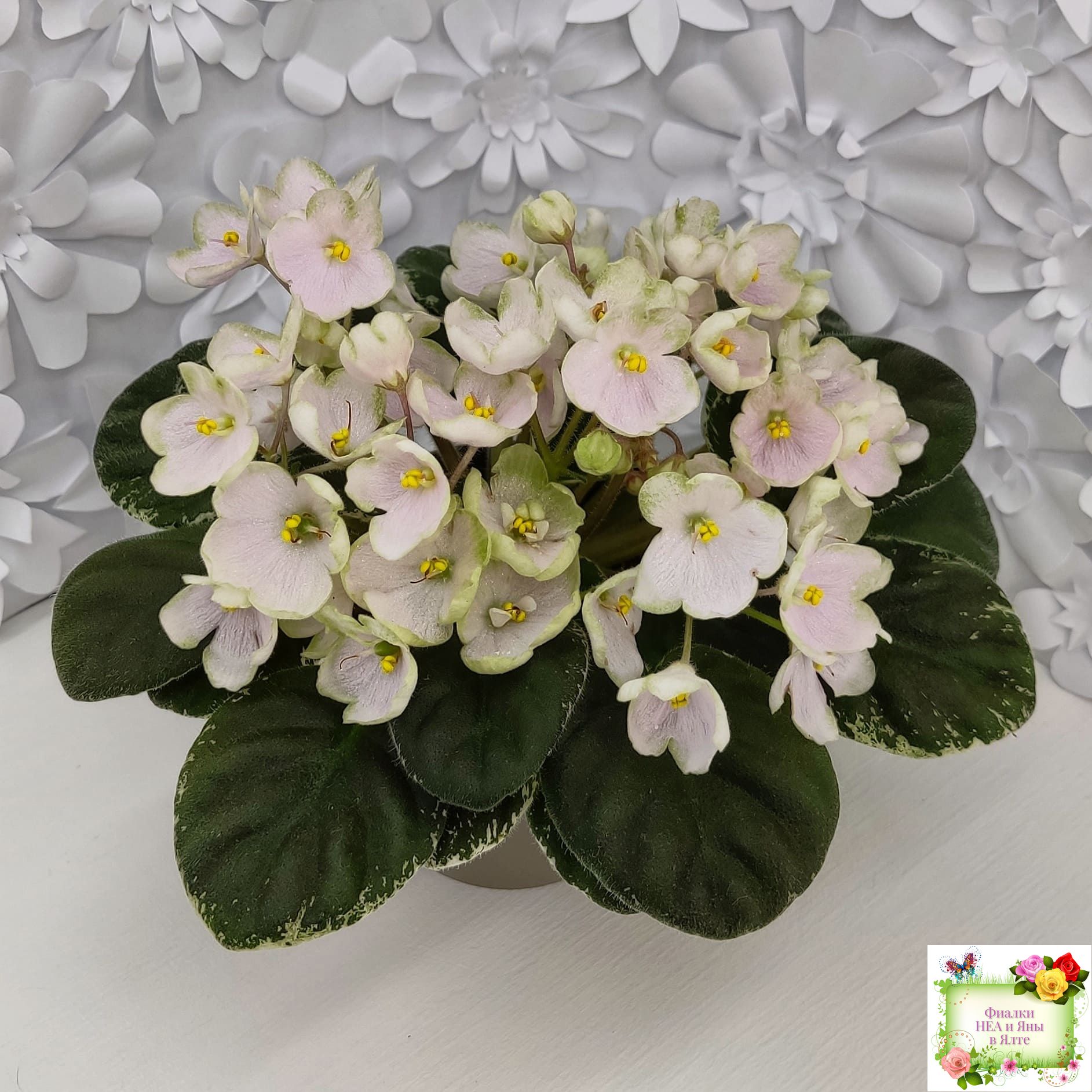 Простой колокольчик среднего размера нежно розовато-белого тона с вариабельной зеленоватой каймой. Округлая простая средне-зеленая листва с белой окаймляющей пестролистностью. Полумини. (Описание Маргариты Нестеровой)