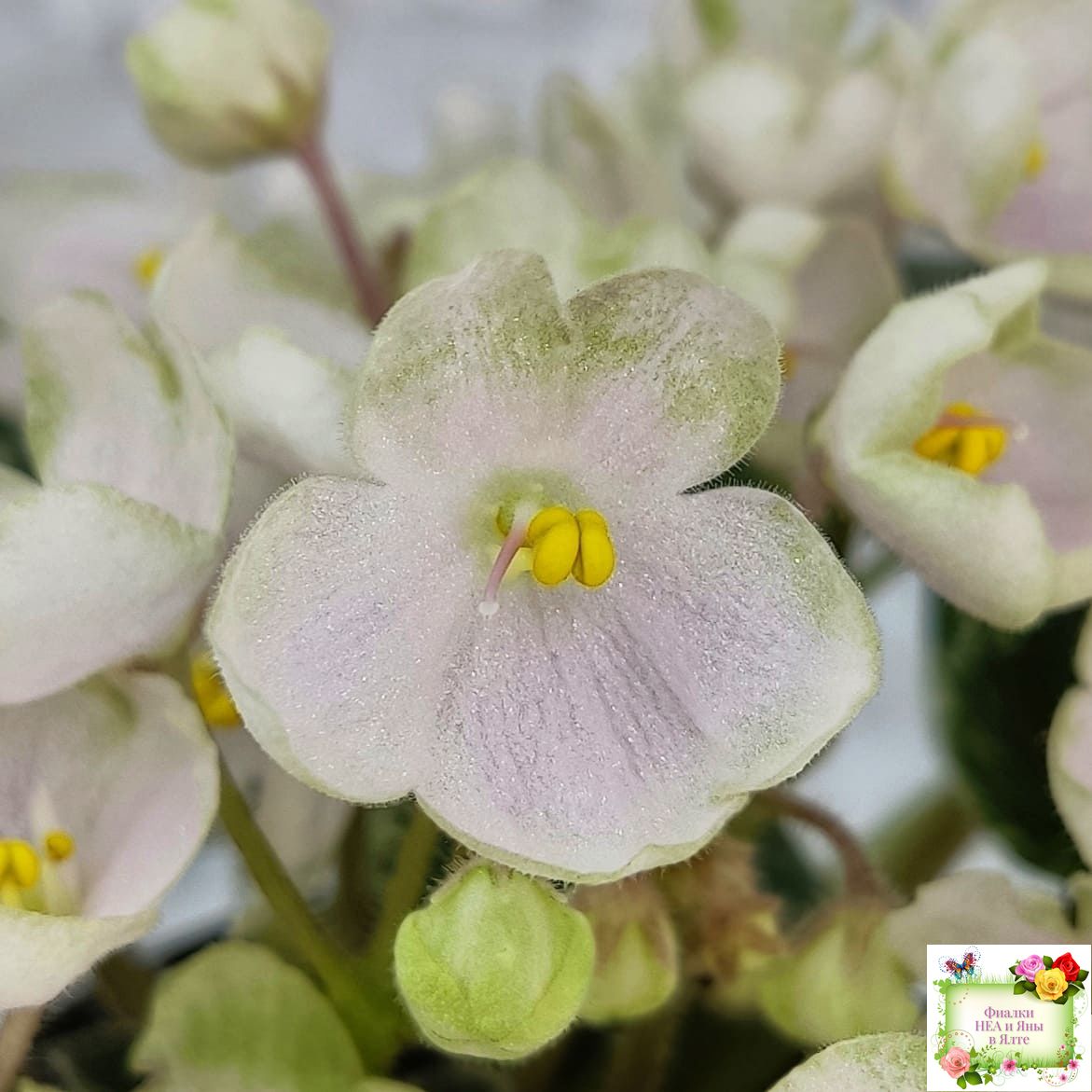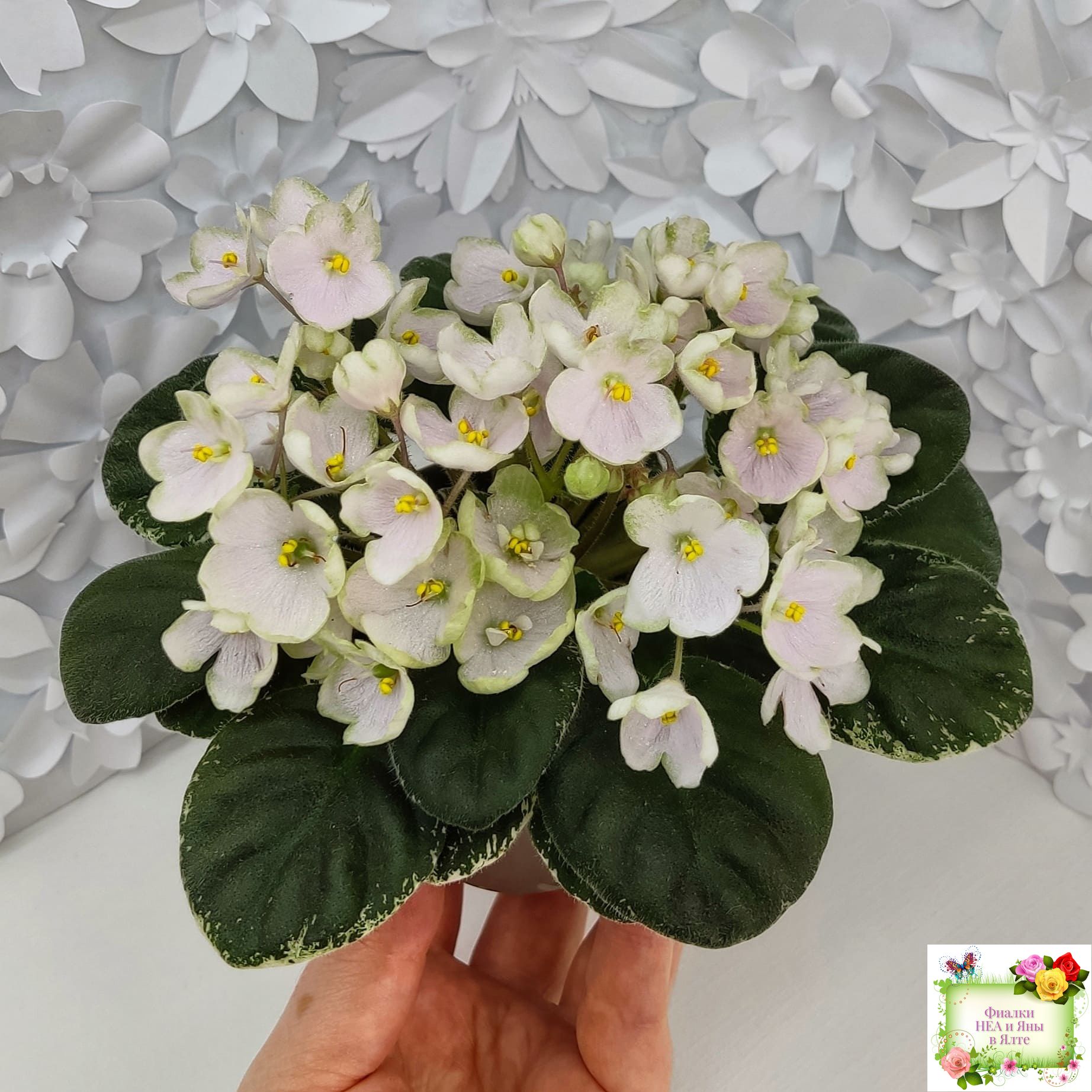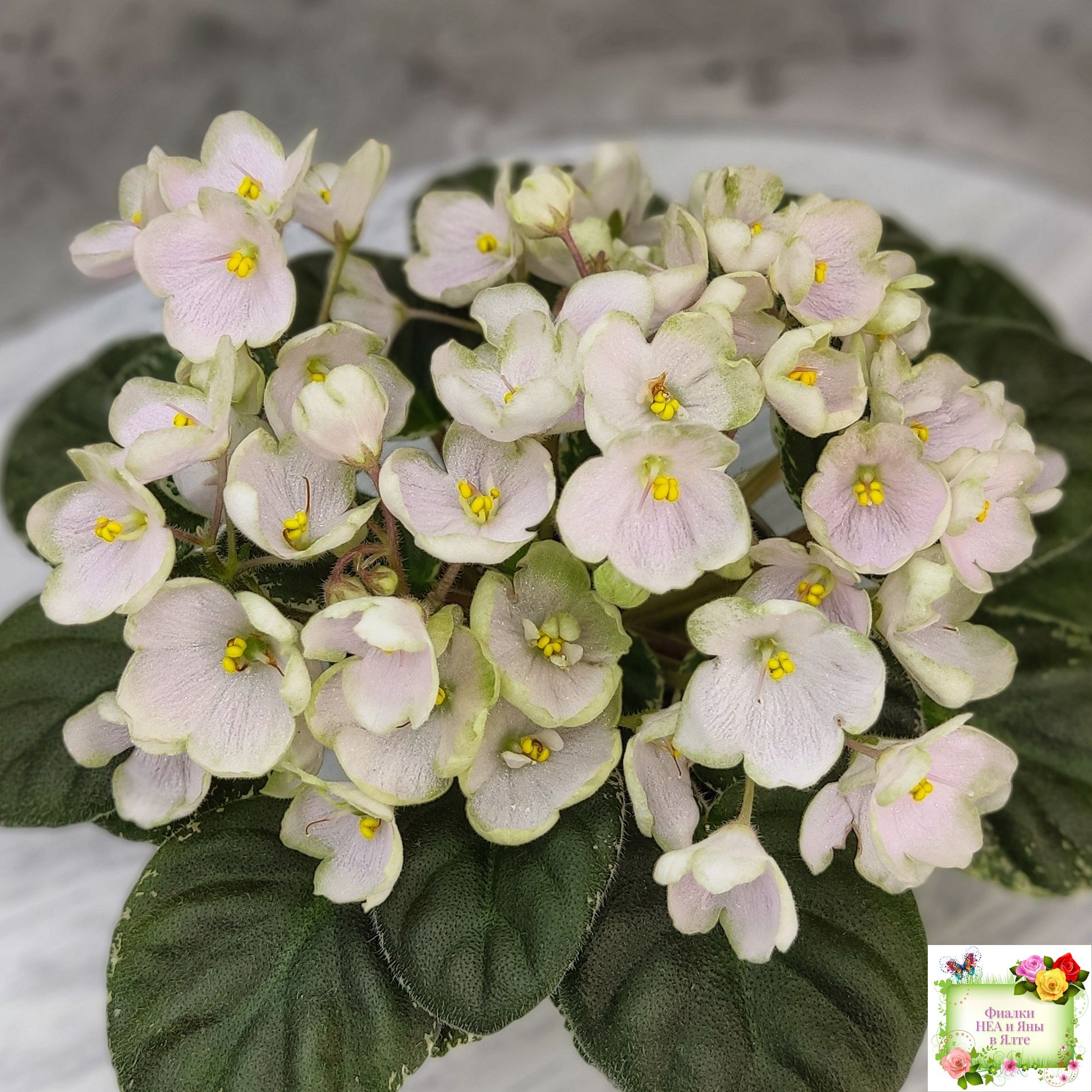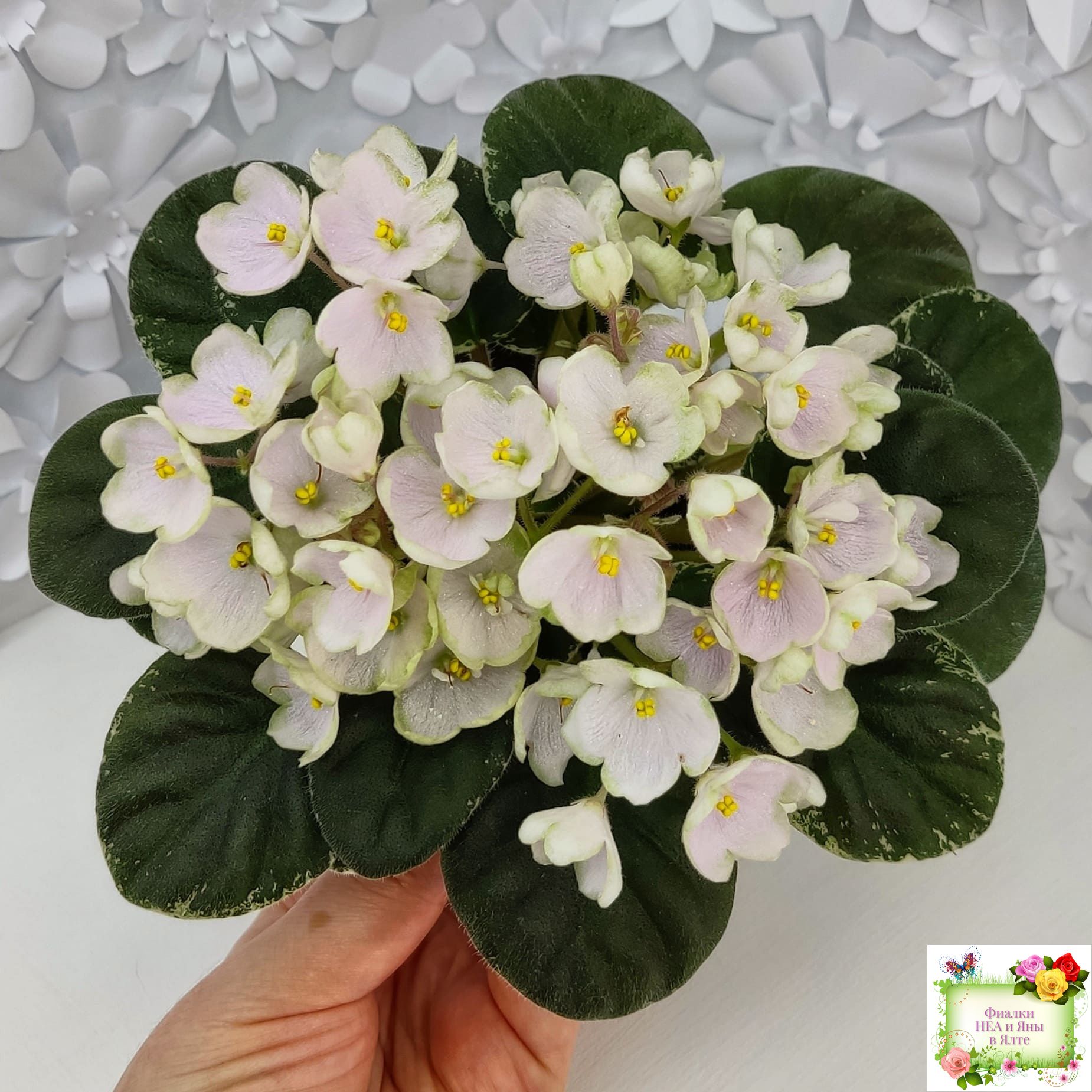 Простой колокольчик среднего размера нежно розовато-белого тона с вариабельной зеленоватой каймой. Округлая простая средне-зеленая листва с белой окаймляющей пестролистностью. Полумини. (Описание Маргариты Нестеровой)