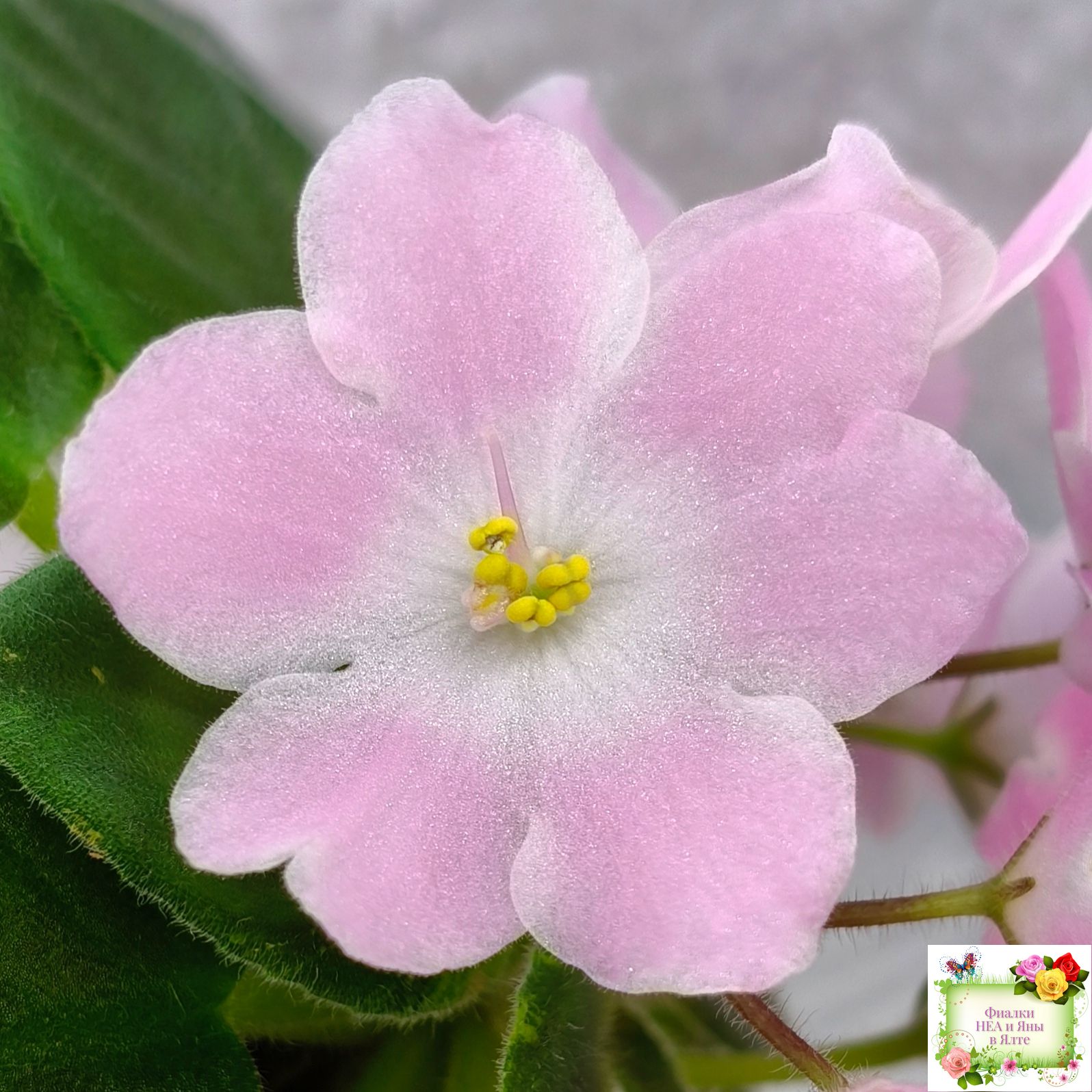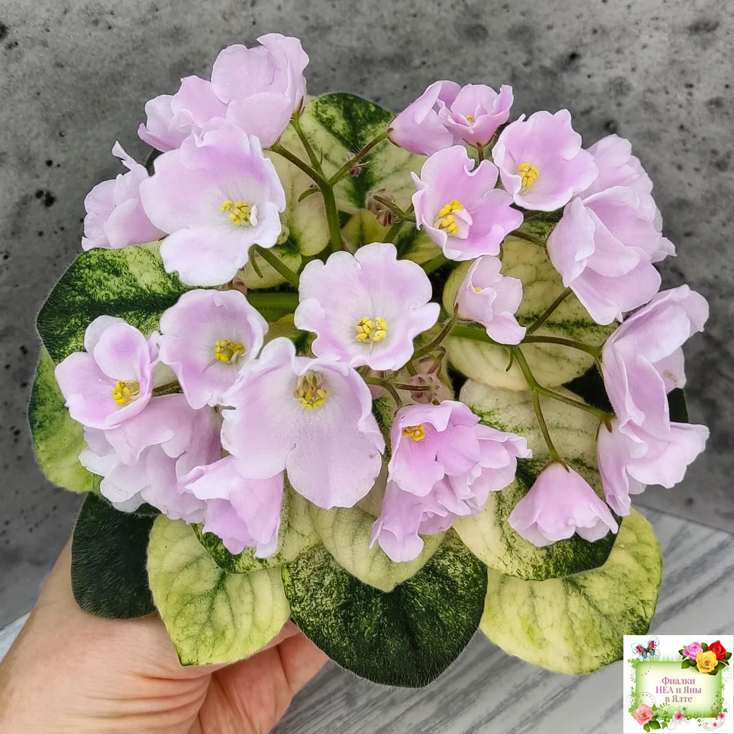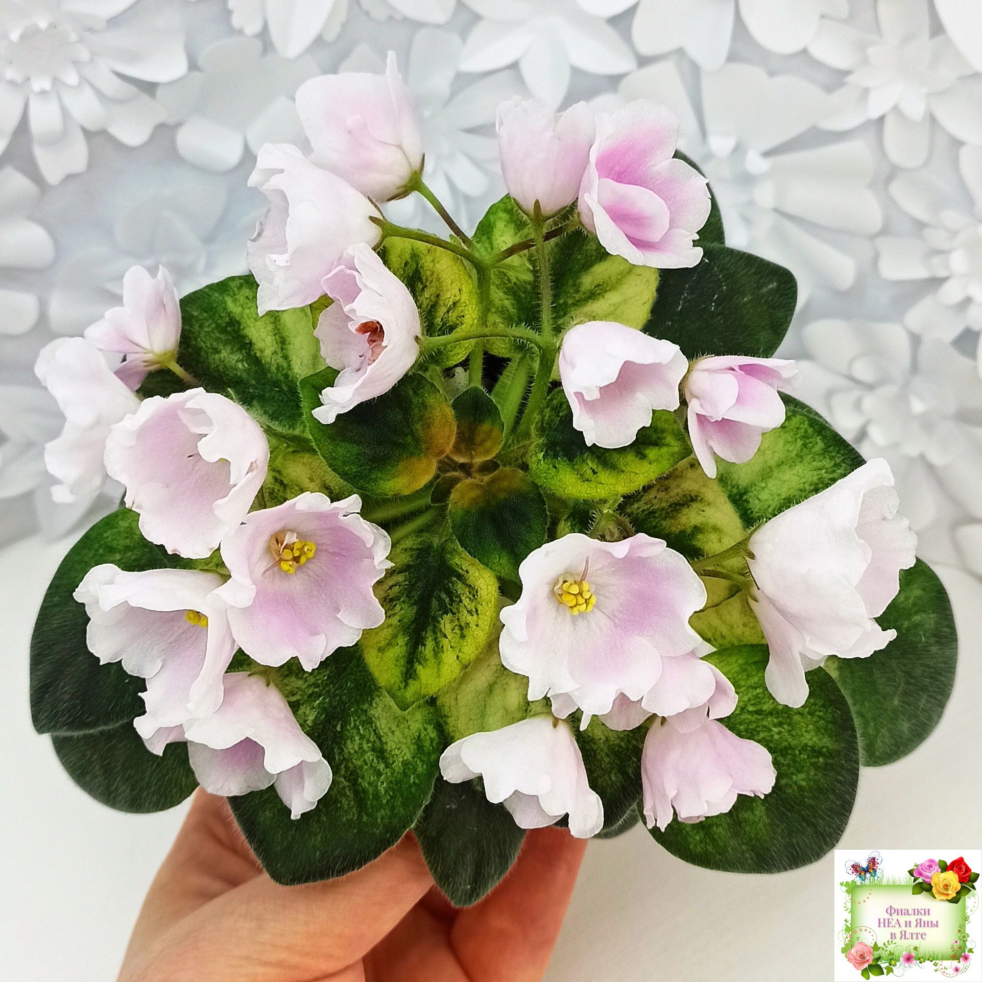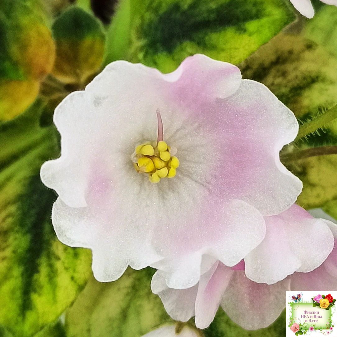 Очень крупные нежно-розовые звёзды с белым глазком. Компактная розетка заостренных листьев с желто-зеленой кроновой пестролистностью. Полумини. 2014 г.