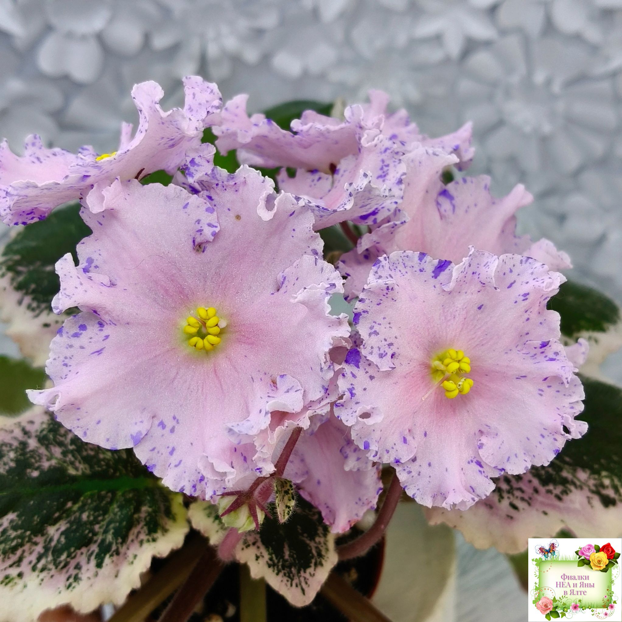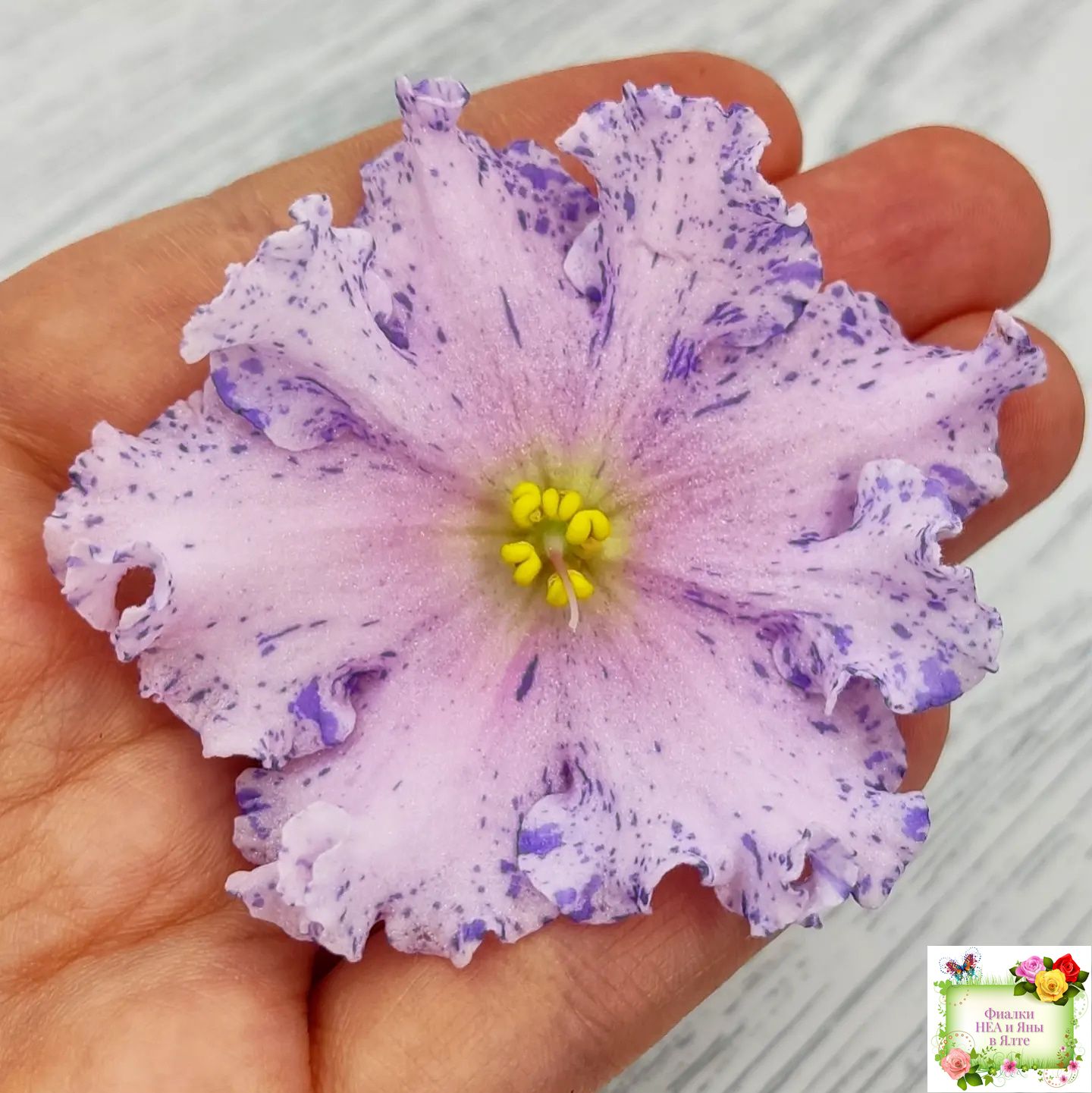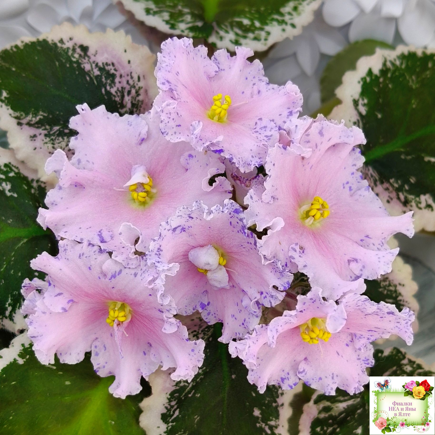 Цветы: Крупные простые и полумахровые гофрированные розовые звезды с синим фэнтези и жёлтым центром.