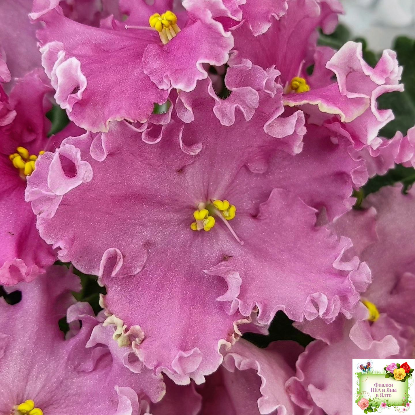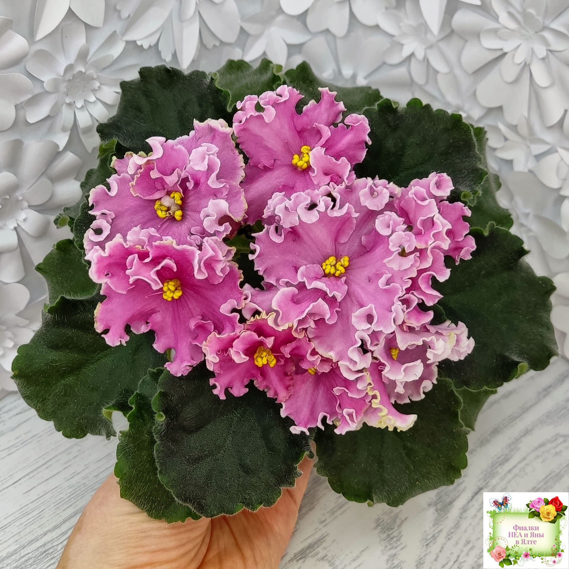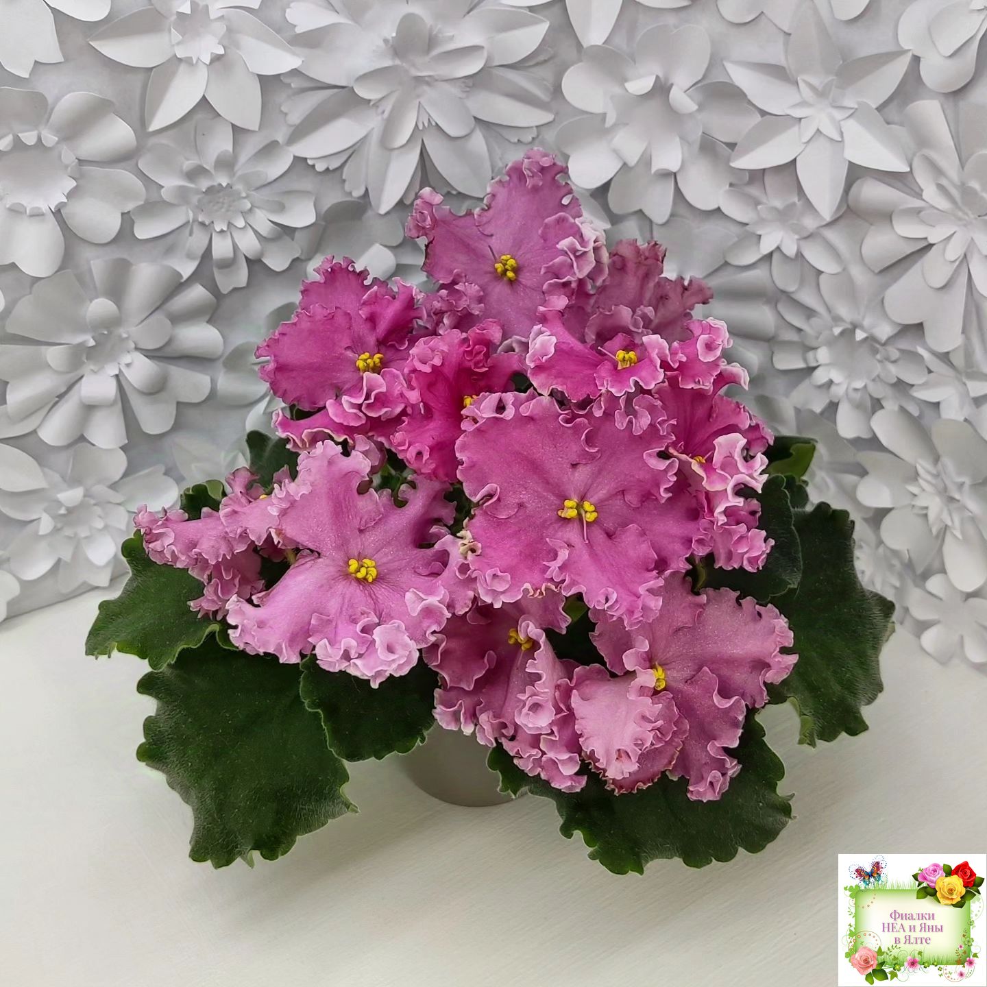Очень крупные коралловорозовые цветы с белой каймой, очень плотной фактуры. Розетка из фестончатых светло-зелёных слегка удлиненных листьев.