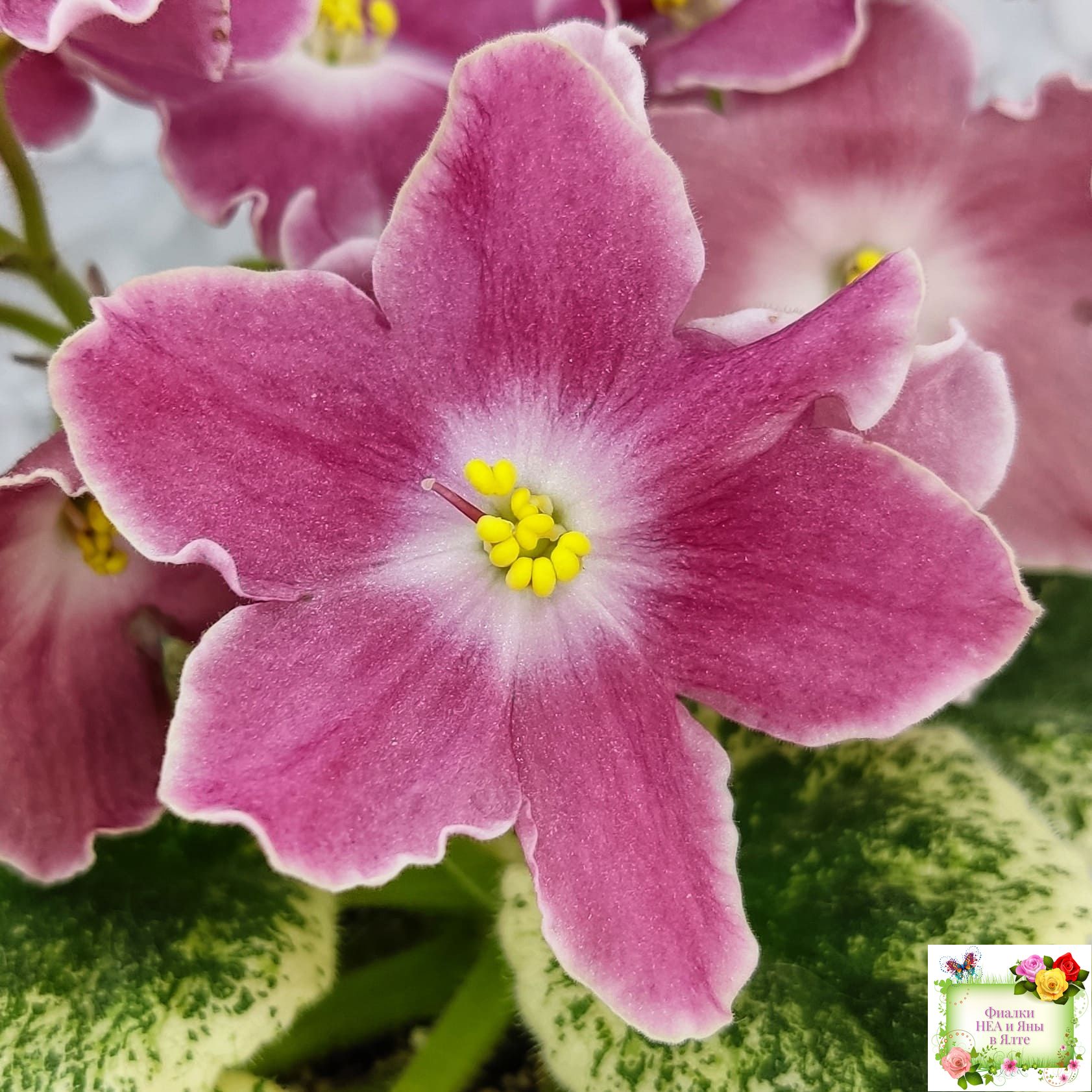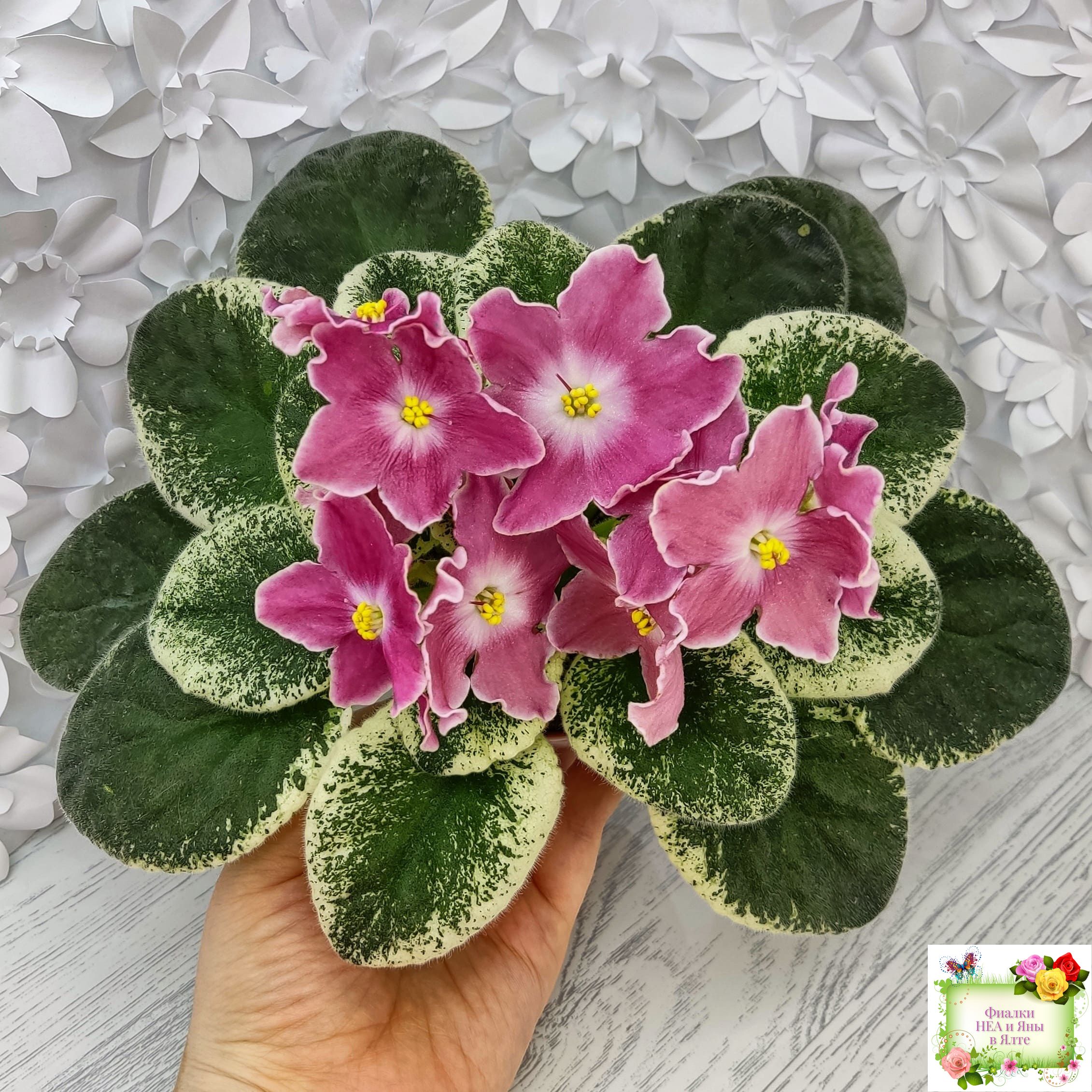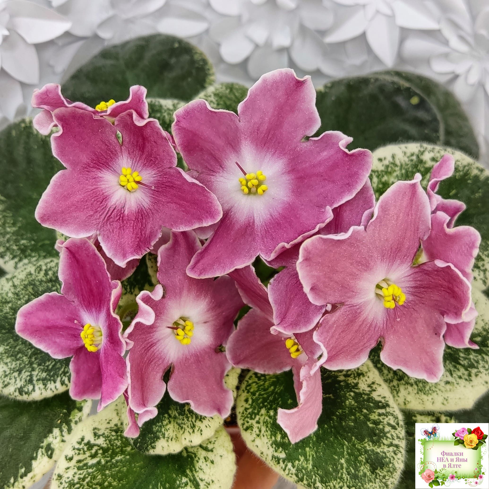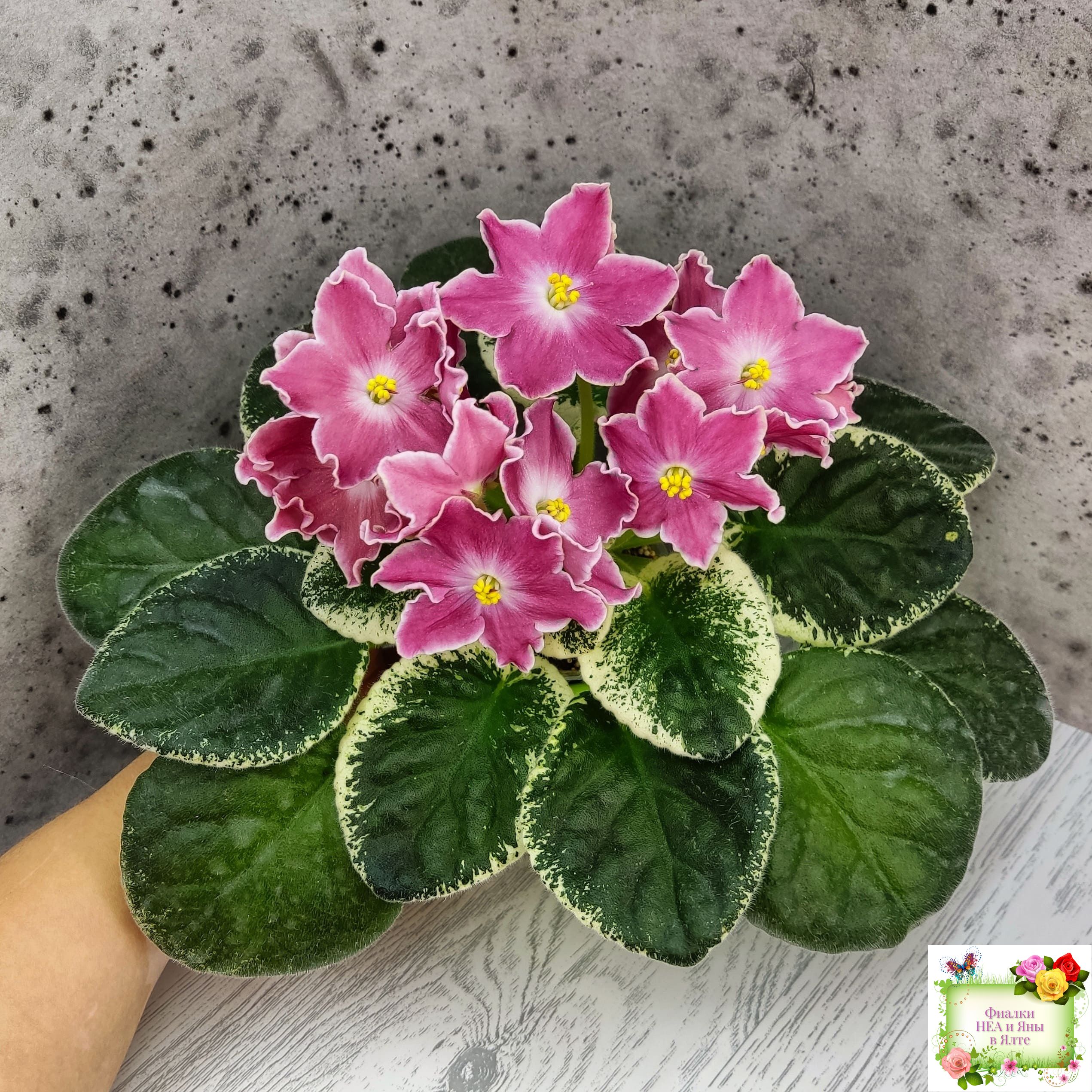 Крупные простые белые звёзды с яркими лососевыми напечатками. Ровная аккуратная пестролистная розетка. Яркий эффектный сорт, как и все Наташки!!!