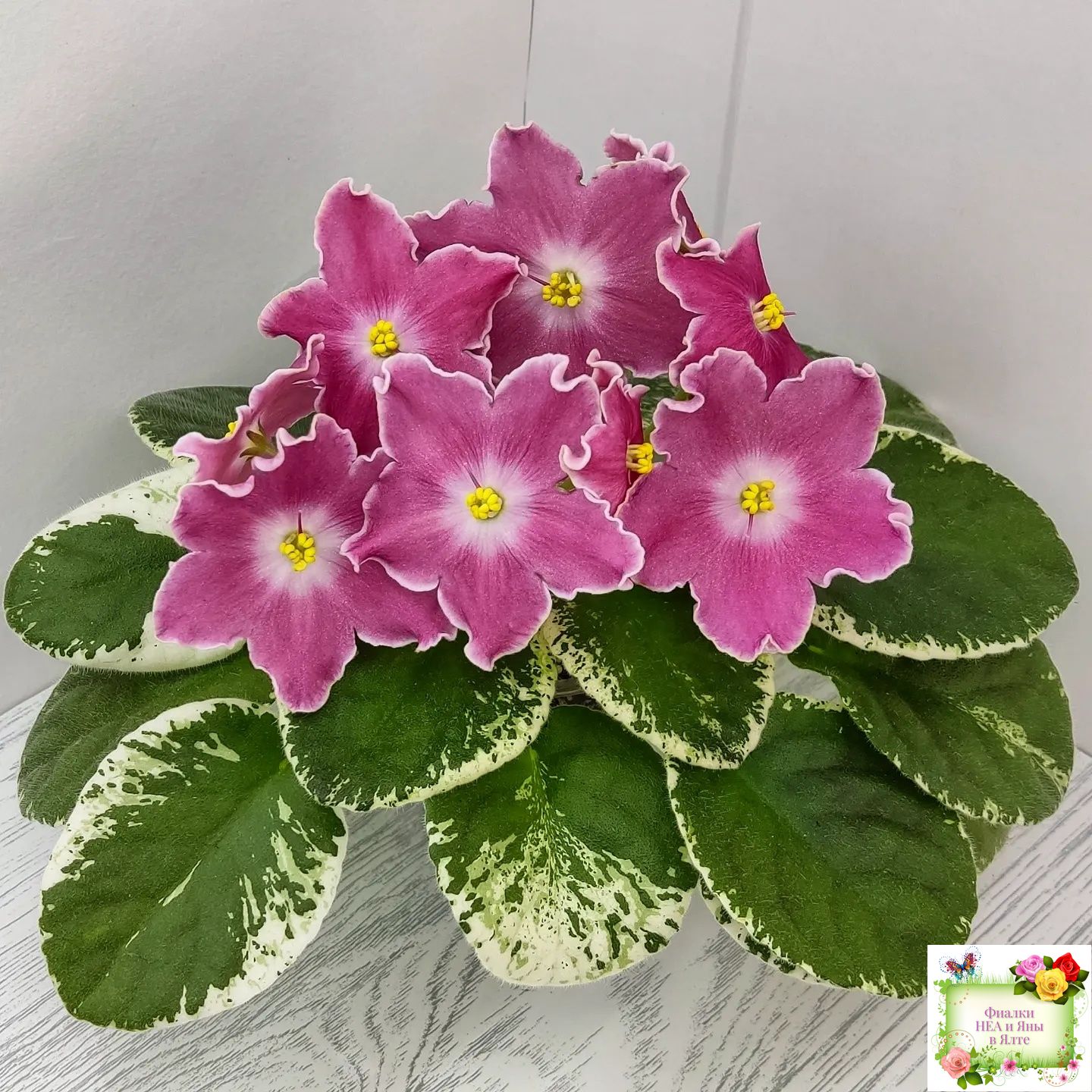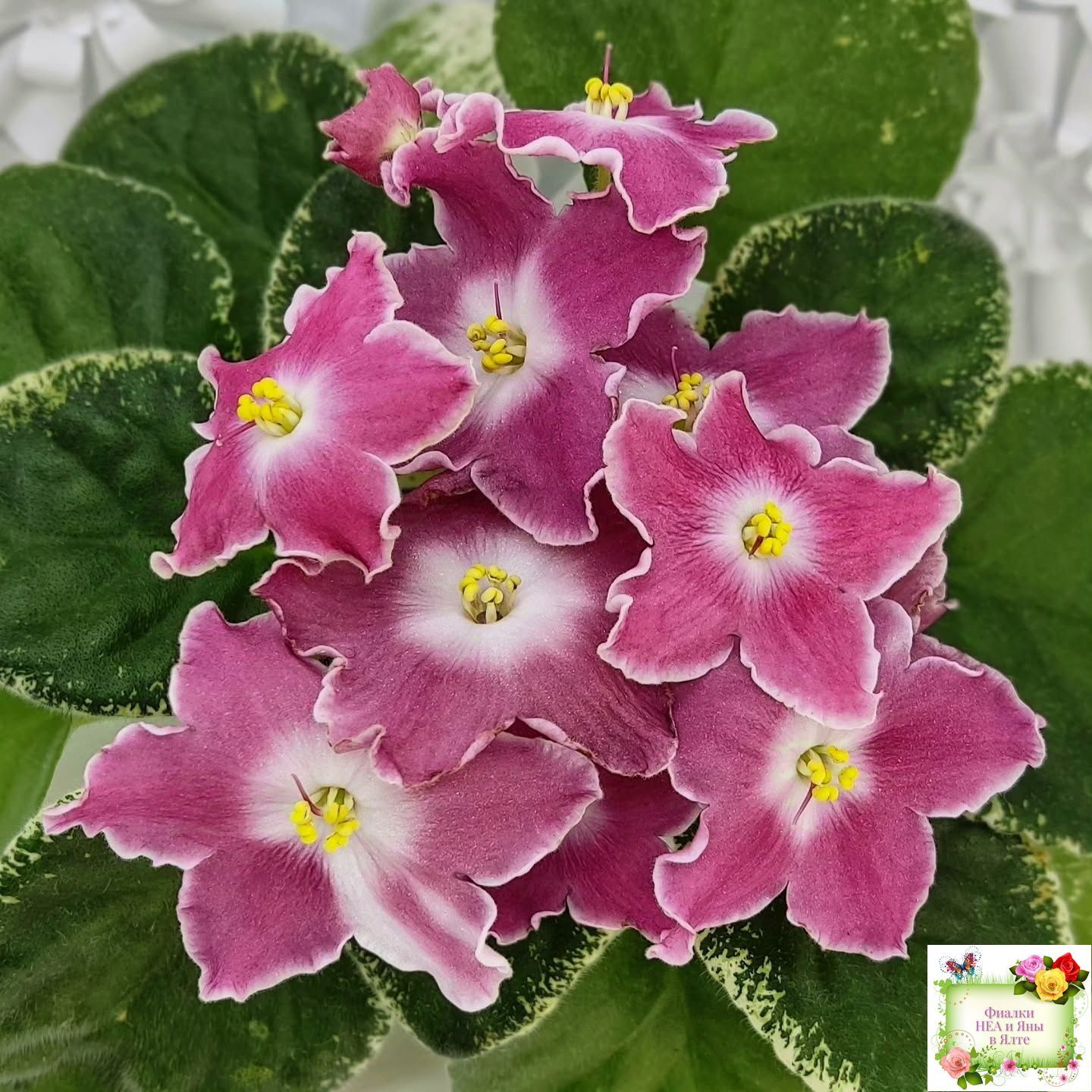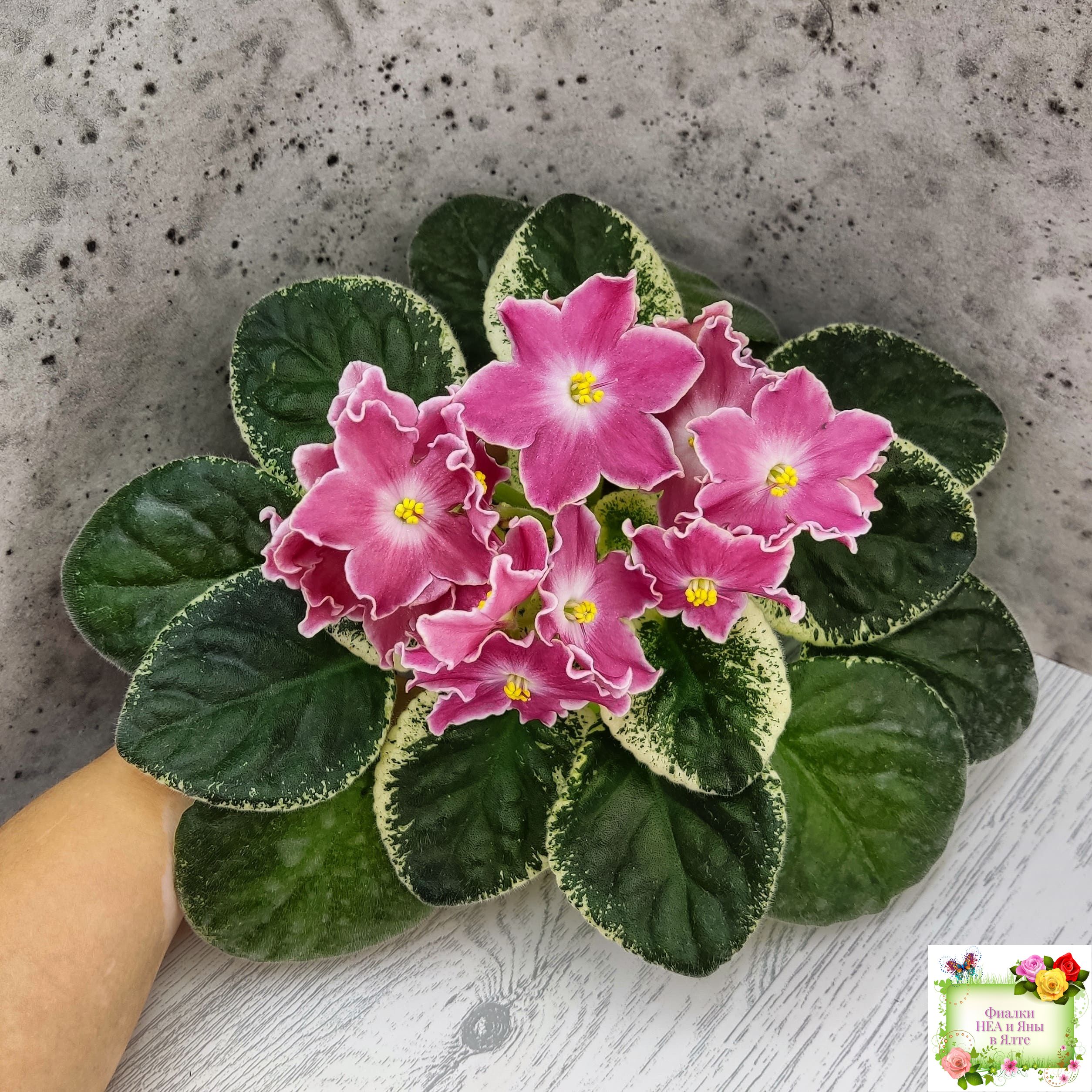 Крупные простые белые звёзды с яркими лососевыми напечатками. Ровная аккуратная пестролистная розетка. Яркий эффектный сорт, как и все Наташки!!!