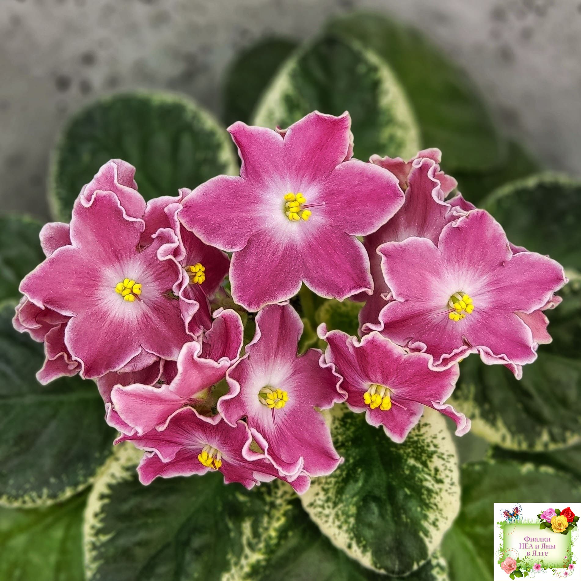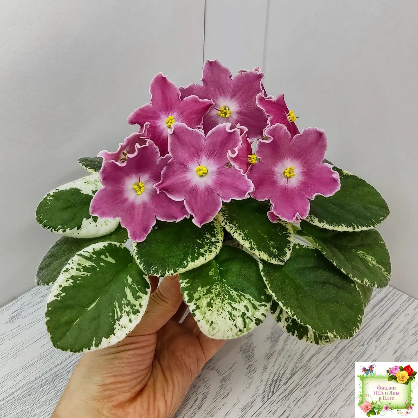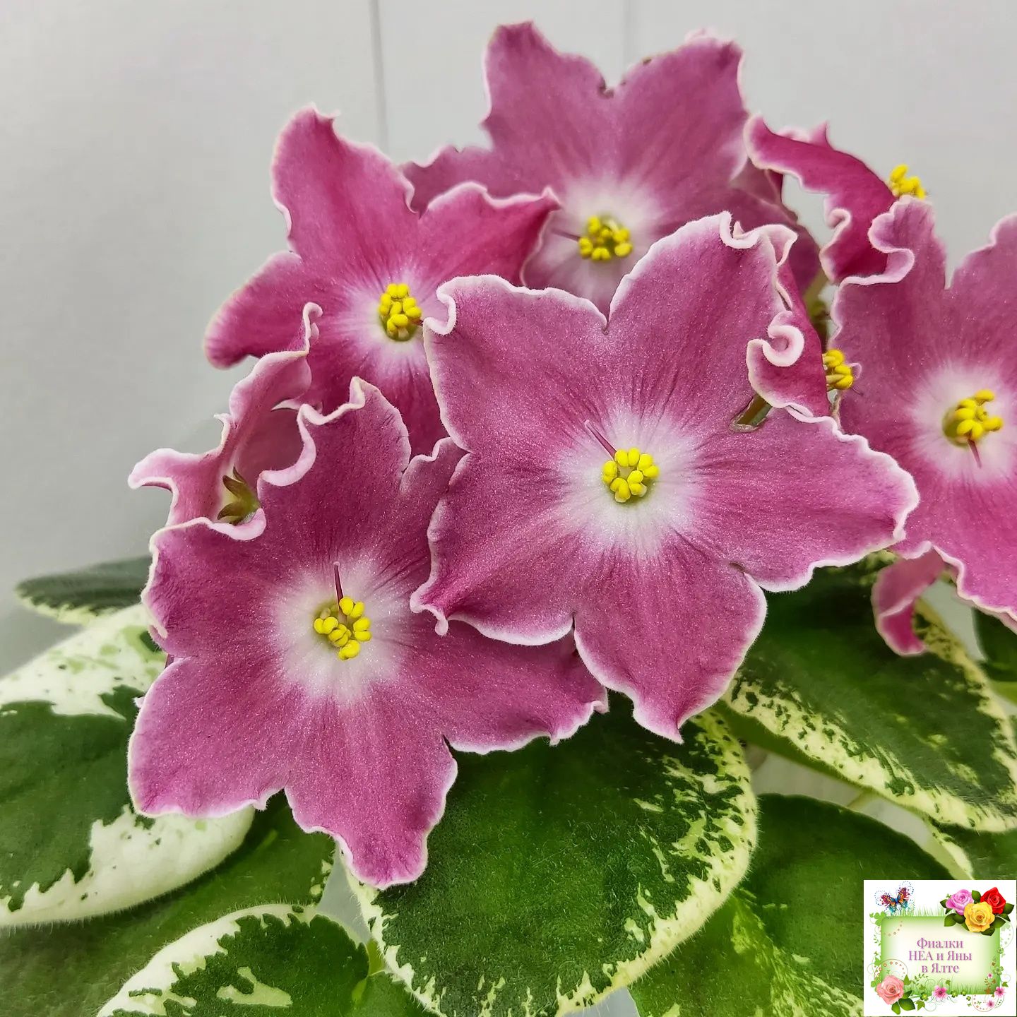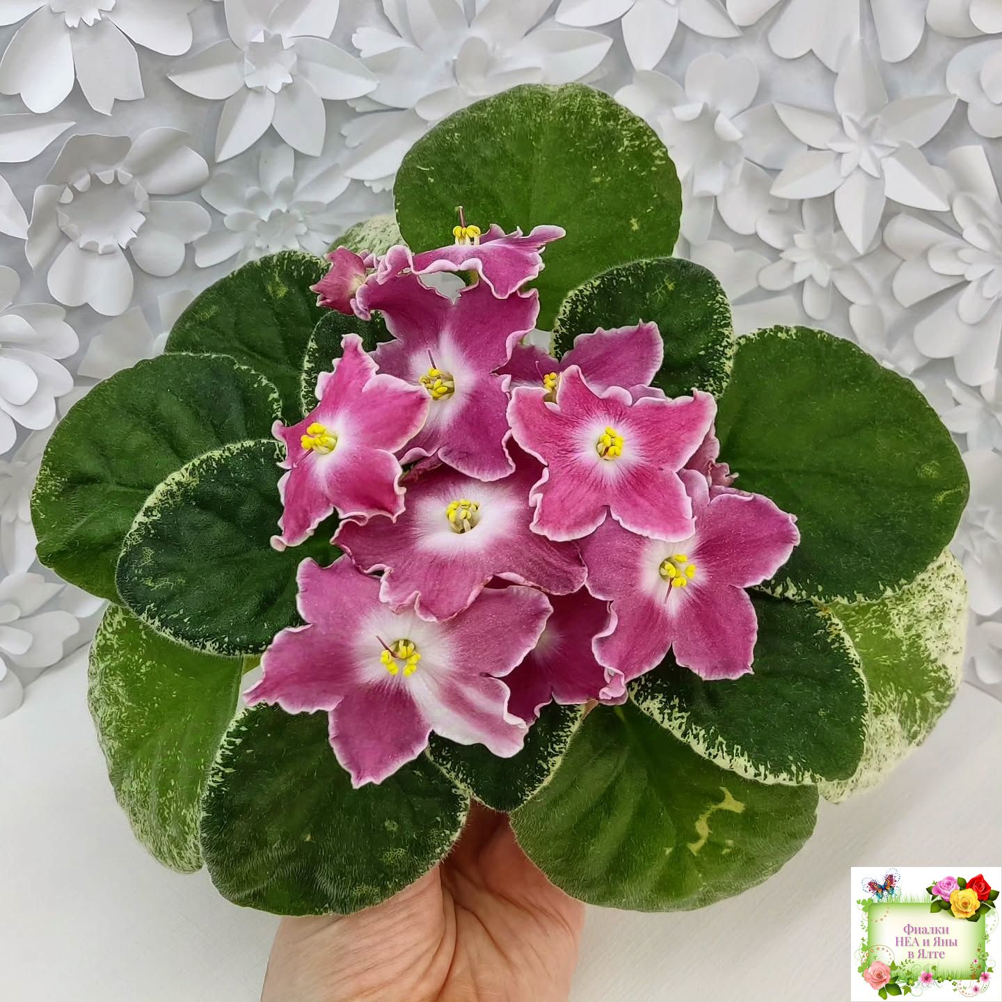 Крупные простые белые звёзды с яркими лососевыми напечатками. Ровная аккуратная пестролистная розетка. Яркий эффектный сорт, как и все Наташки!!!