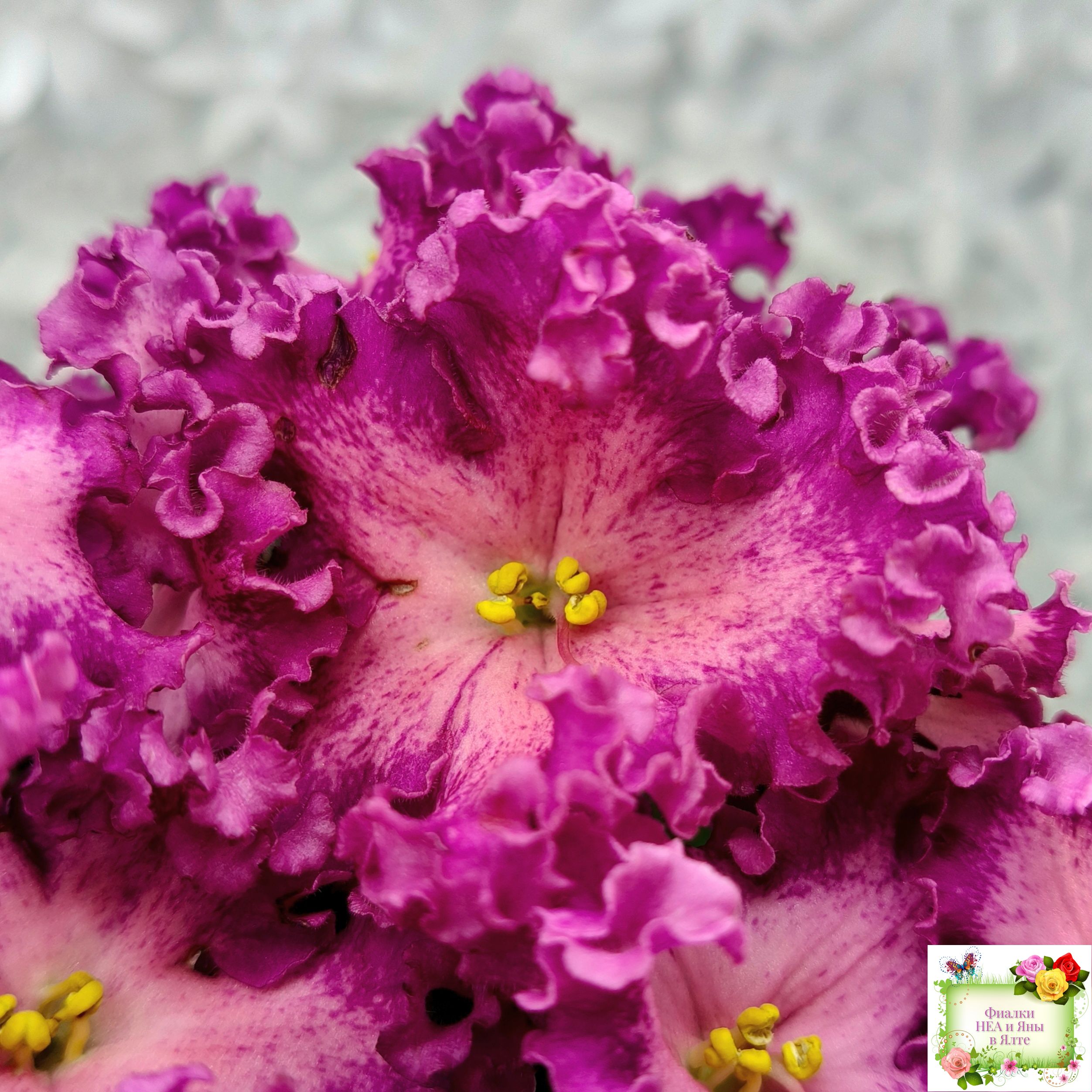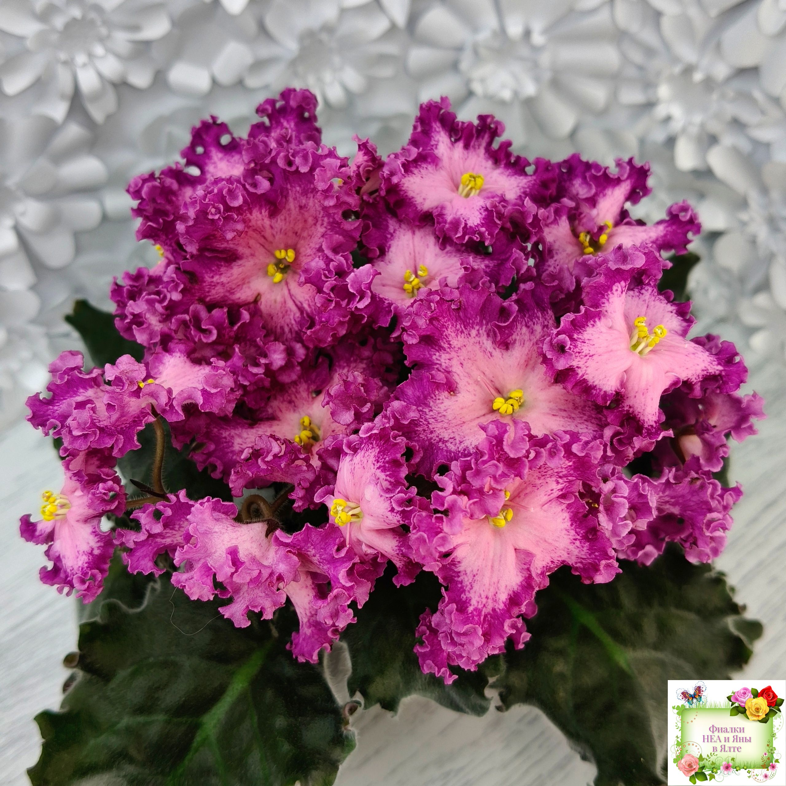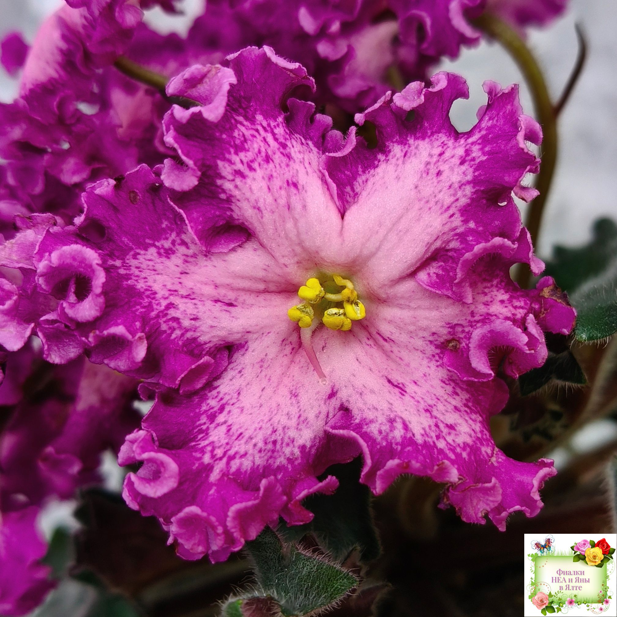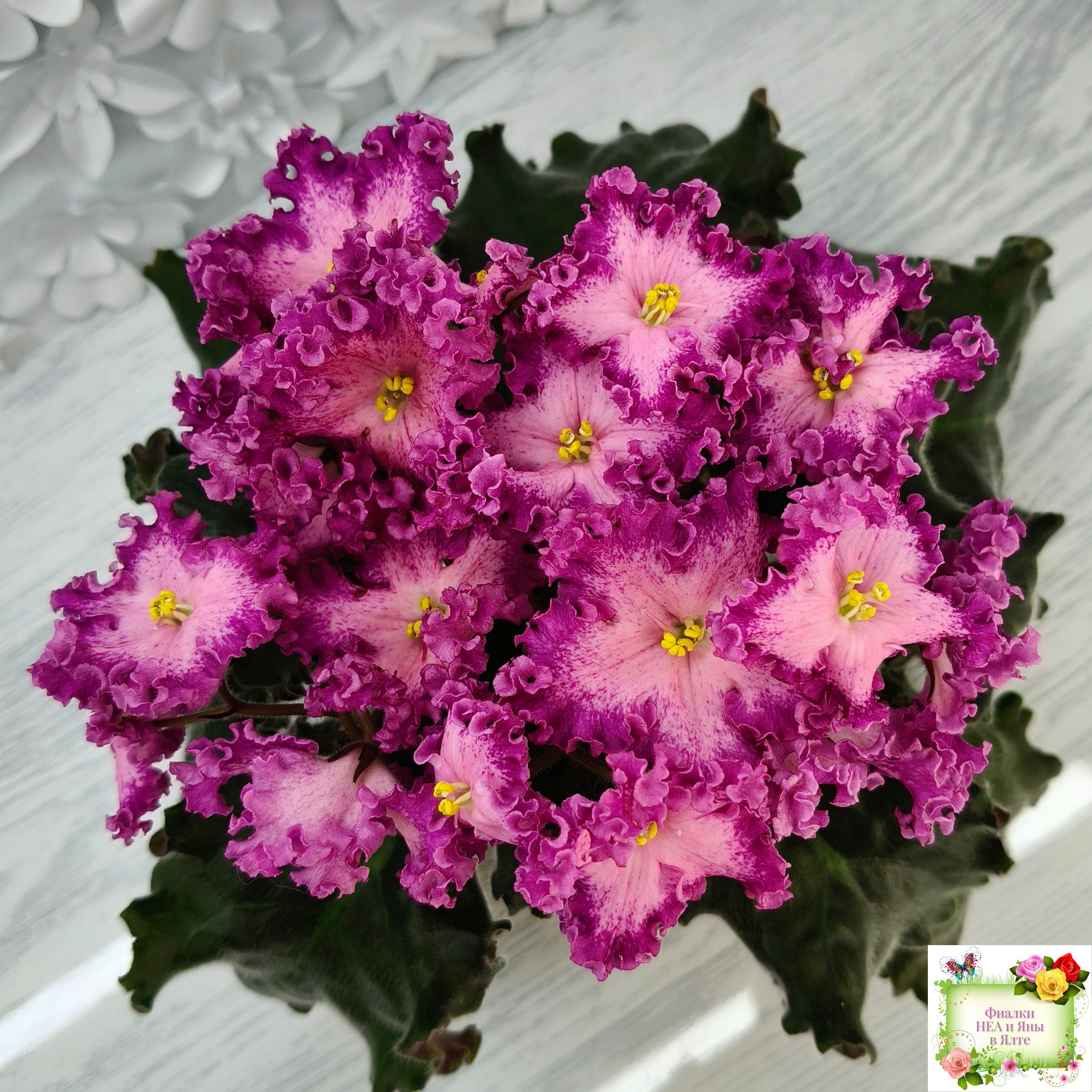 Замечательный кудряш фуксиевого цвета с фэнтези по лепесткам и более тёмными краями. Розетка с удлиненными волнистыми листьями с красной изнанкой. Стандарт. (Описание автора сорта).