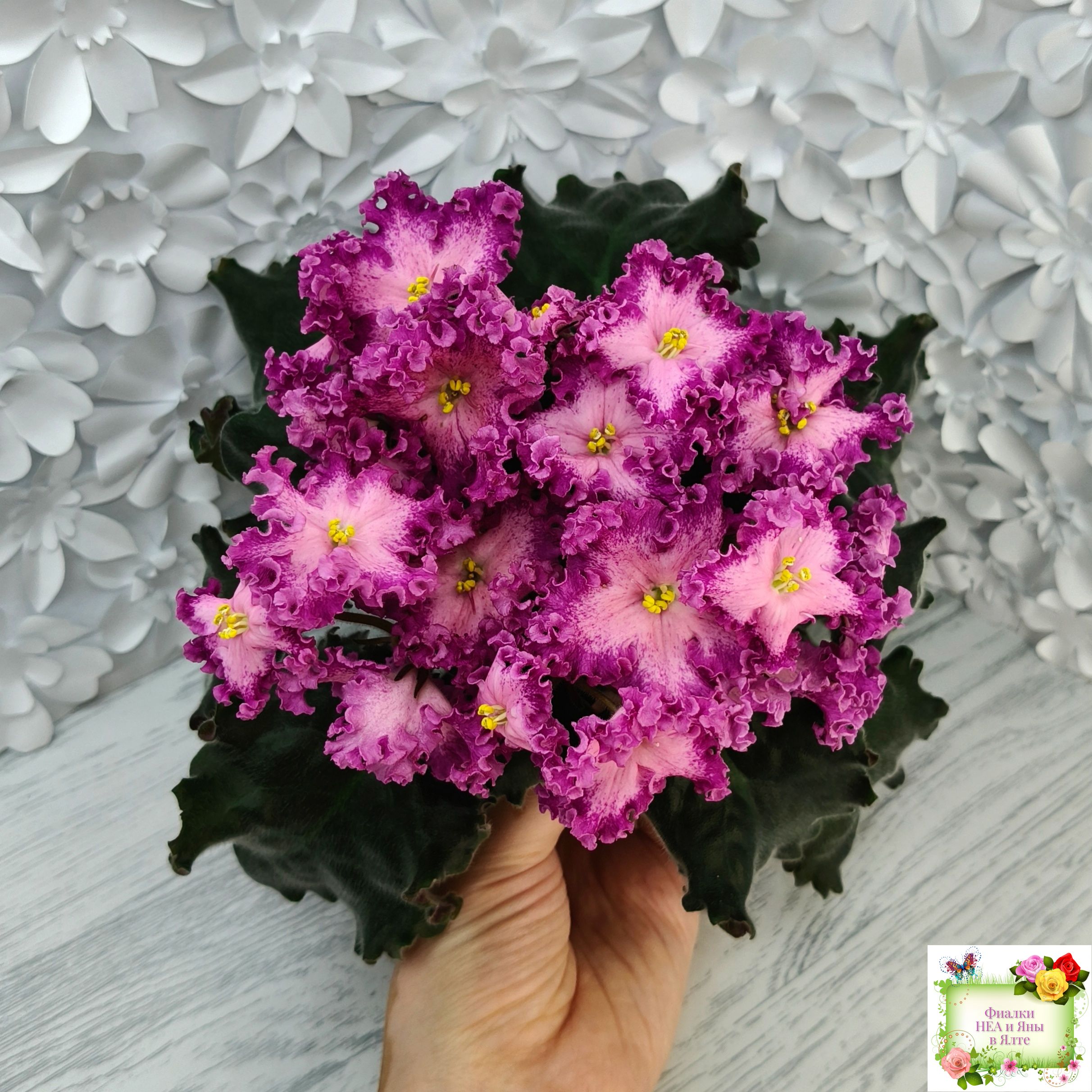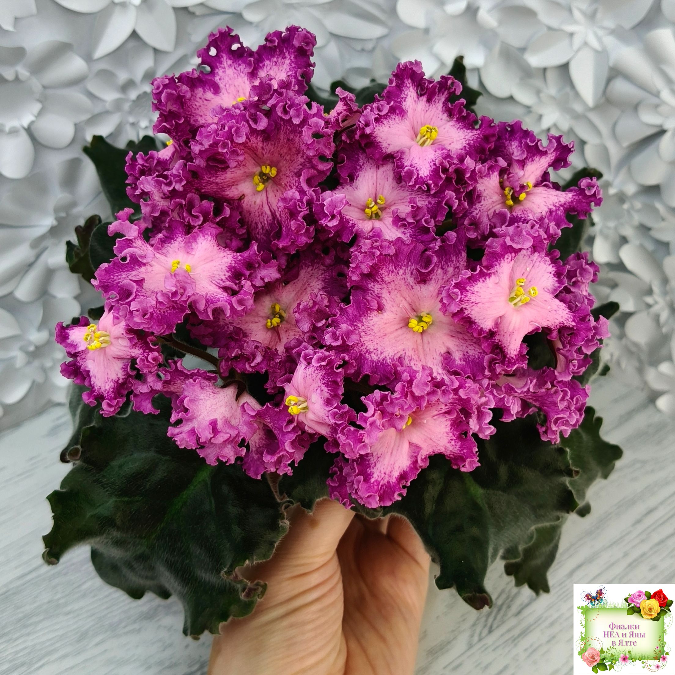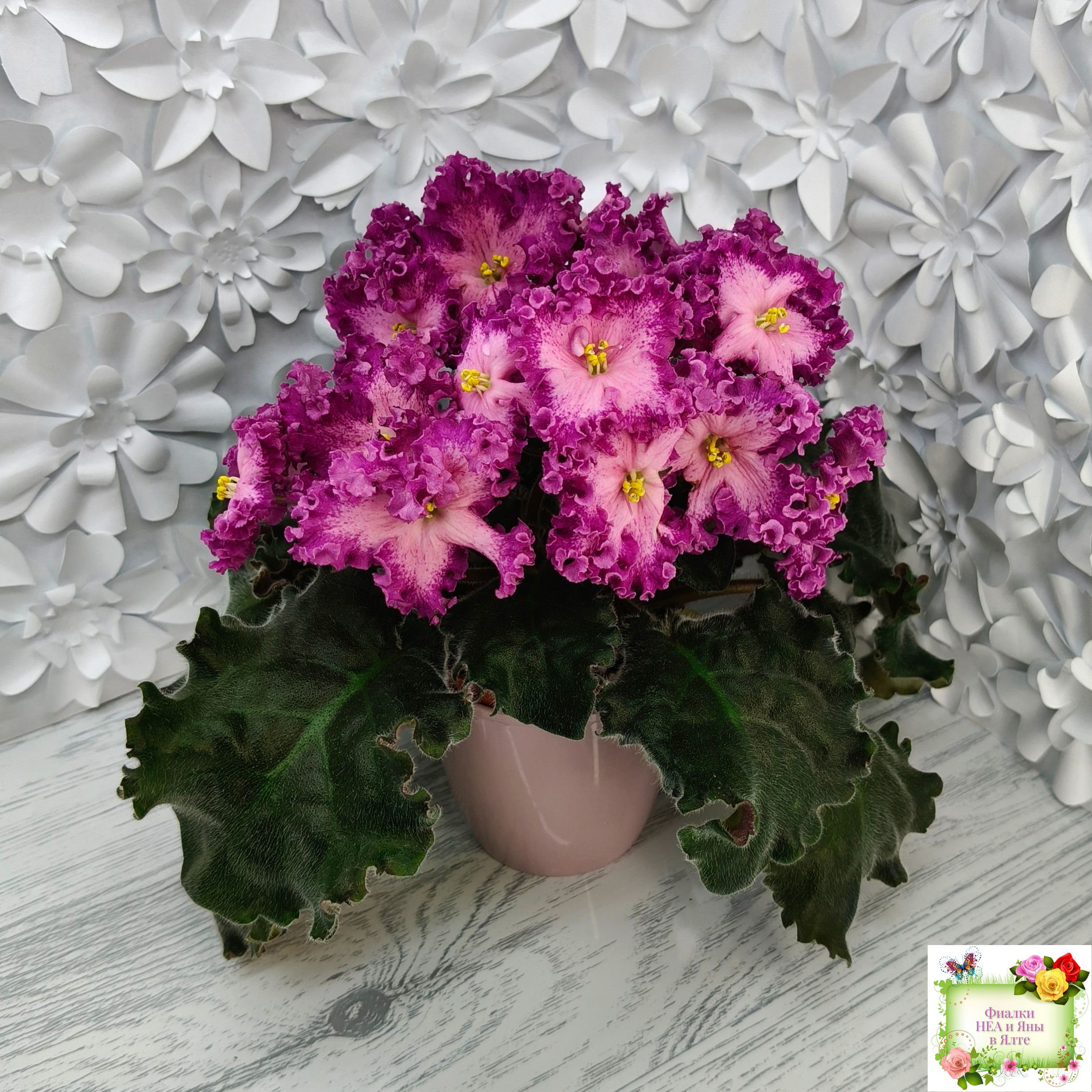 Замечательный кудряш фуксиевого цвета с фэнтези по лепесткам и более тёмными краями. Розетка с удлиненными волнистыми листьями с красной изнанкой. Стандарт. (Описание автора сорта).