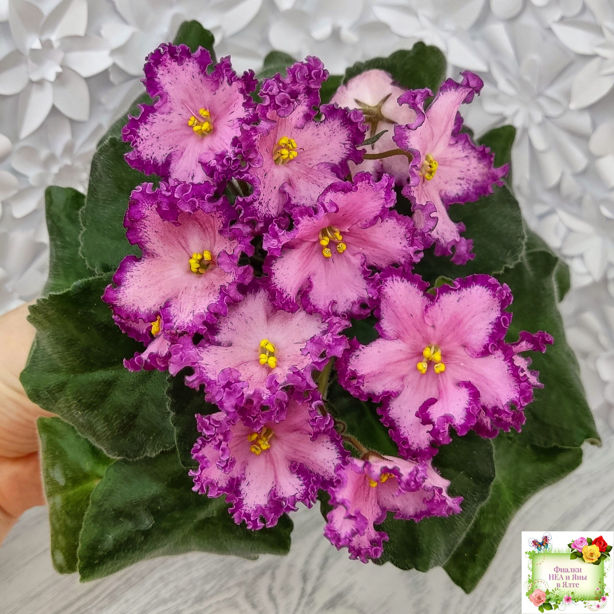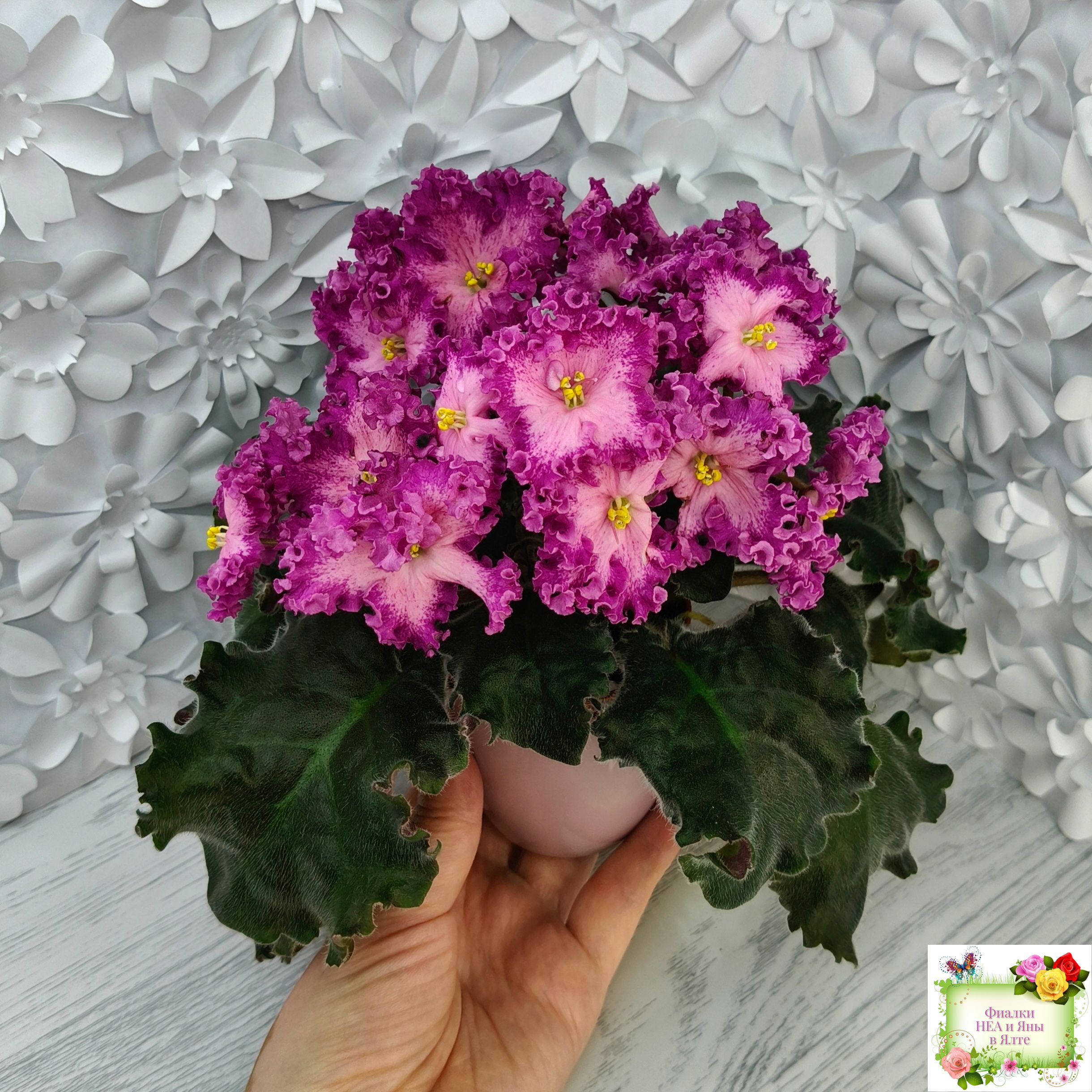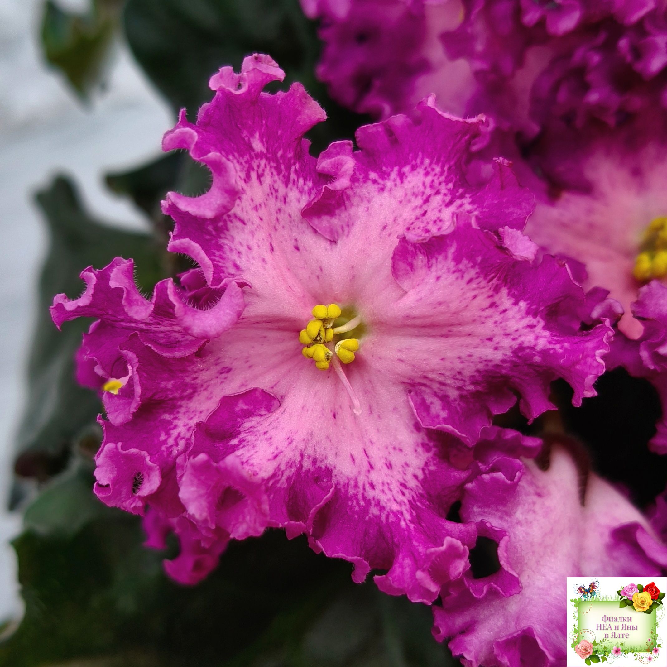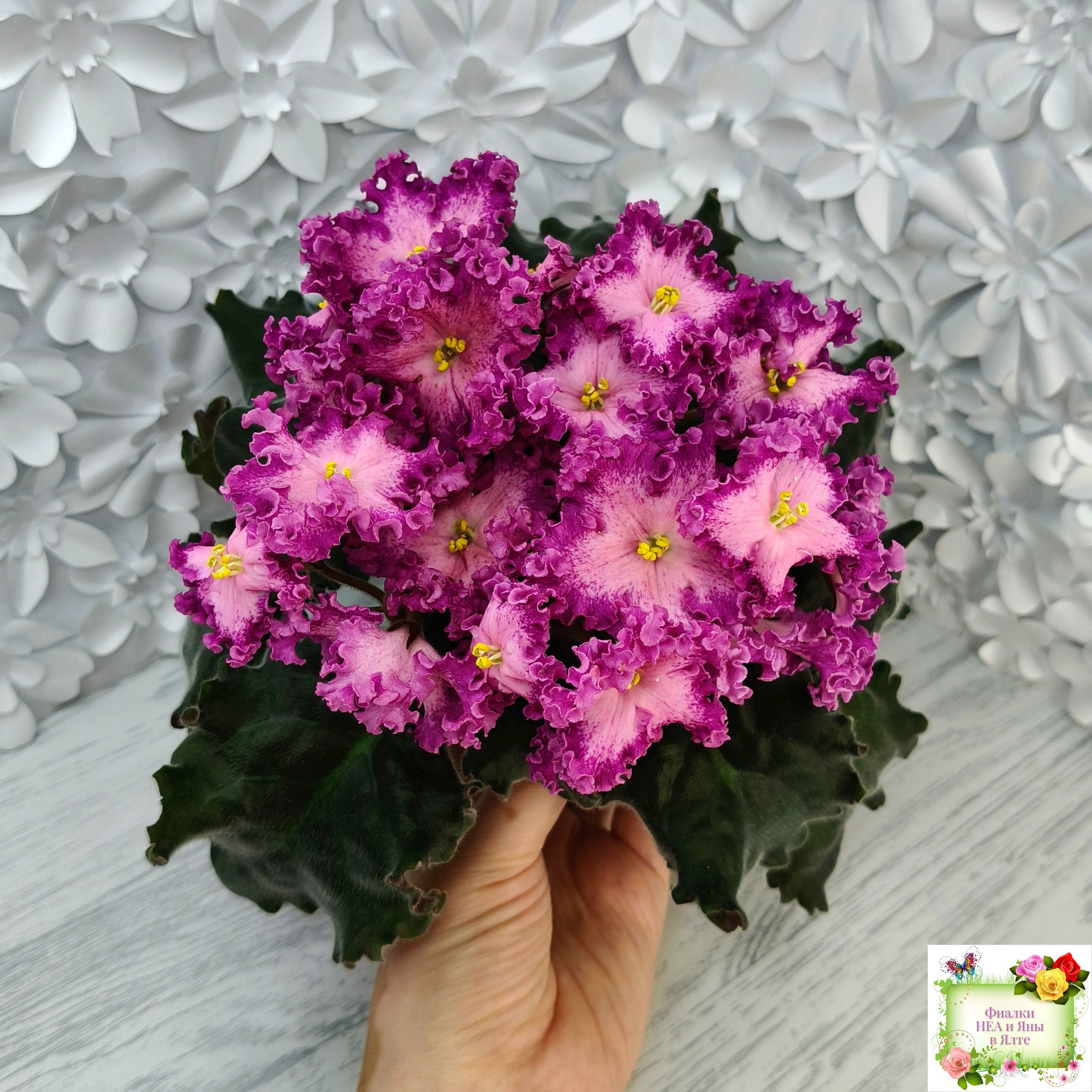 Замечательный кудряш фуксиевого цвета с фэнтези по лепесткам и более тёмными краями. Розетка с удлиненными волнистыми листьями с красной изнанкой. Стандарт. (Описание автора сорта).