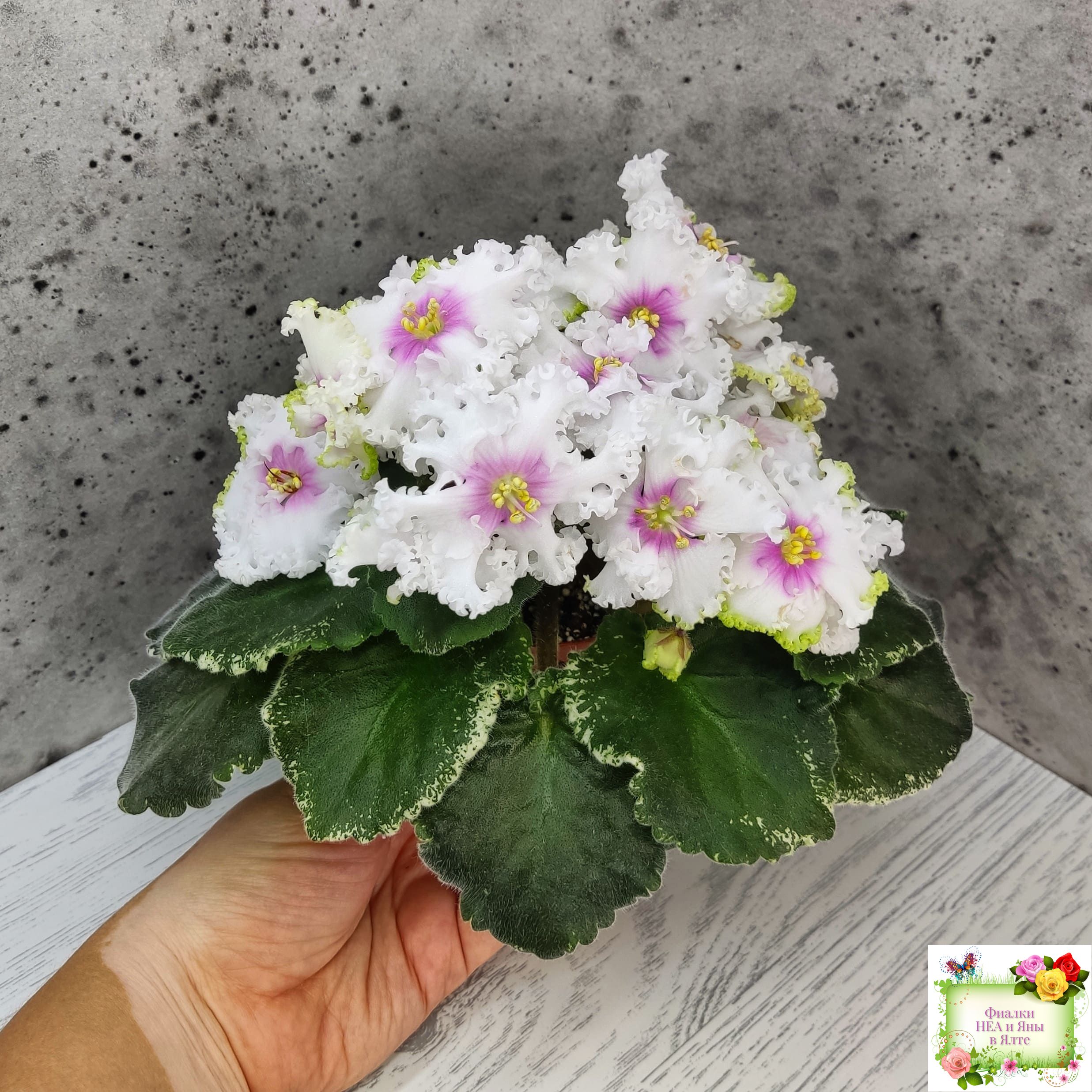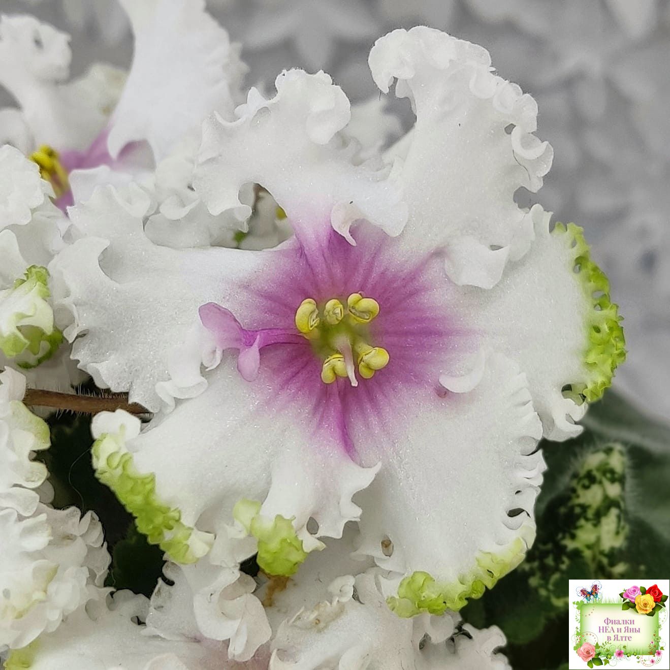 Белые крупные простые звезды. Глазок яркий, красивый чистый розовый цвет, по краю салатовый рюш.