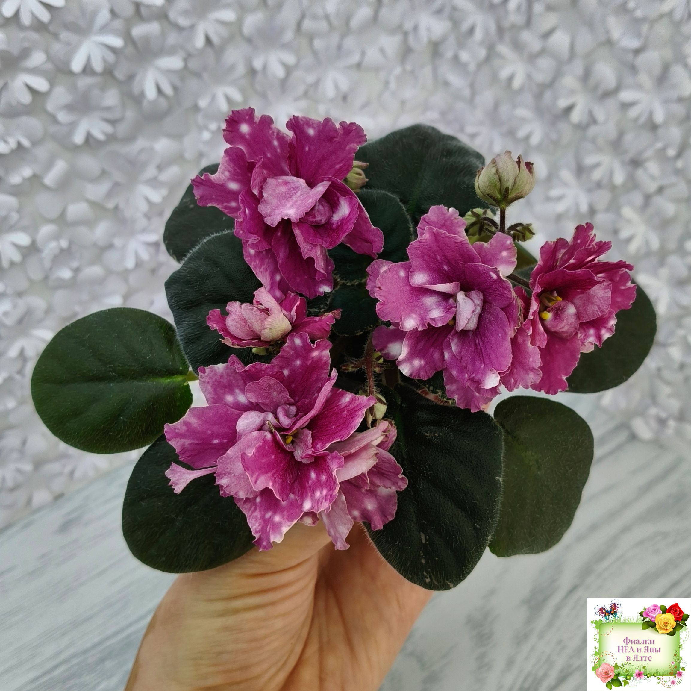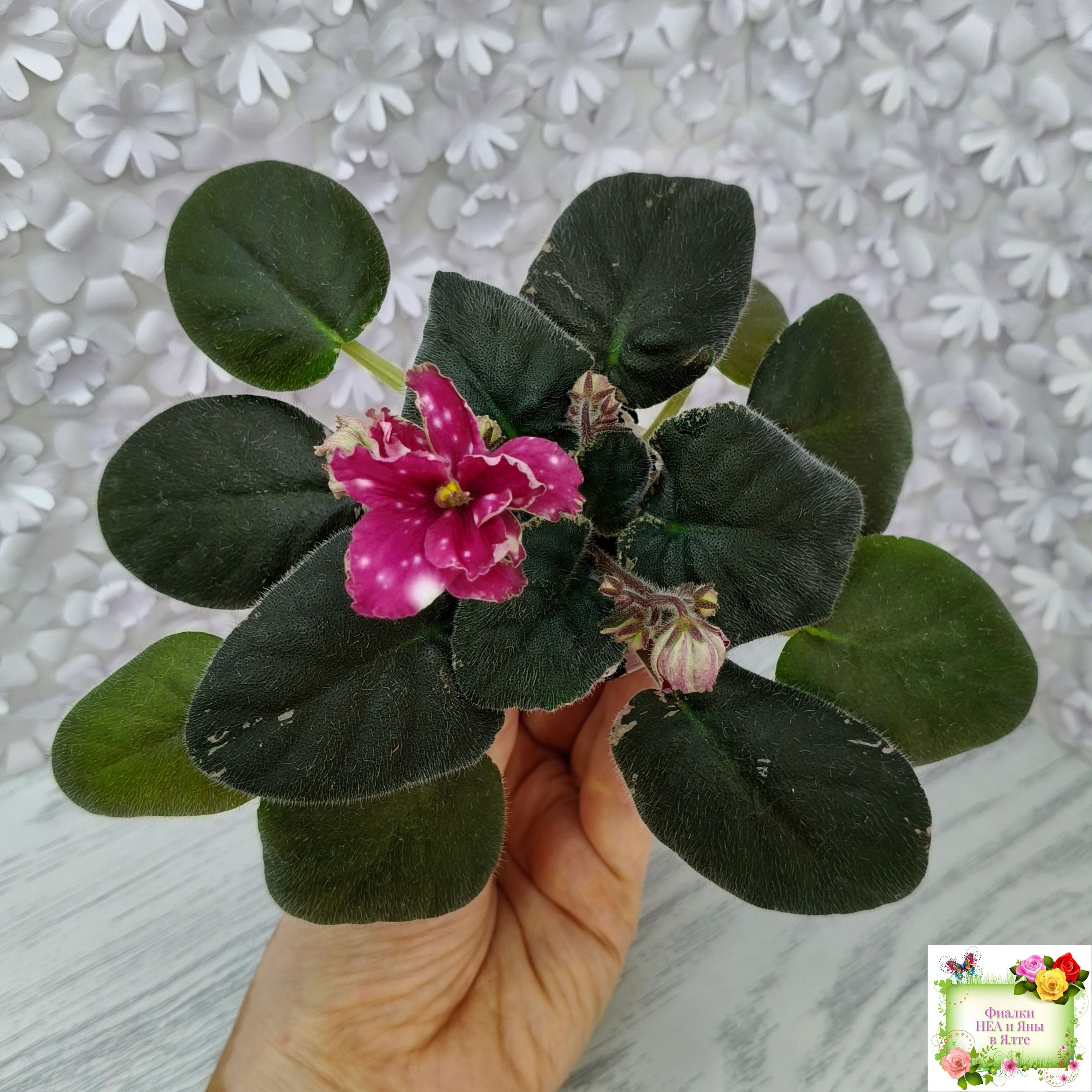Полумахровые звезды красно-вишневого цвета с фентези белых горошин. Красивая пестролистная розетка. Стандарт.