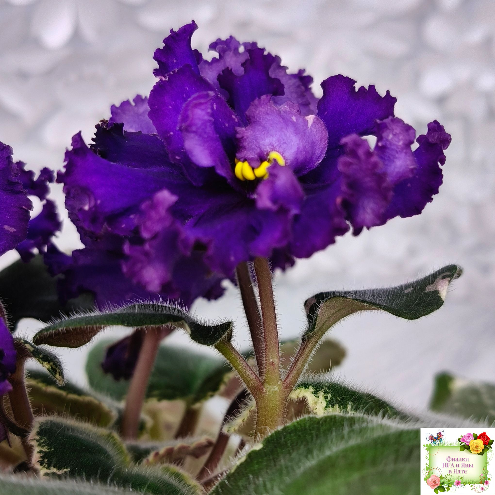 Крупные простые и полумахровые гофрированные очень темные сине-фиолетовые цветы с затемнением почти до черного на кончиках лепестков и розово-коралловыми штрихами фэнтази. Стандартная розетка, прямые темно-зеленые листья с кремовой пестролистностью.