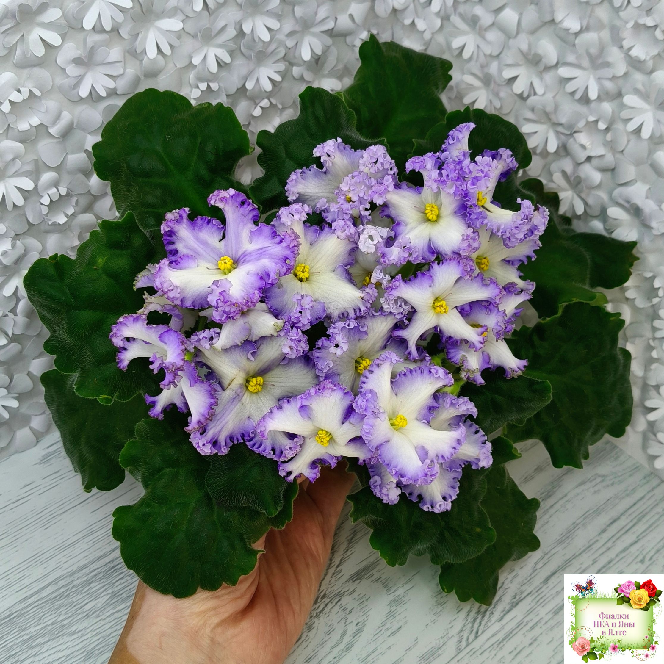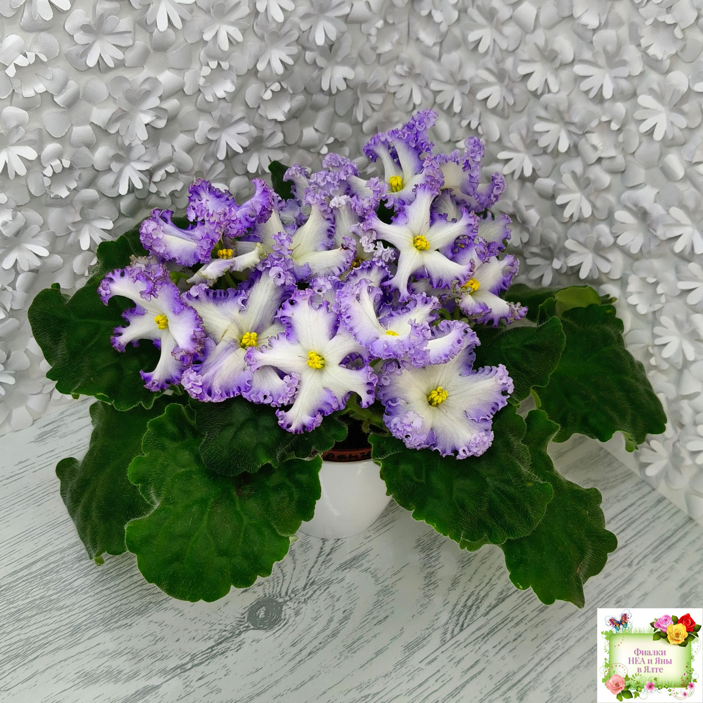 Эффектный контрастный сорт! Крупные простые белые звезды с гофрированной сине-голубой каймой. Кайма не заплывает. Цветение обильнейшее, огромной, пышной "шапкой", продолжительное. Стандартная розетка, зеленые слегка волнистые листья. Сорт нужно выращивать с листа и доводить до цветения несколько деток, т.к. цветы не у всех деток может быть гофрированным и контрастным. (Авторское описание).