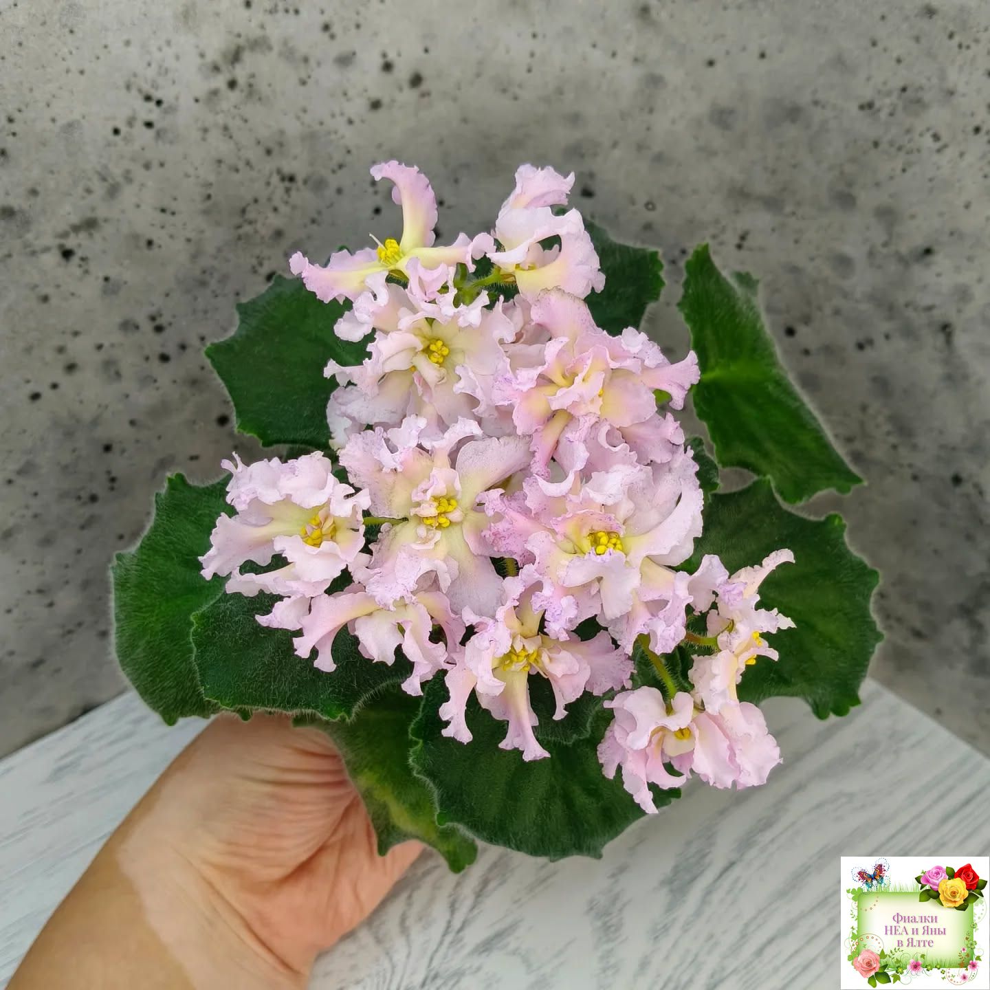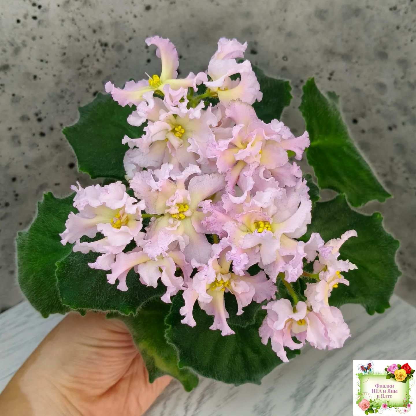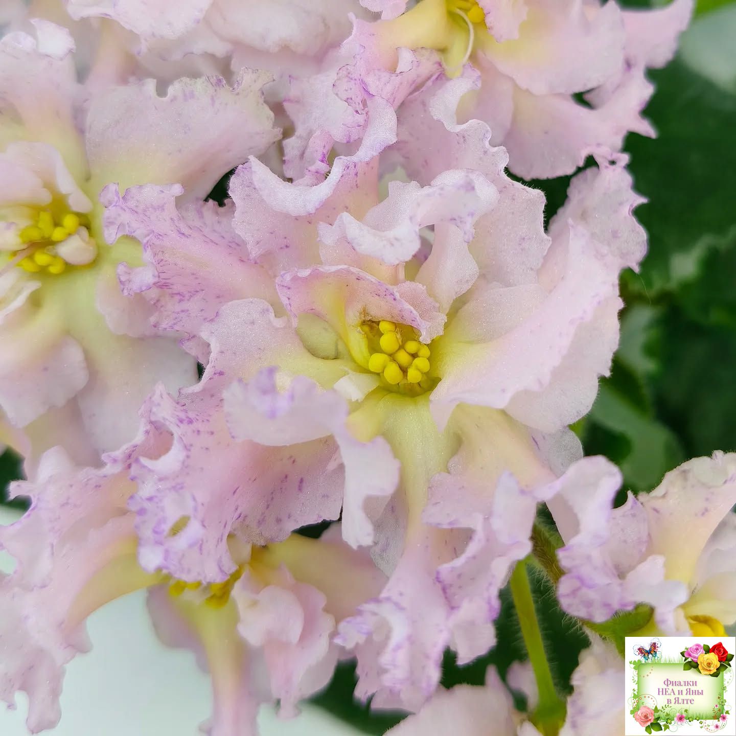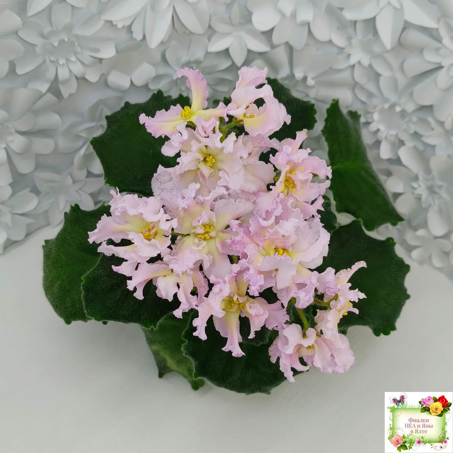 Крупные пышные полумахровые и махровые светло-розовые цветы с ярким темно-желтым широким глазком и малиновыми штрихами фэнтази преимущественно по краям лепестков. Форма цветов интересная и напоминает георгины: лепестки волнистые, удлиненные, чуть загнуты вверх. Очень красивый и оригинальный сорт с редко встречающимся окрашиванием. Стандартная розетка, зеленые листья. Крепкие цветоносы, обильное цветение. Предпочтительно выращивание на естественном освещении.
