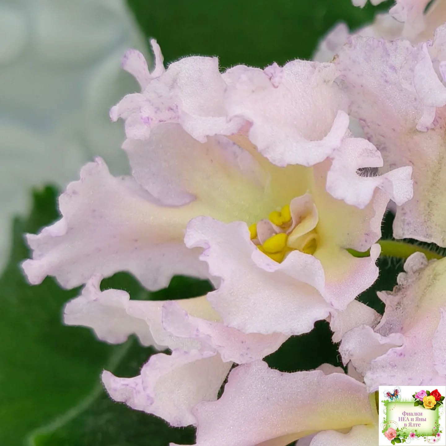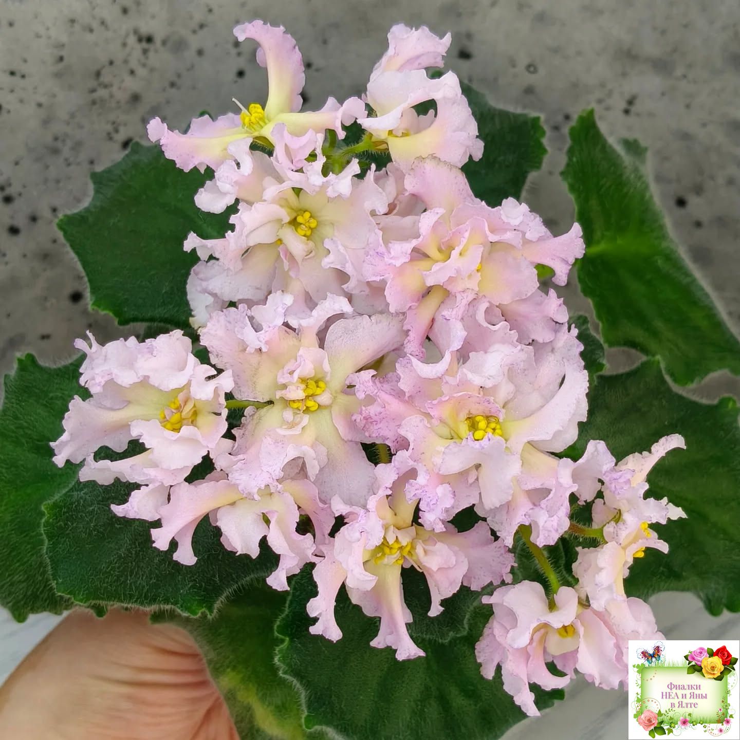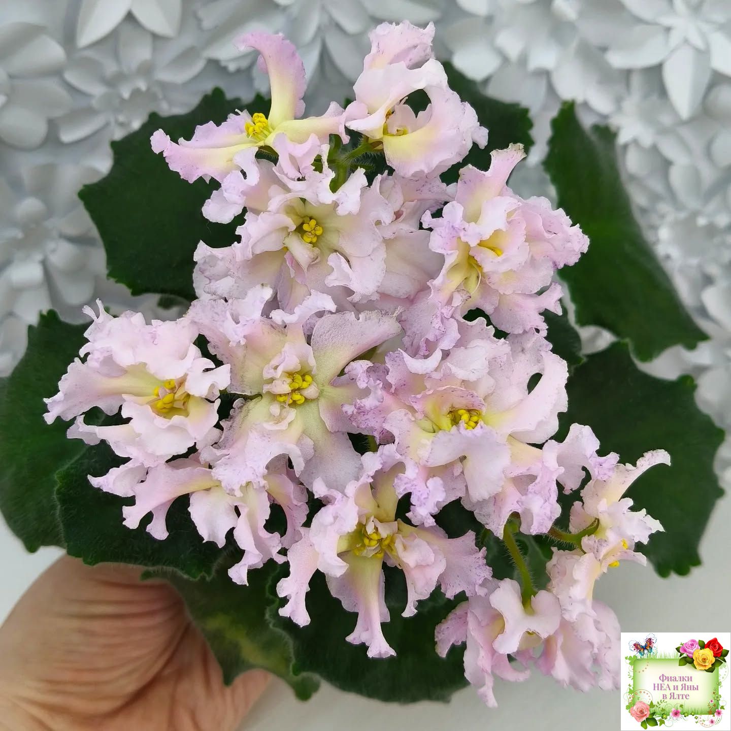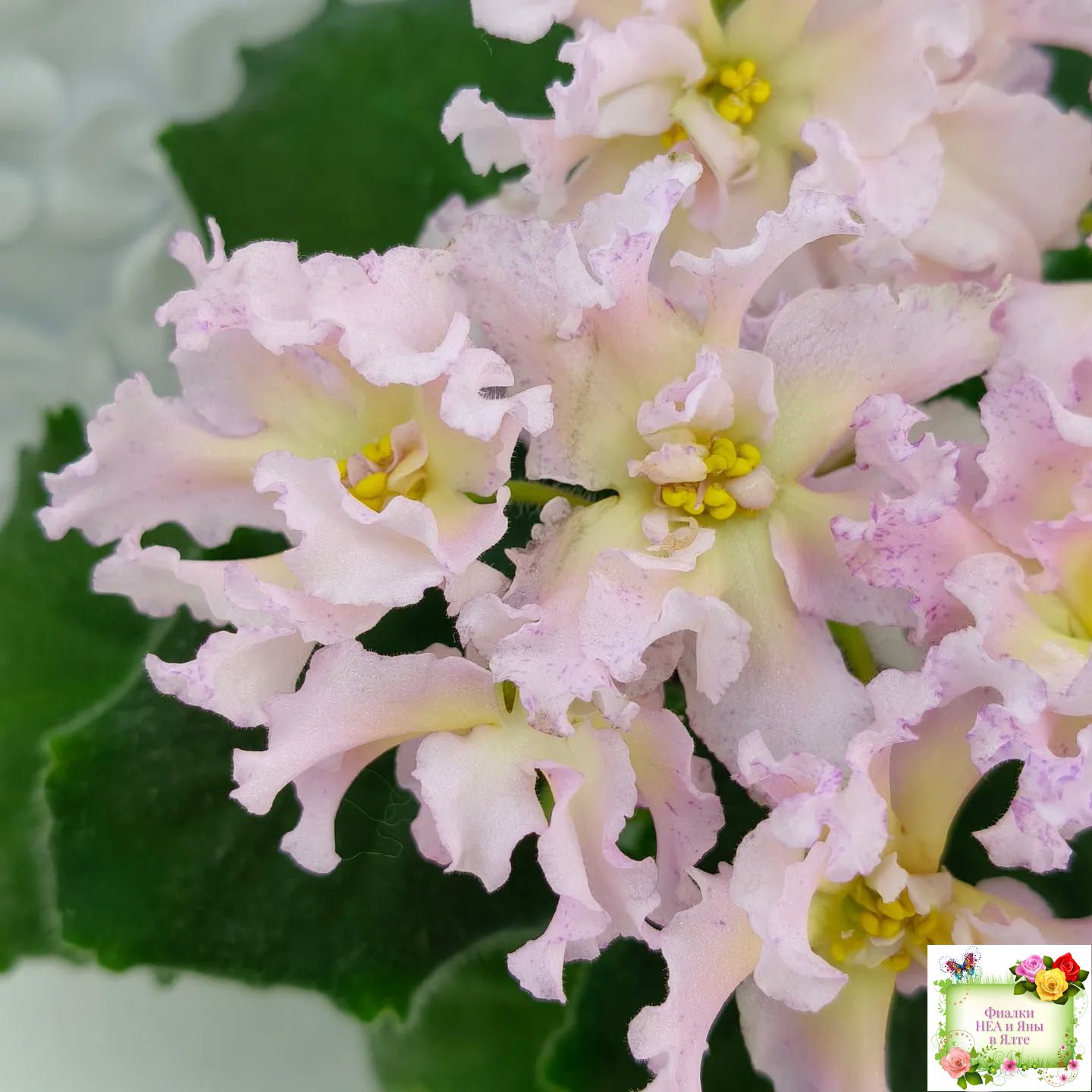 Крупные пышные полумахровые и махровые светло-розовые цветы с ярким темно-желтым широким глазком и малиновыми штрихами фэнтази преимущественно по краям лепестков. Форма цветов интересная и напоминает георгины: лепестки волнистые, удлиненные, чуть загнуты вверх. Очень красивый и оригинальный сорт с редко встречающимся окрашиванием. Стандартная розетка, зеленые листья. Крепкие цветоносы, обильное цветение. Предпочтительно выращивание на естественном освещении.