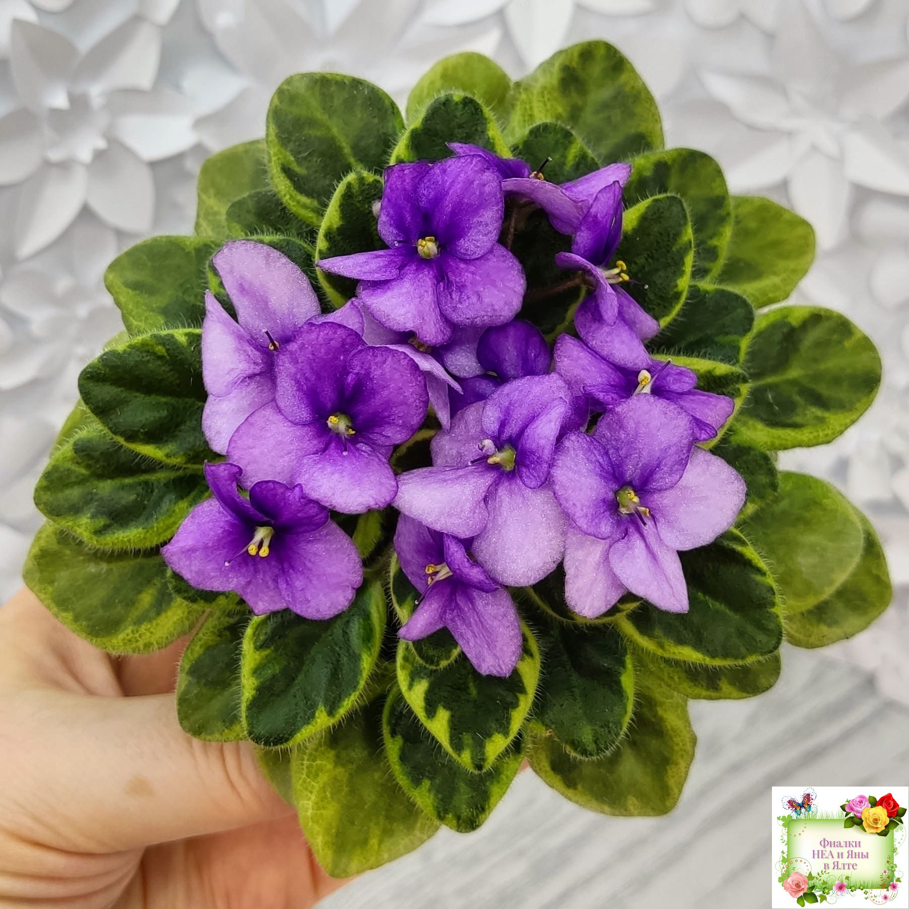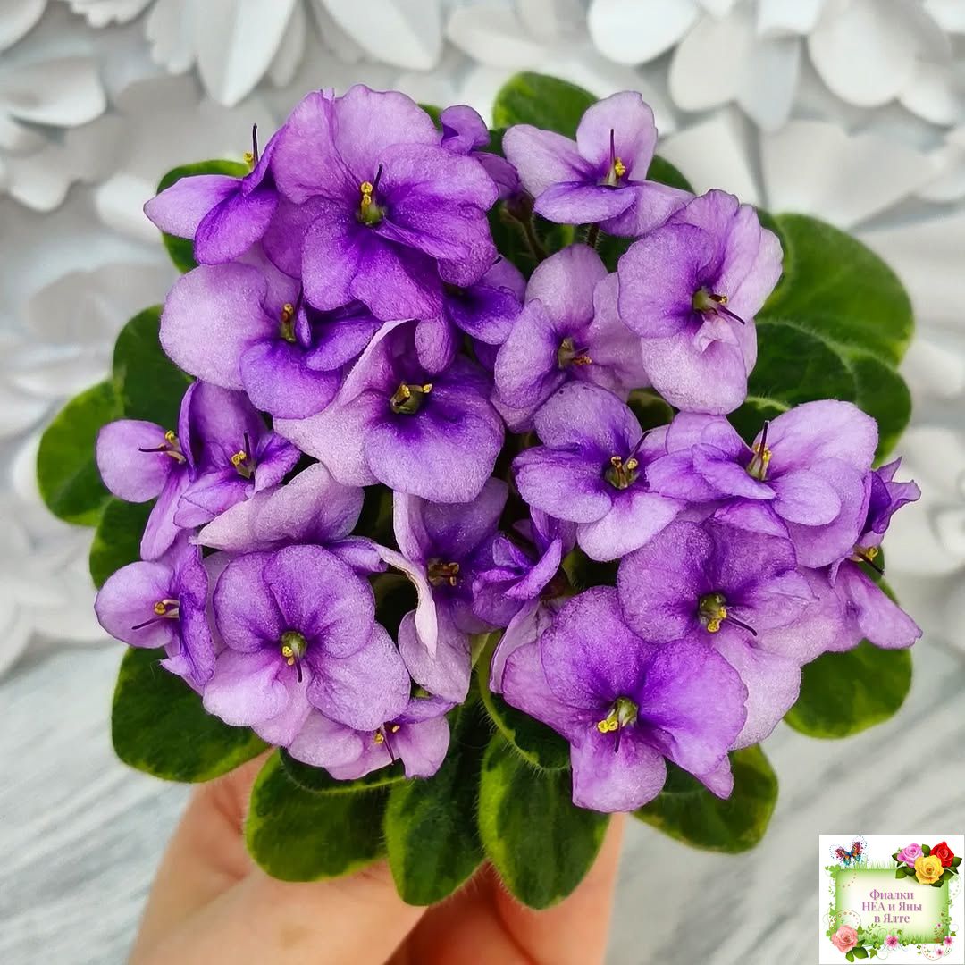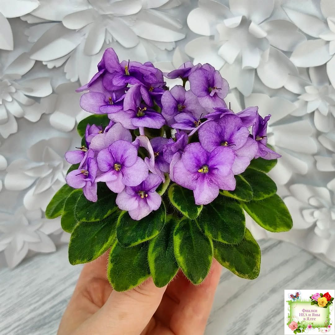 Полумахровые орхидно-лиловые анютки. Пестрая химерная темно-зеленая с золотым ровная листва. Миниатюра. Листовая химера, была получена как спорт от Rob's Fuddy Daddy.