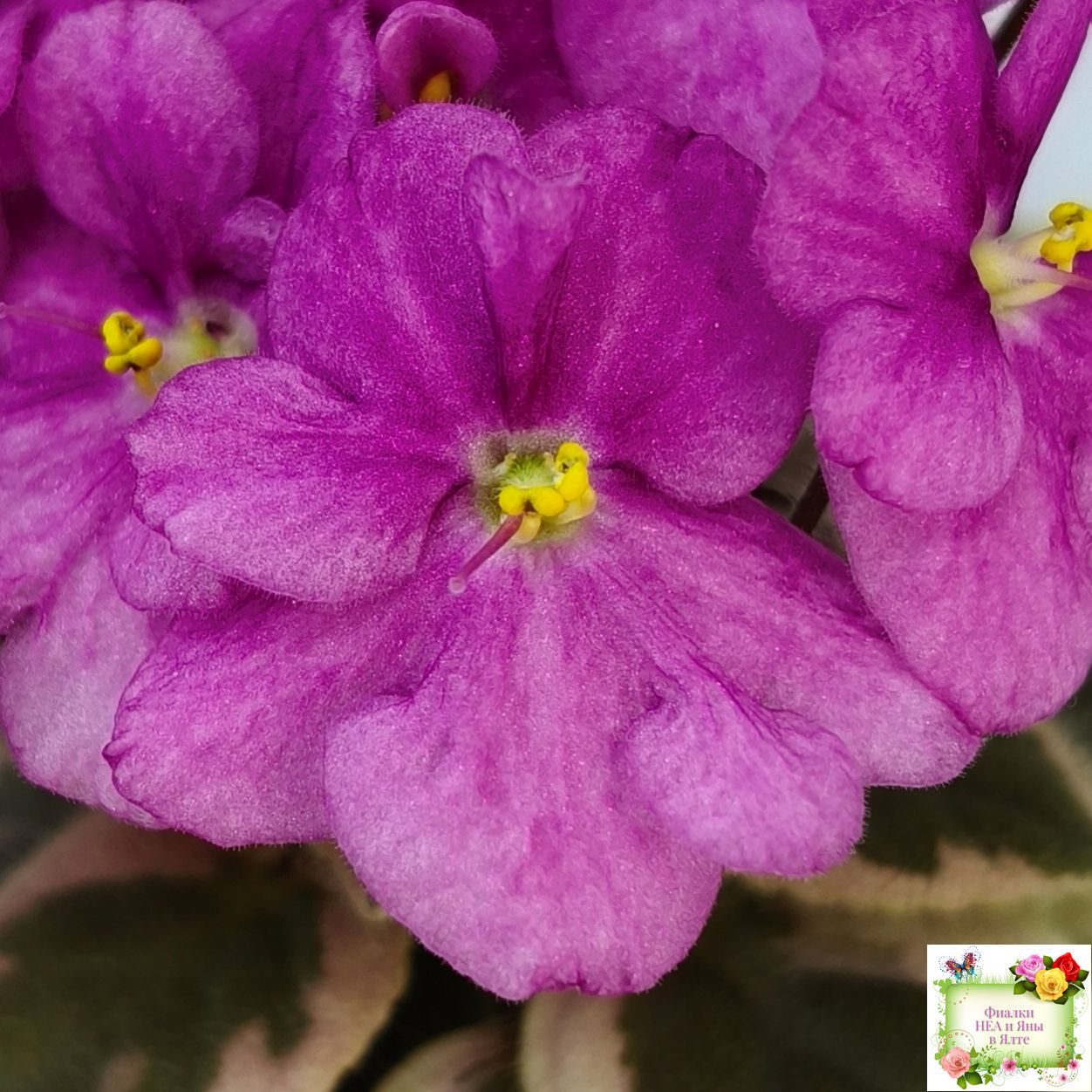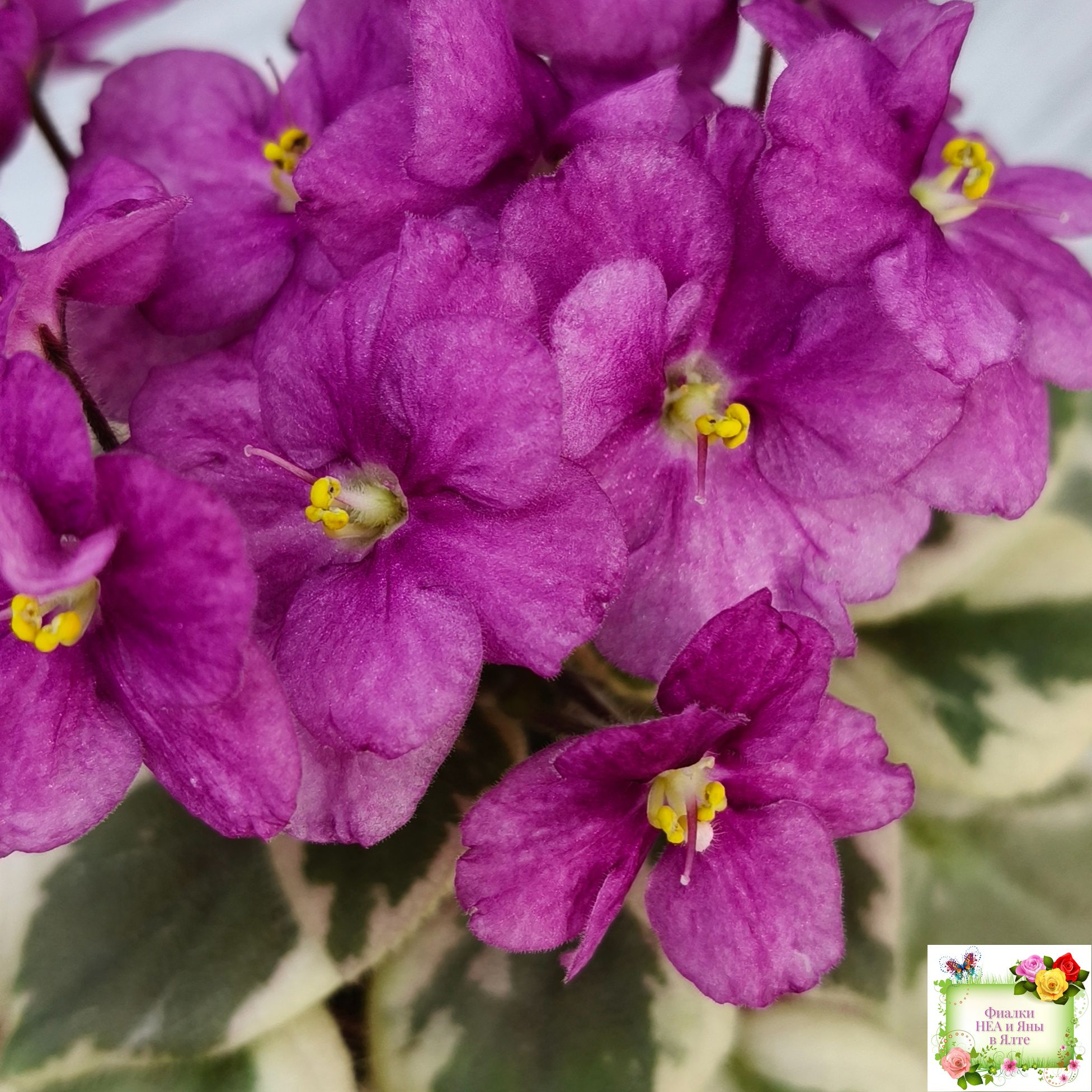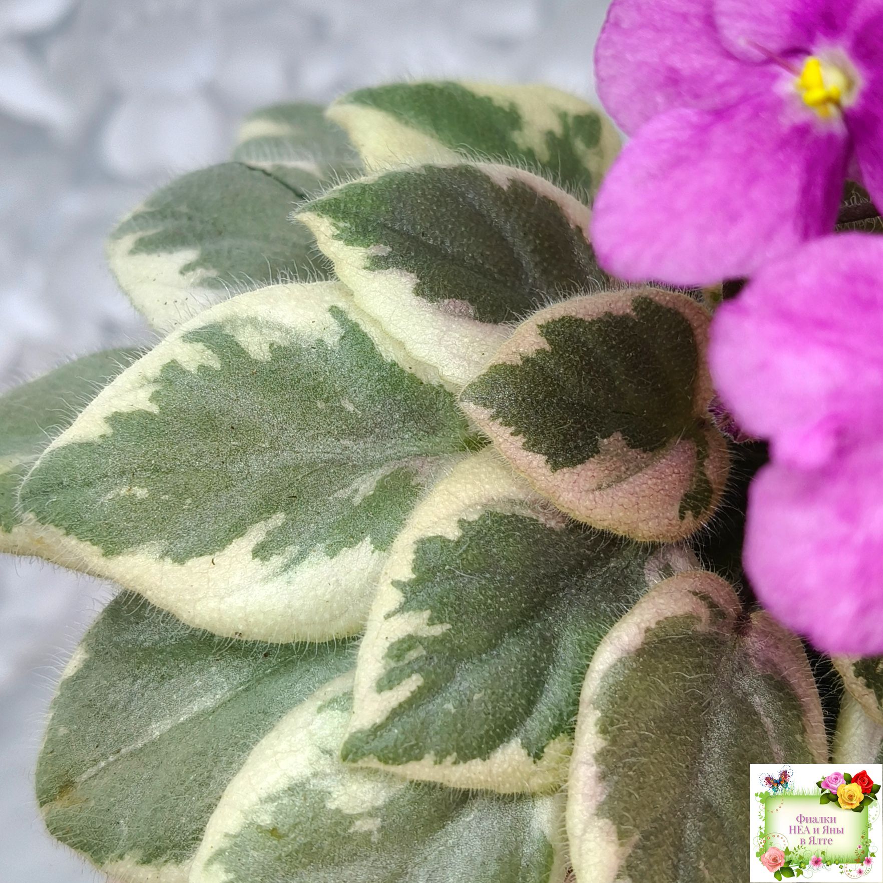 (9395) 10/15/2004 Semidouble dark rose-pink pansy. Variegated dark green, white and pink, pointed, serrated; sucker propagation. Semiminiature.