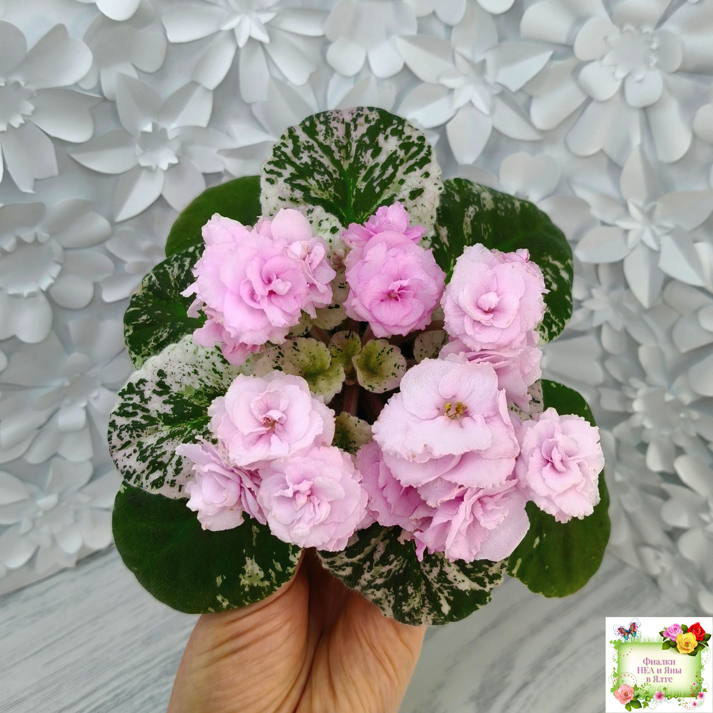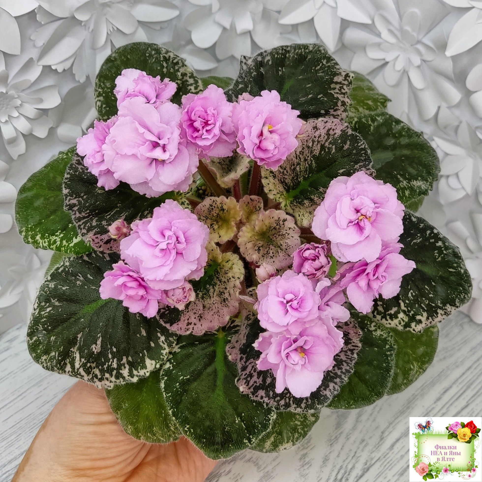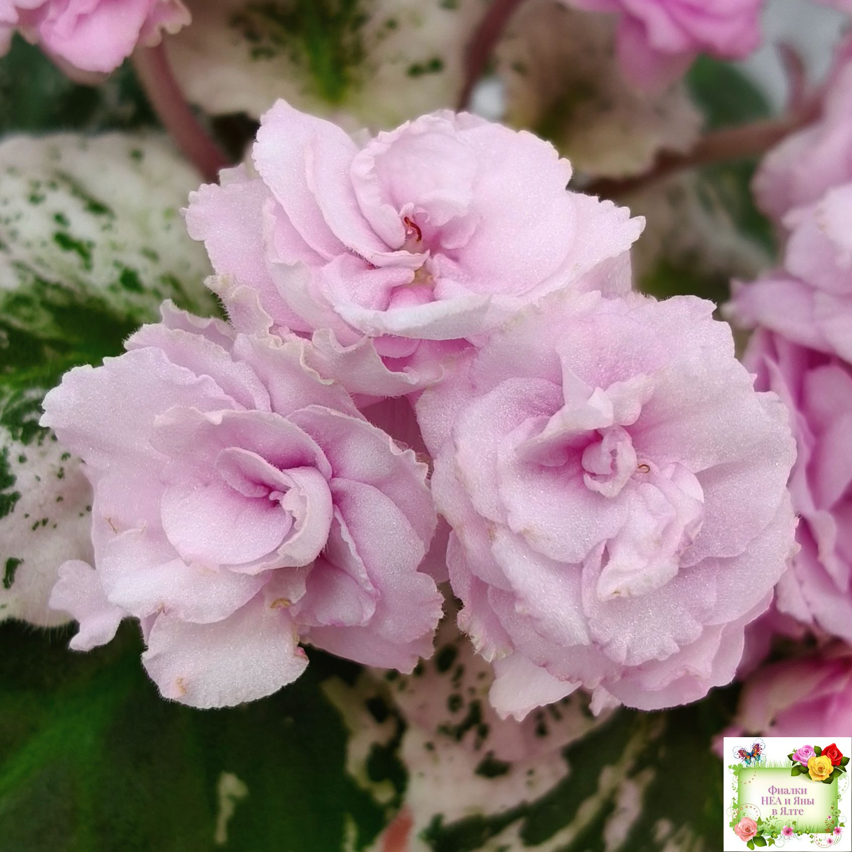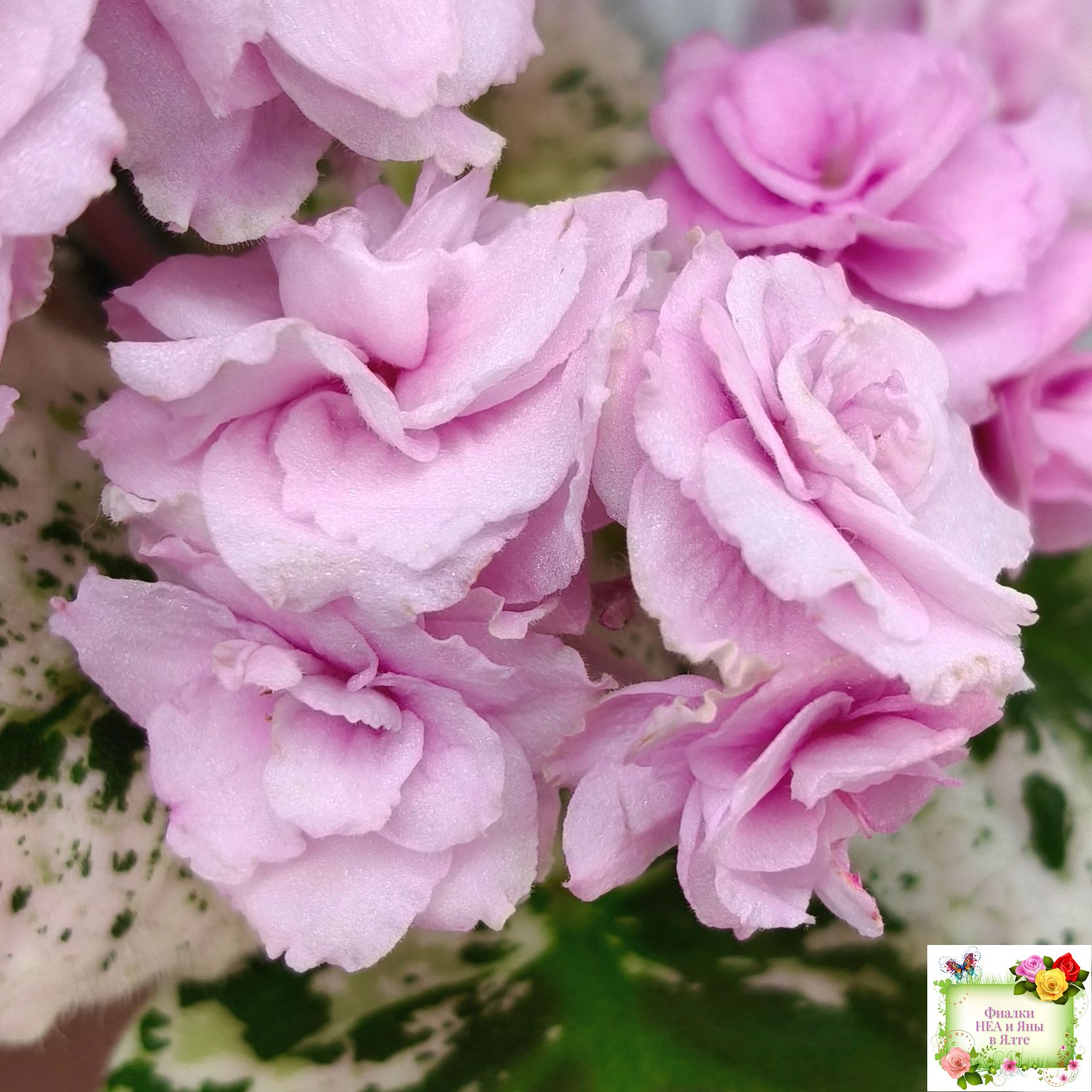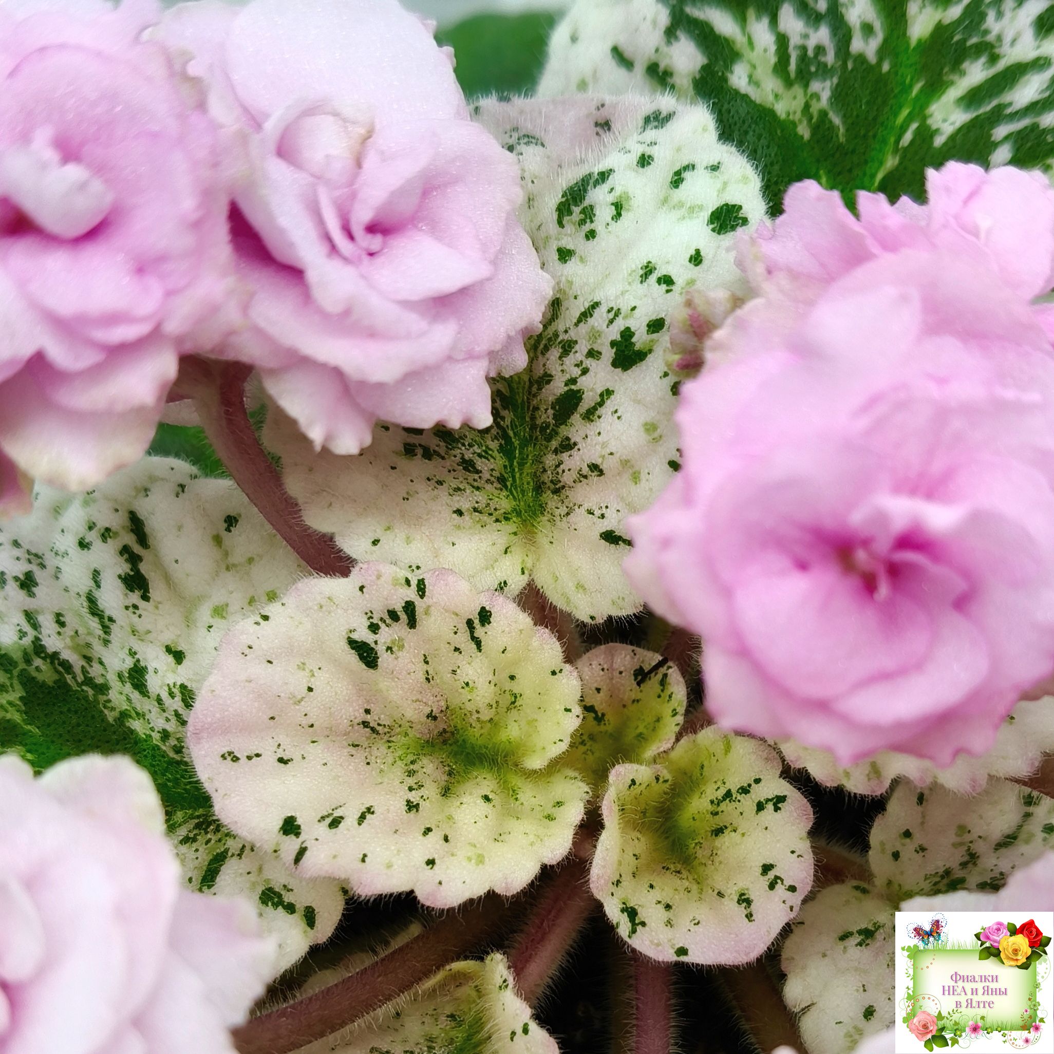 Махровые розовые оборчатые звезды с темным глазком. Мозаичная пестролистность на средне-зеленой, розовой с белым, ровной, стеганой листве. Стандарт.