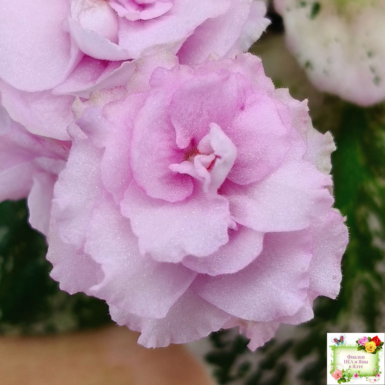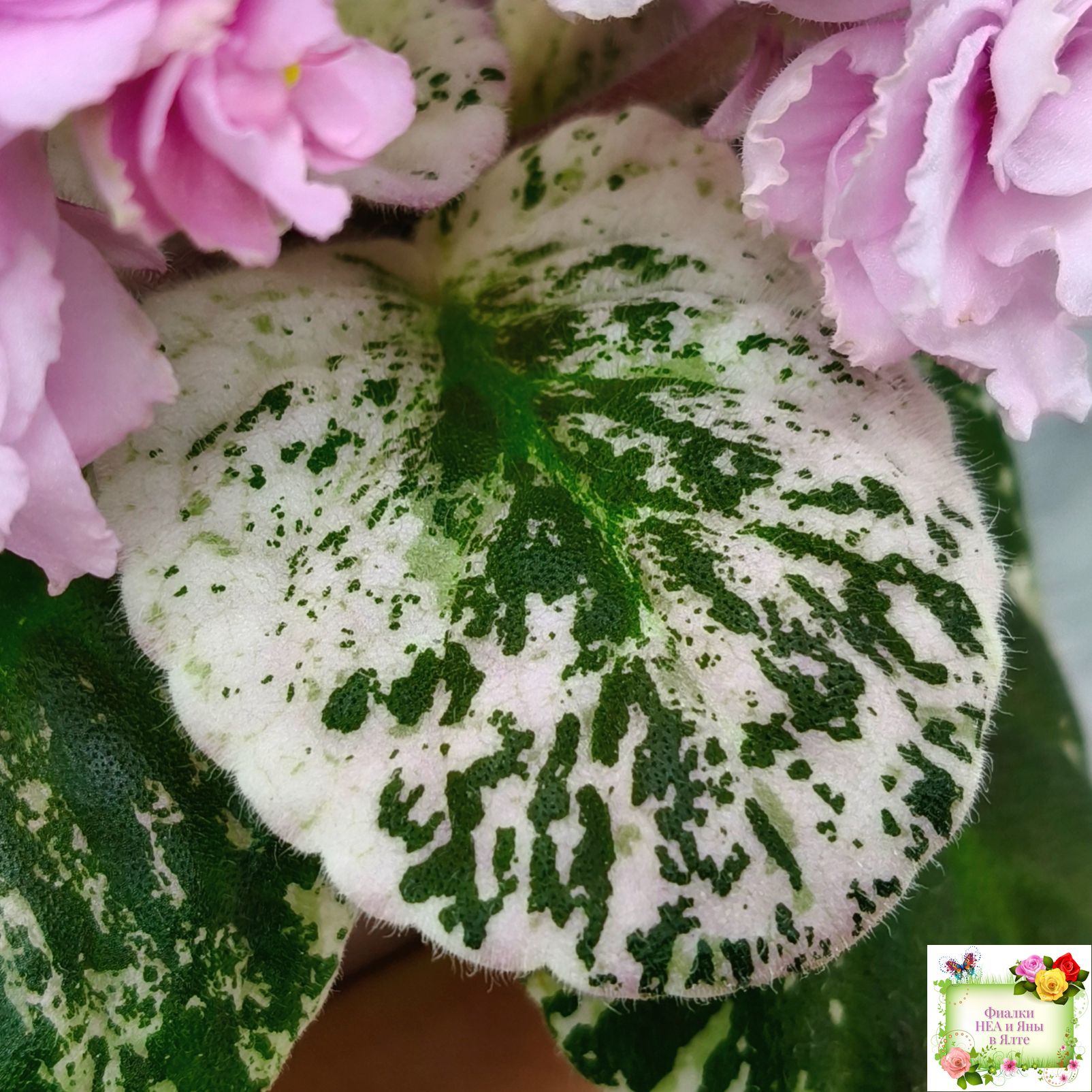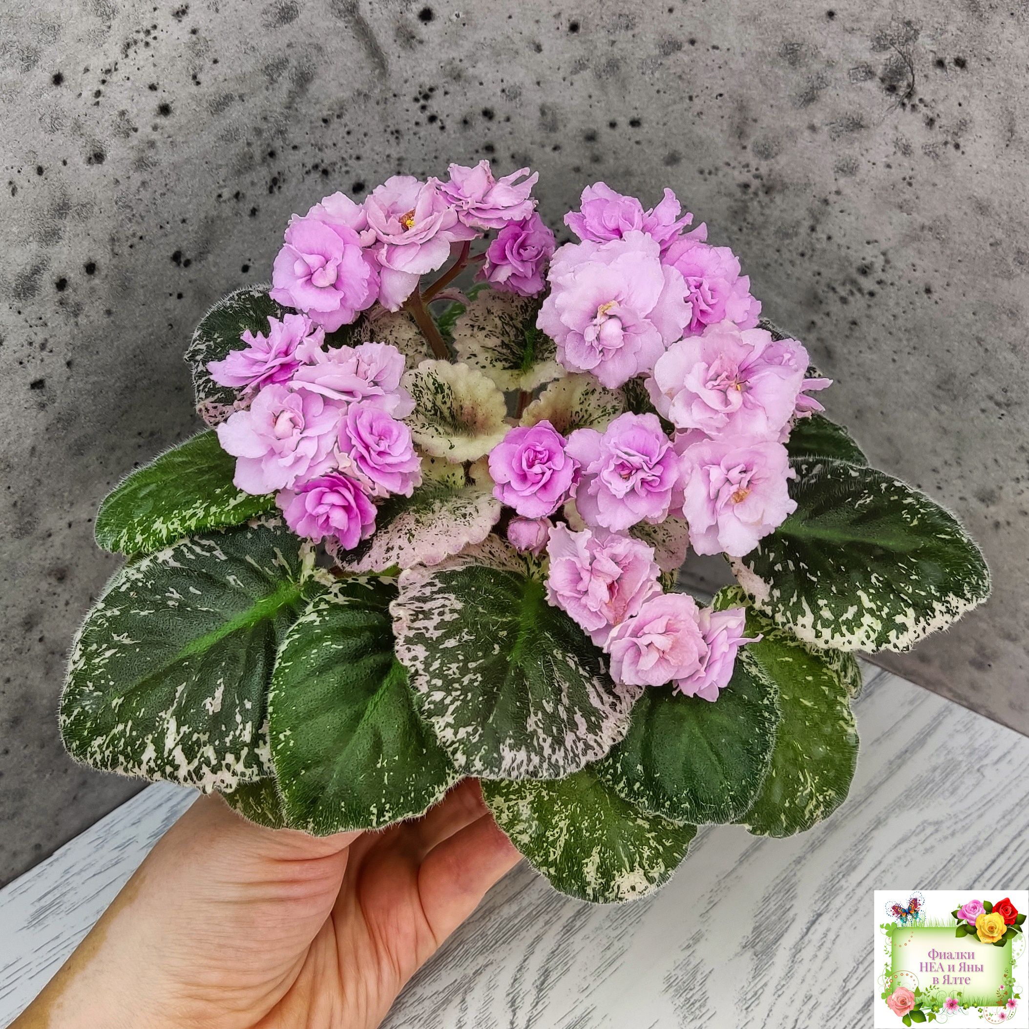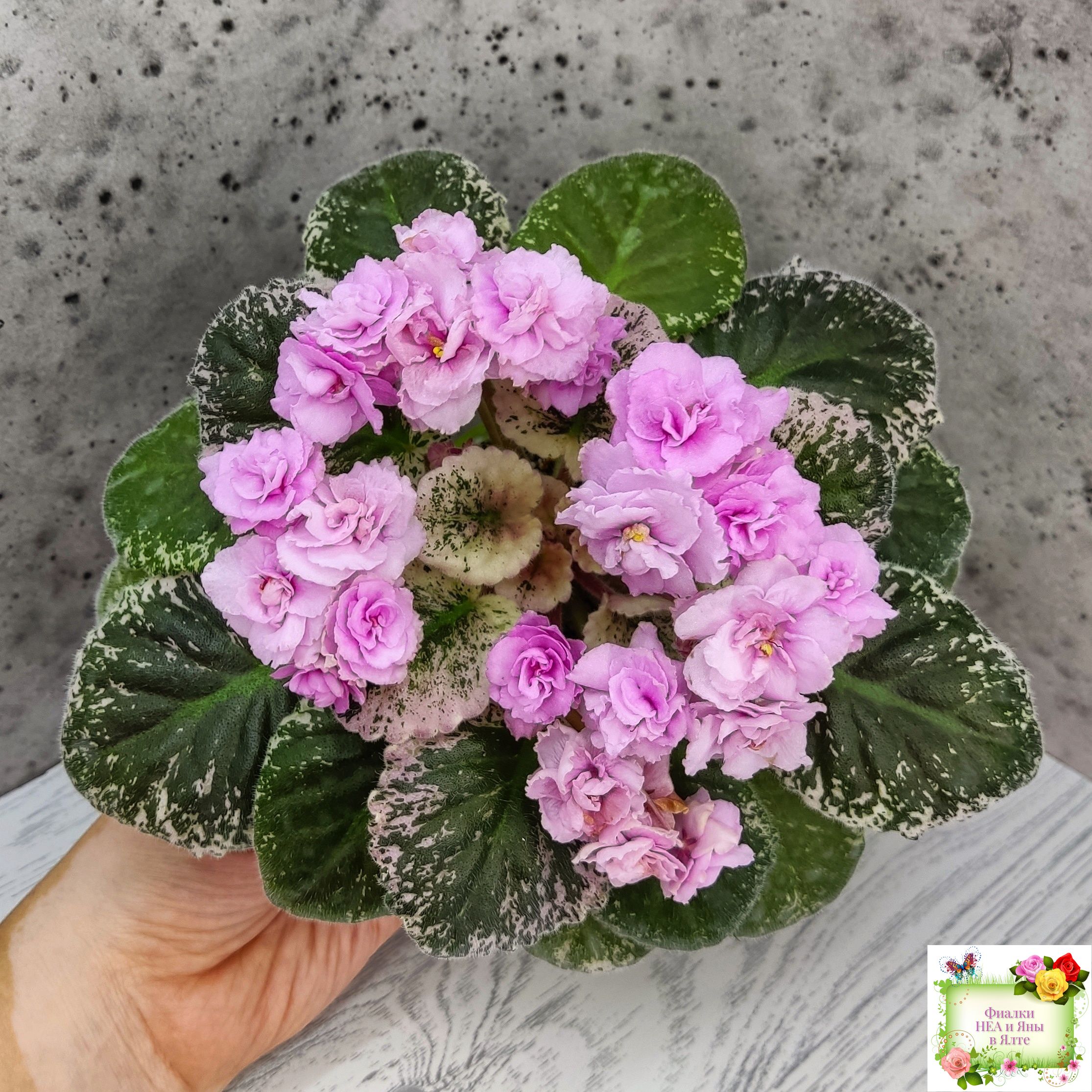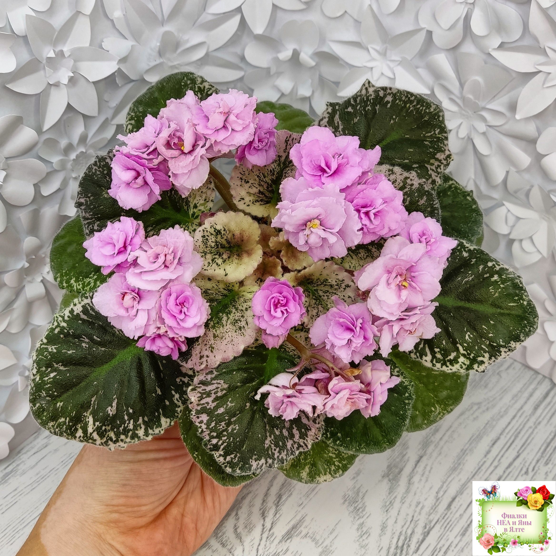 Махровые розовые оборчатые звезды с темным глазком. Мозаичная пестролистность на средне-зеленой, розовой с белым, ровной, стеганой листве. Стандарт.