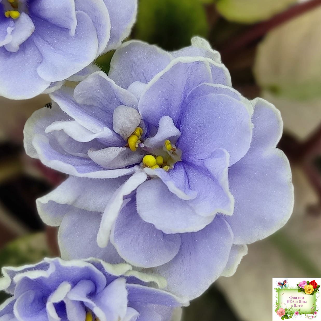 Нежные небесно-голубые полумахровые и махровые цветы. Розово-платиновая кроновая пестролистность. Полумини (Описание автора)