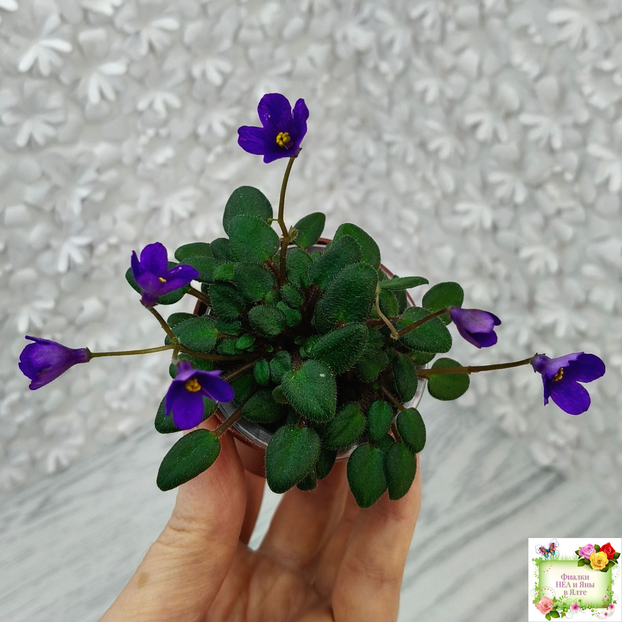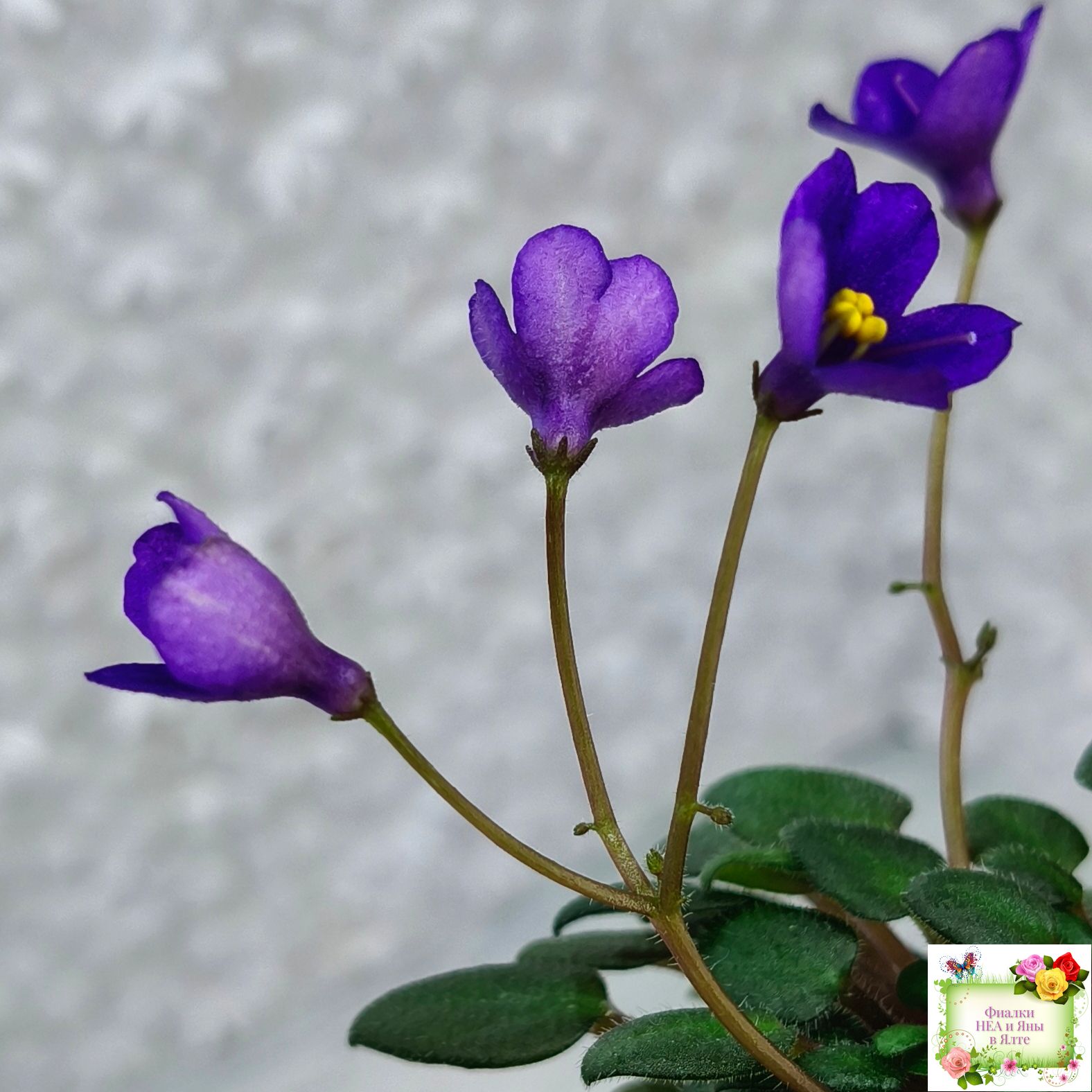 Single dark plumpurple bell. Dark green, pointed, glossy. Miniature trailer
