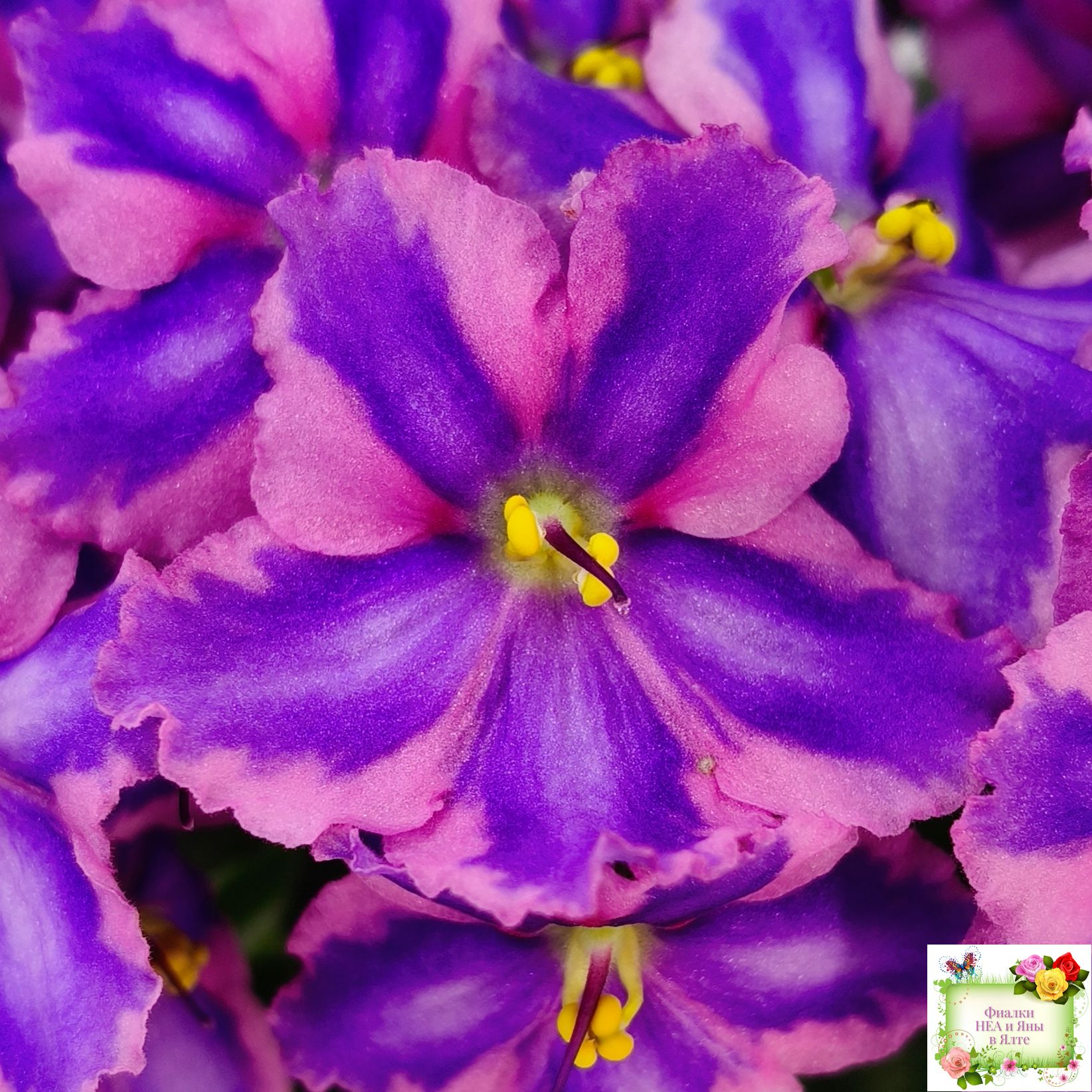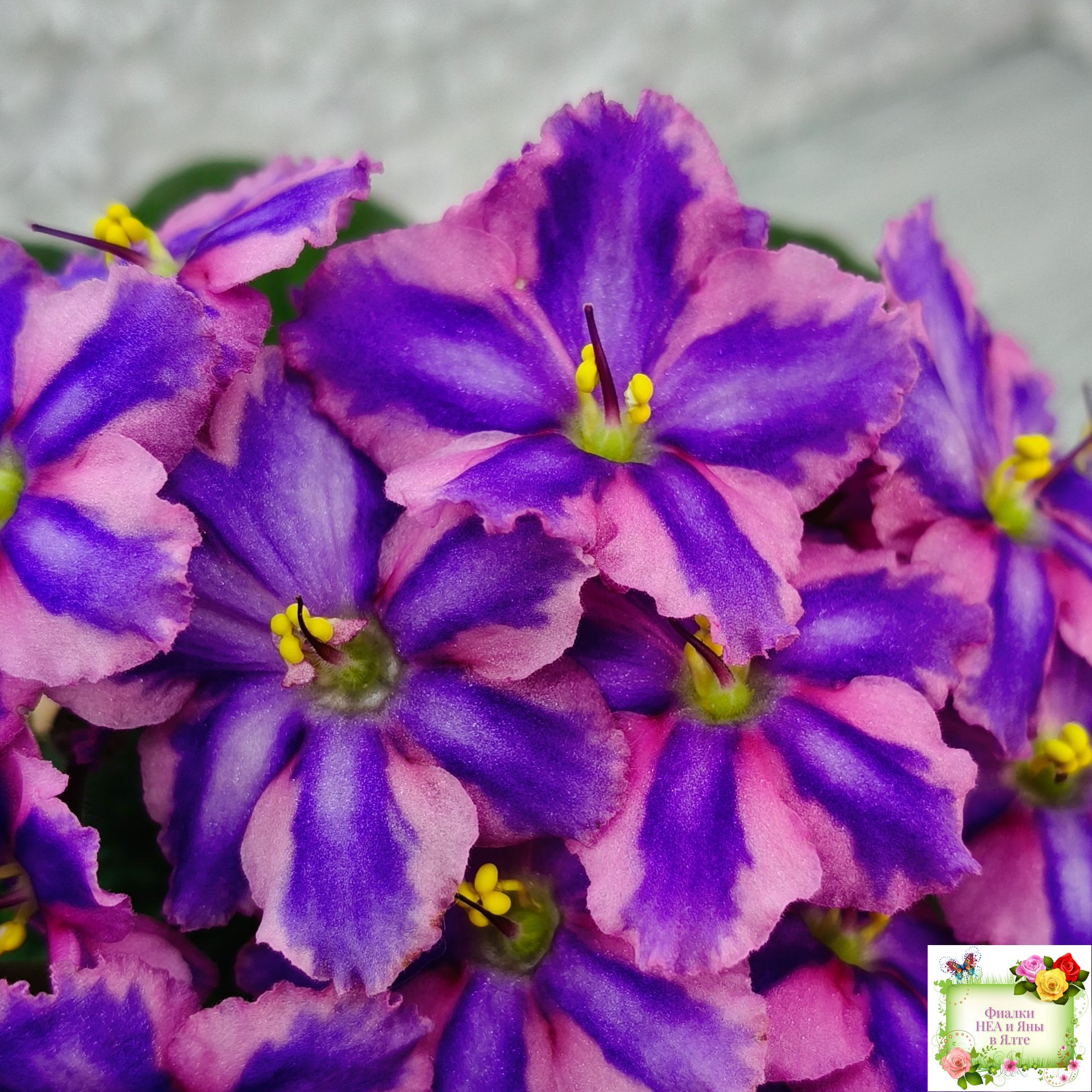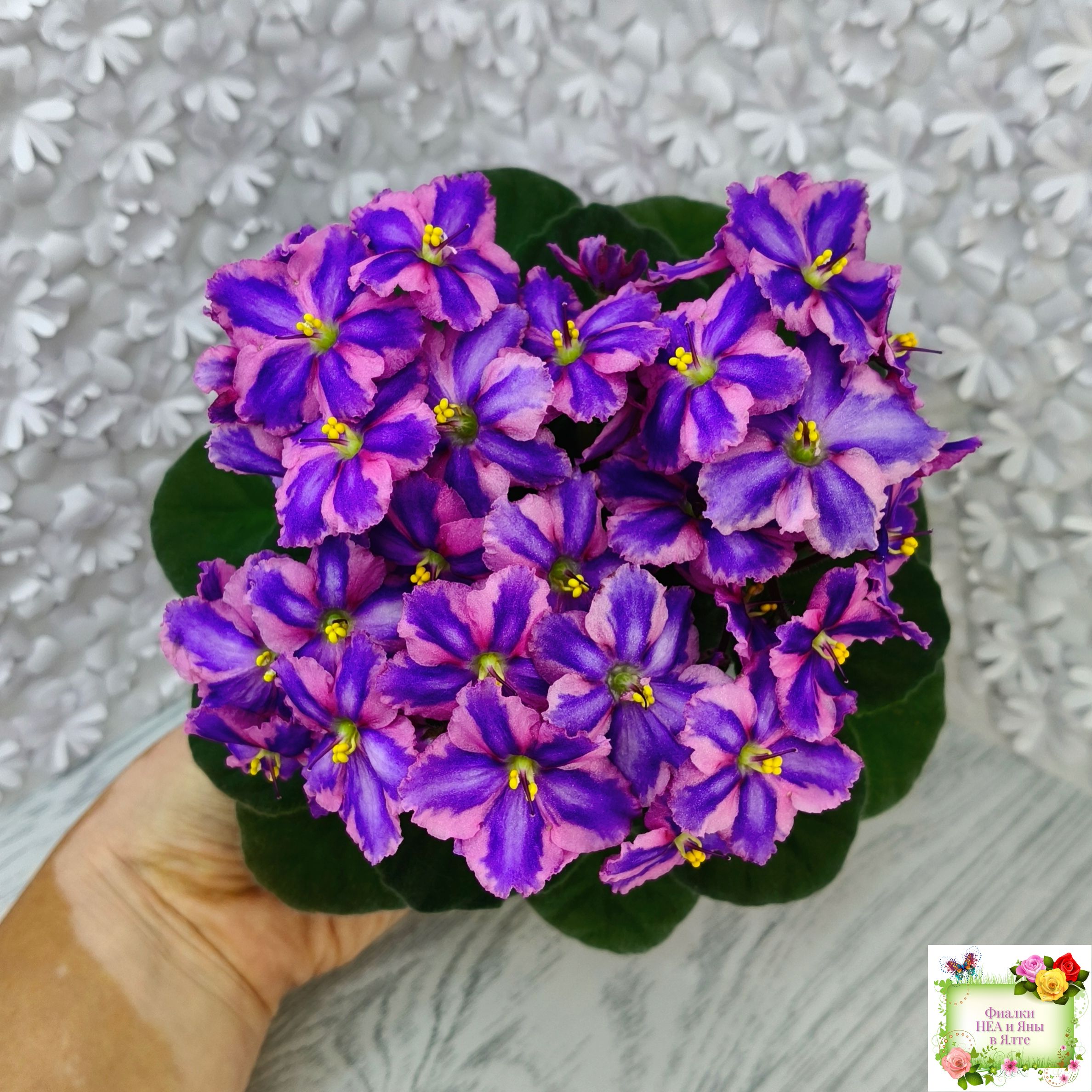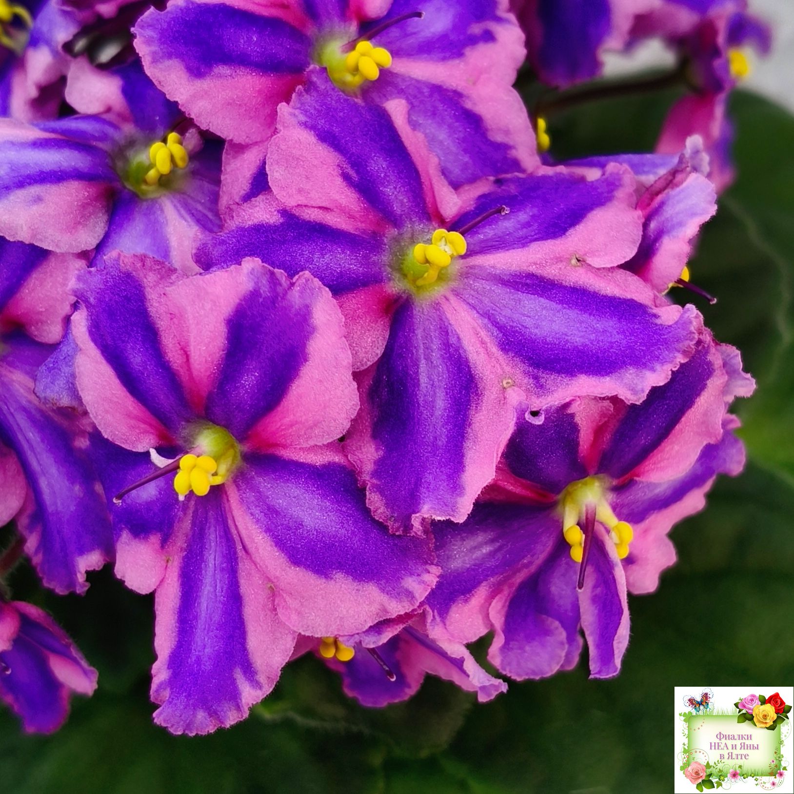 Невероятный трехцветный каскад цветов - по розовому фону светло сиреневые химерные полосы, по центру каждой полосы белая химерная полоса - "химера в химере". Маленькая розетка светлых листьев, постоянное шапочное цветение. Химера сказка! Исходник - химера Паркер. Стандарт.