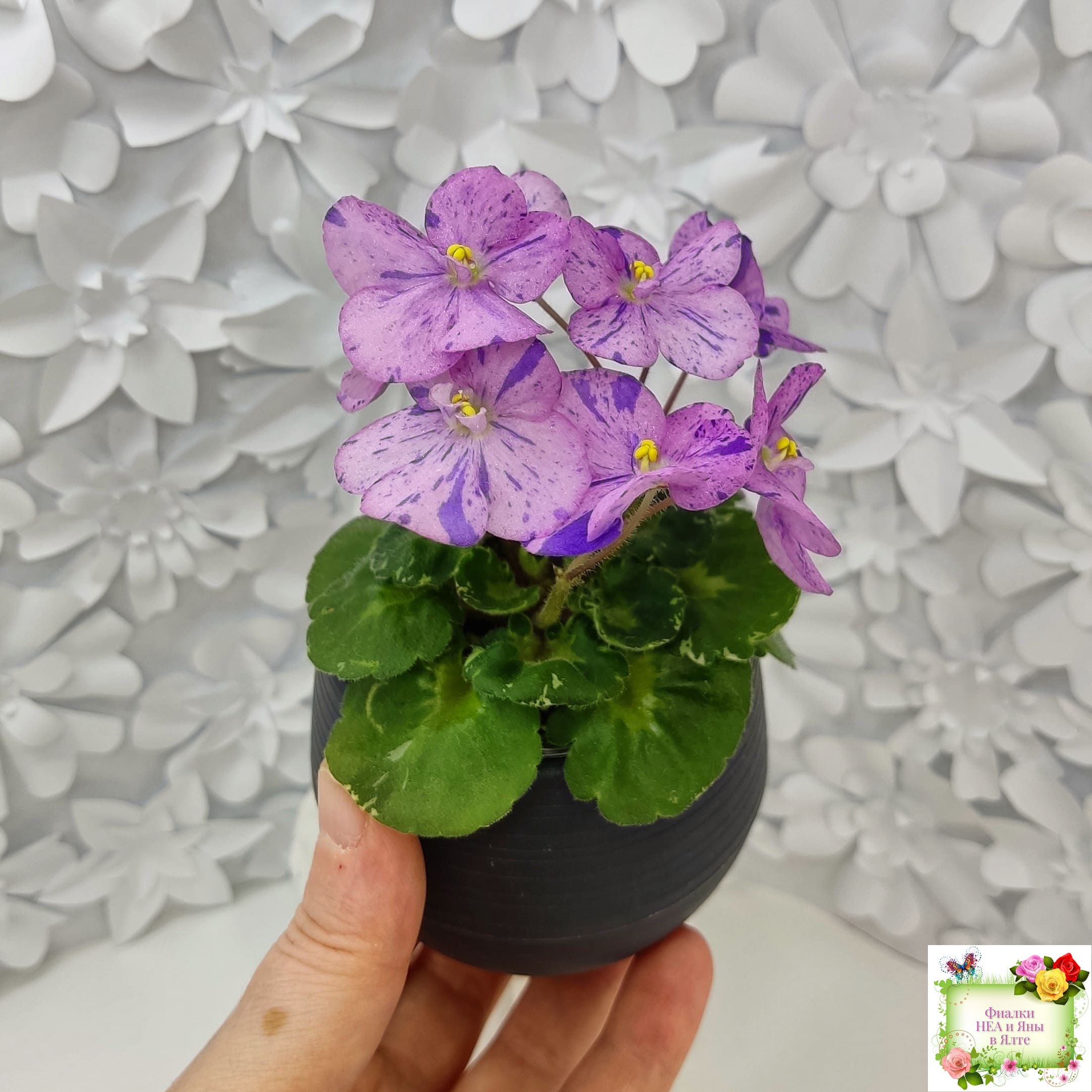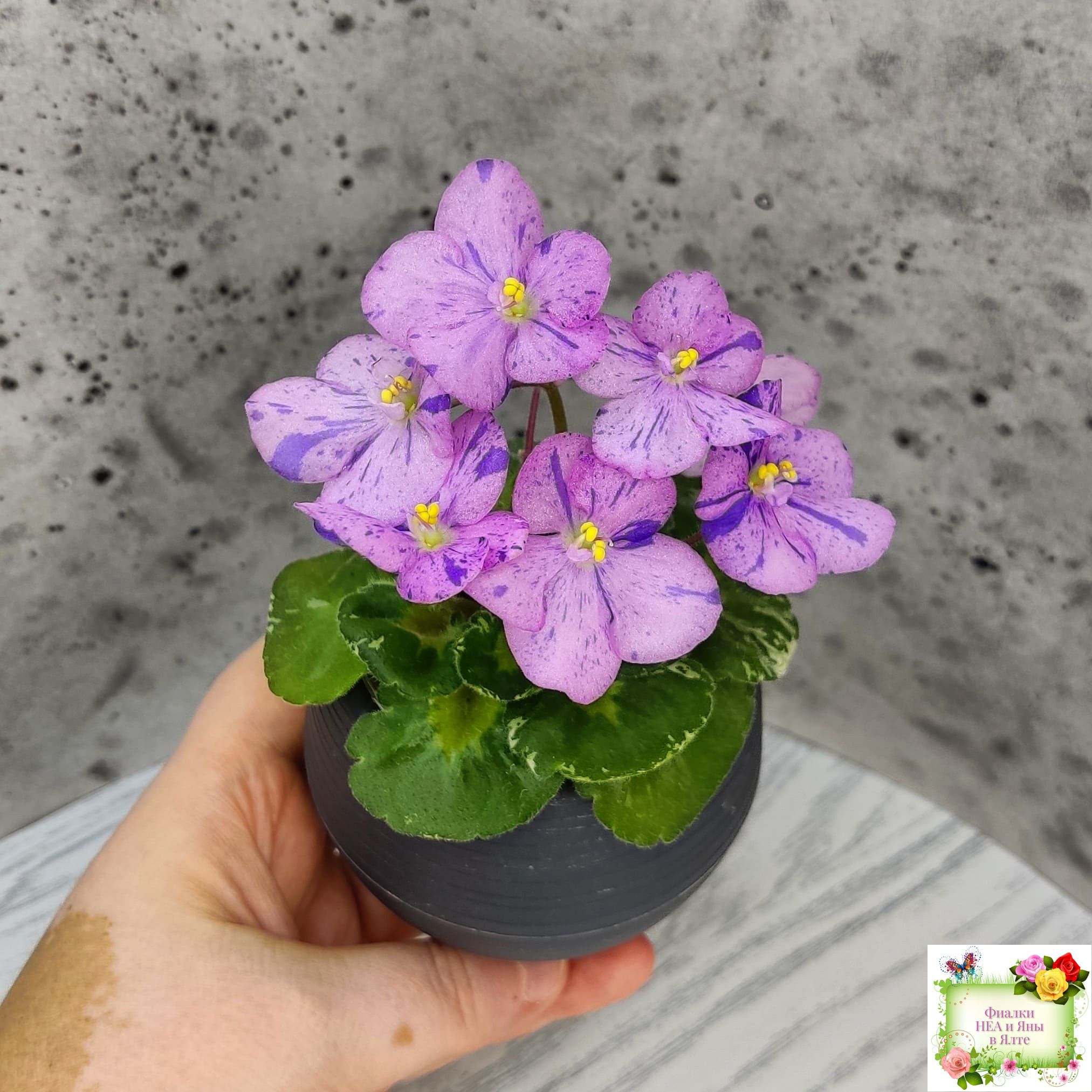 Простые или полумахровые крупные светло-розовые анютки щедро усыпанные светло-фиолетовым фэнтези. Пестрая темно-зеленая с белым гел-листва. Миниатюра.