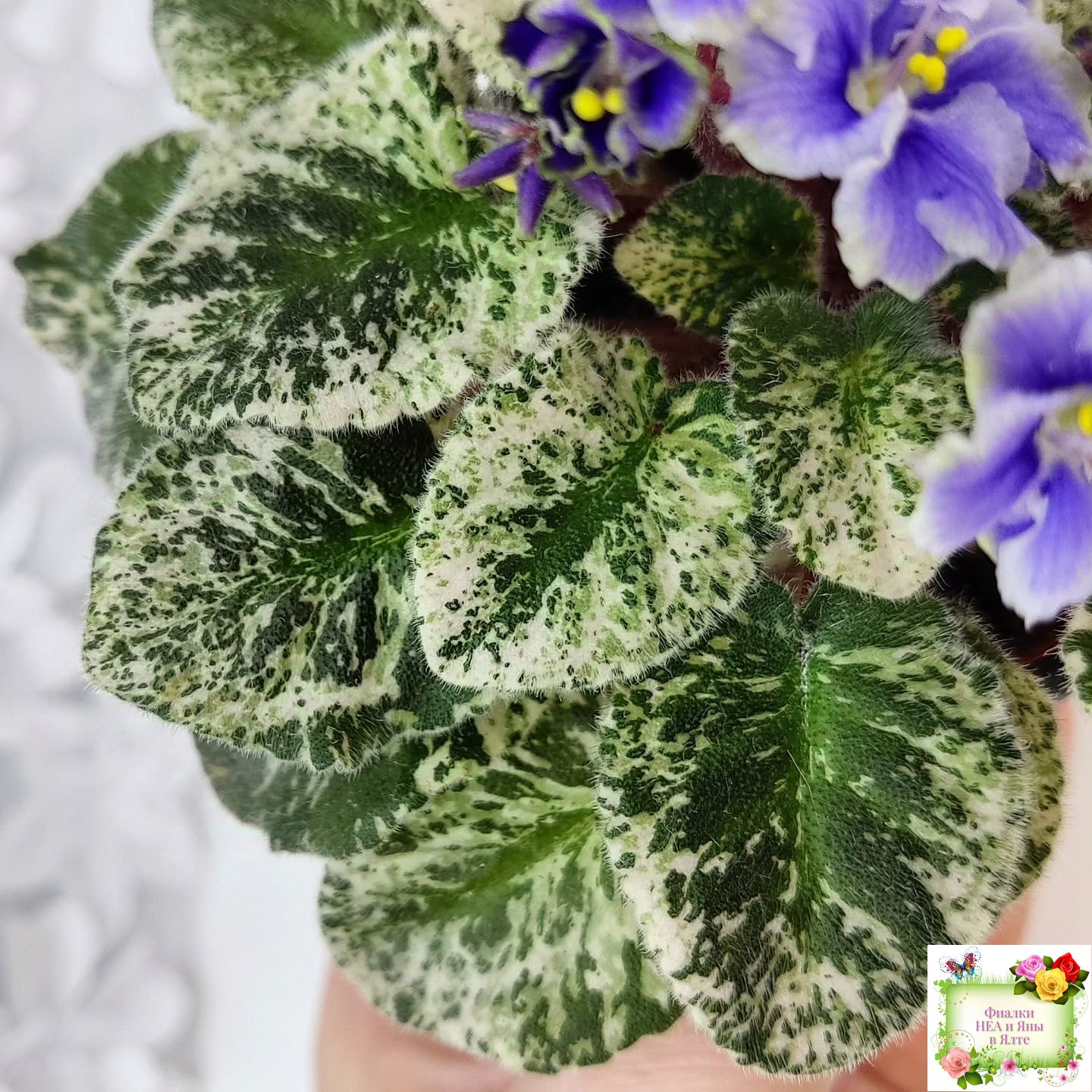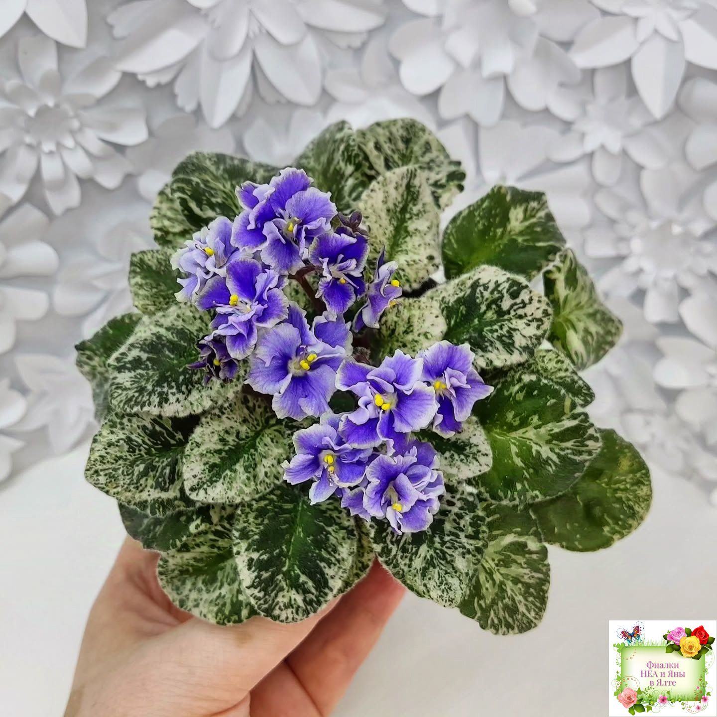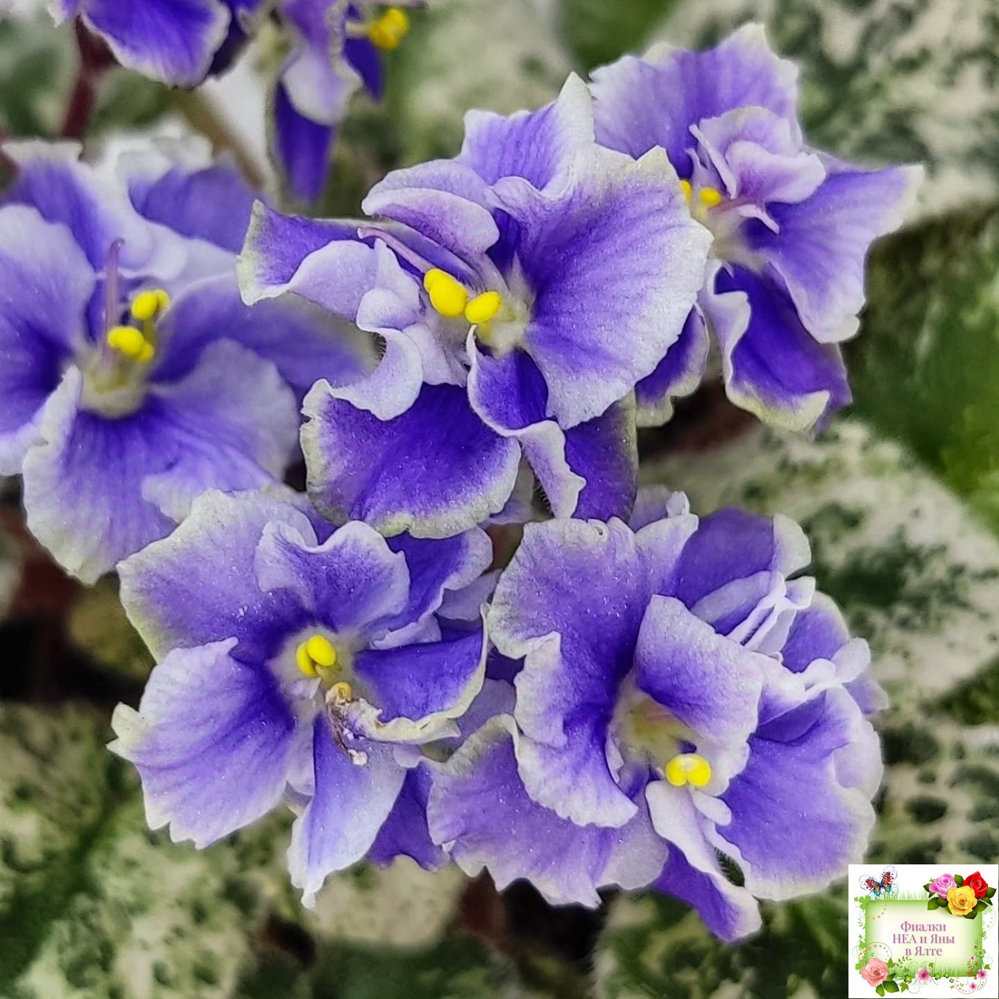 Крупные махровые светло-голубые цветы с широченными бахромчатыми белыми краями. Красивейшая пестрая зелено-белая со случайными розовыми фрагментами листва.
