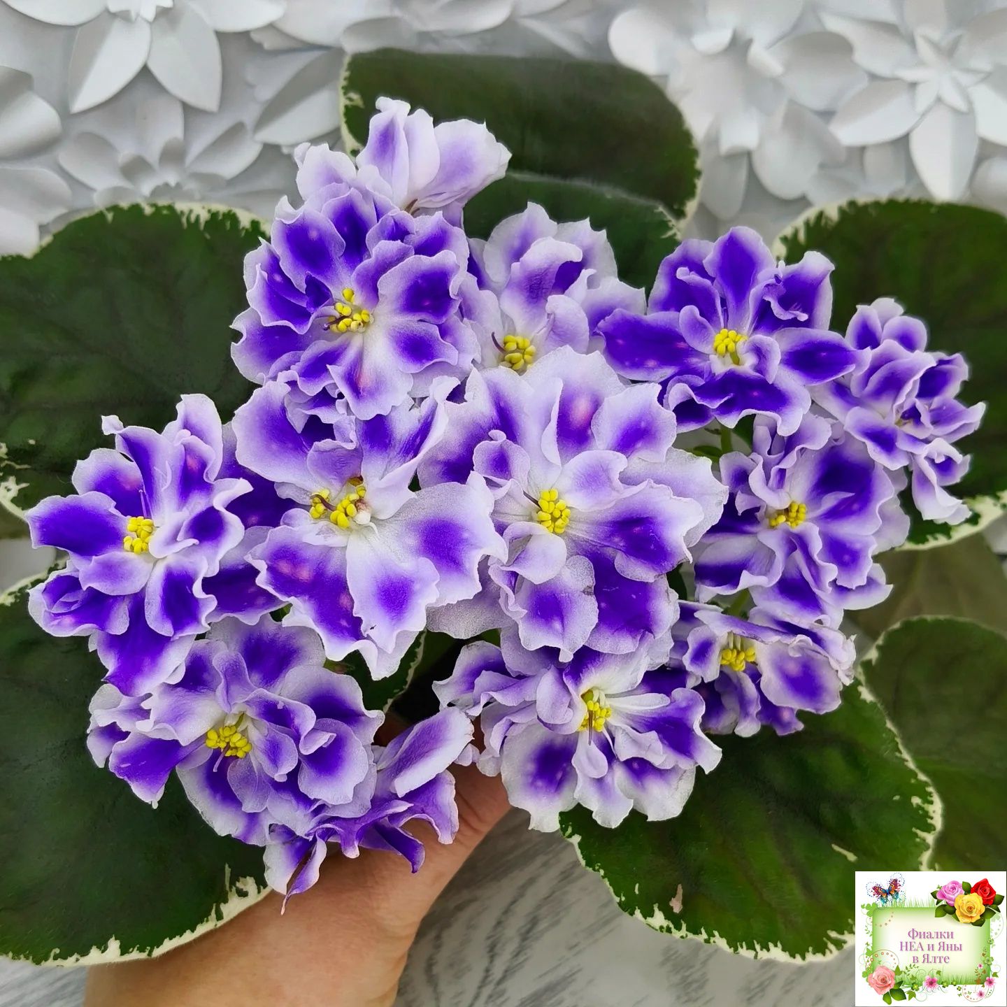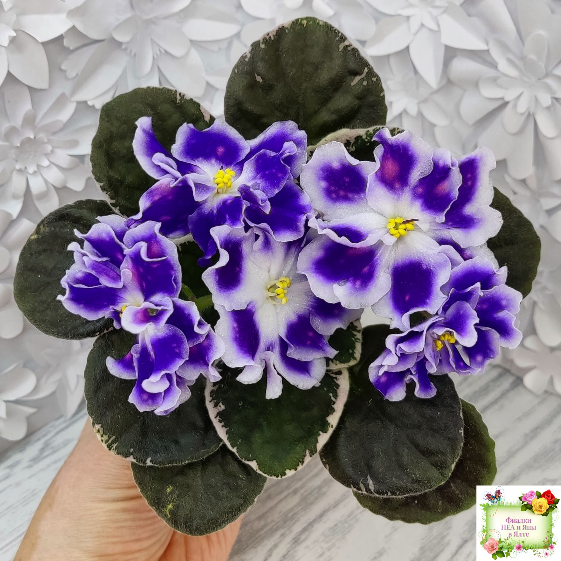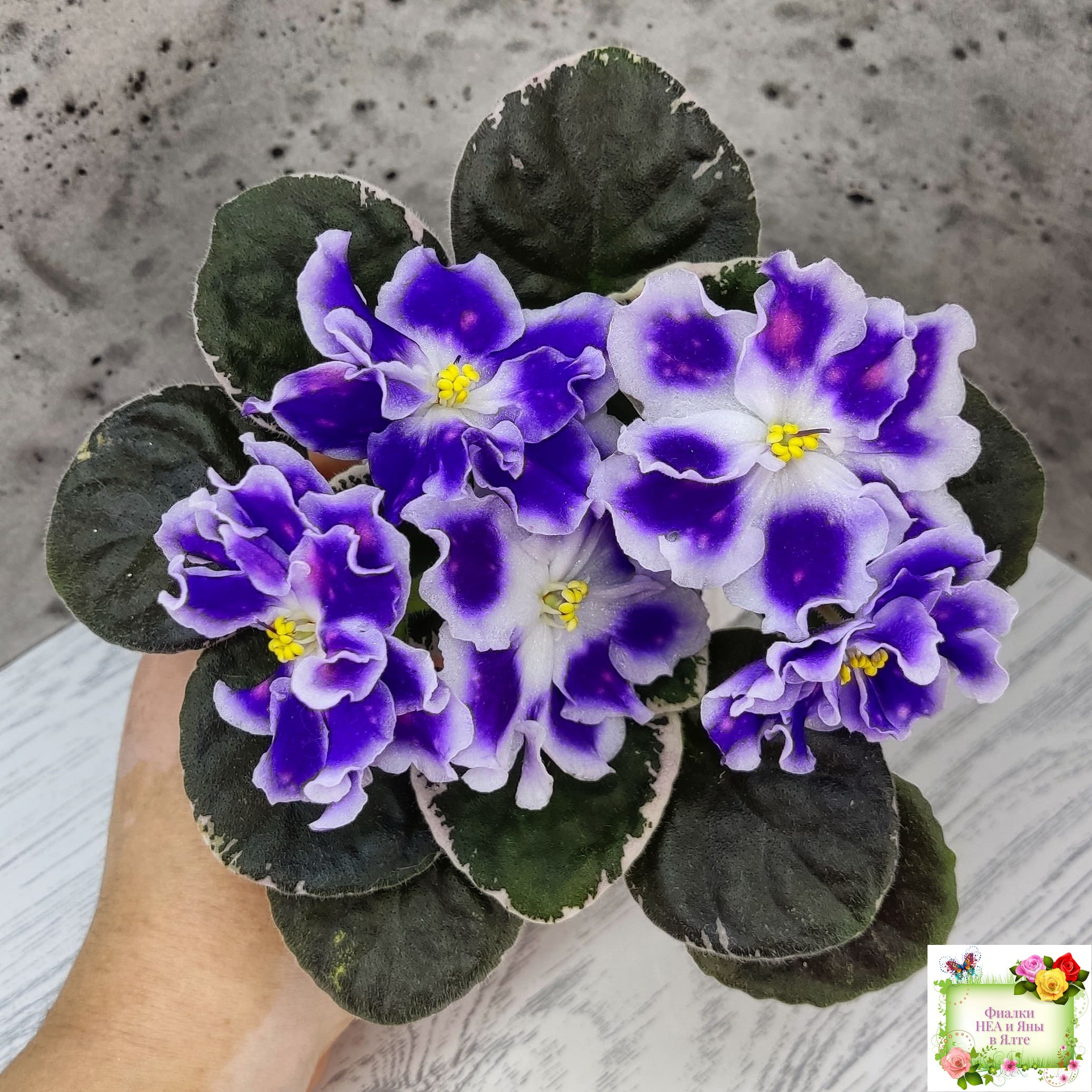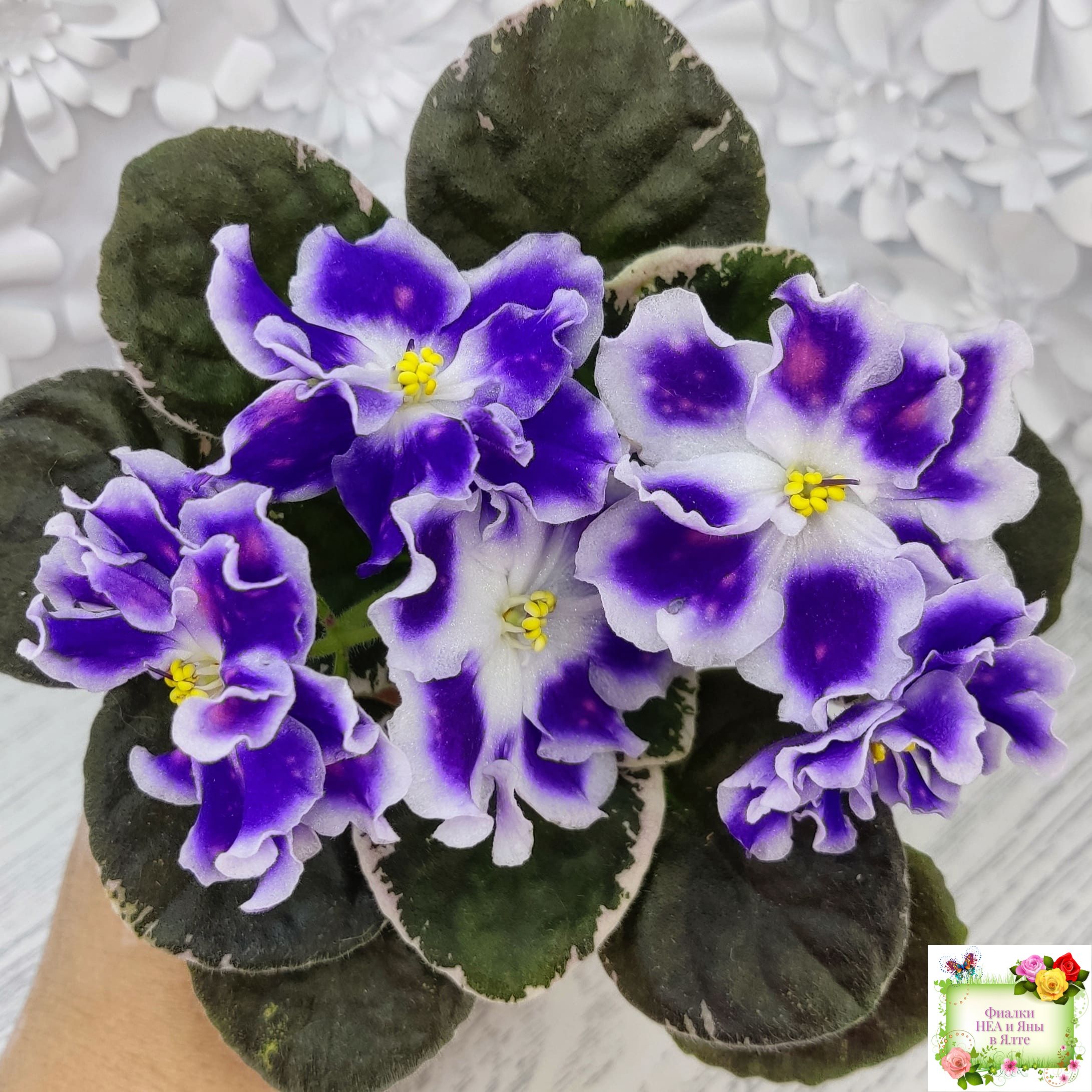 Крупные белые полумахровые звезды с фиолетовым напечатком, по которому рассыпаны розовые горошки фэнтези. Красивая пестролистная розетка.