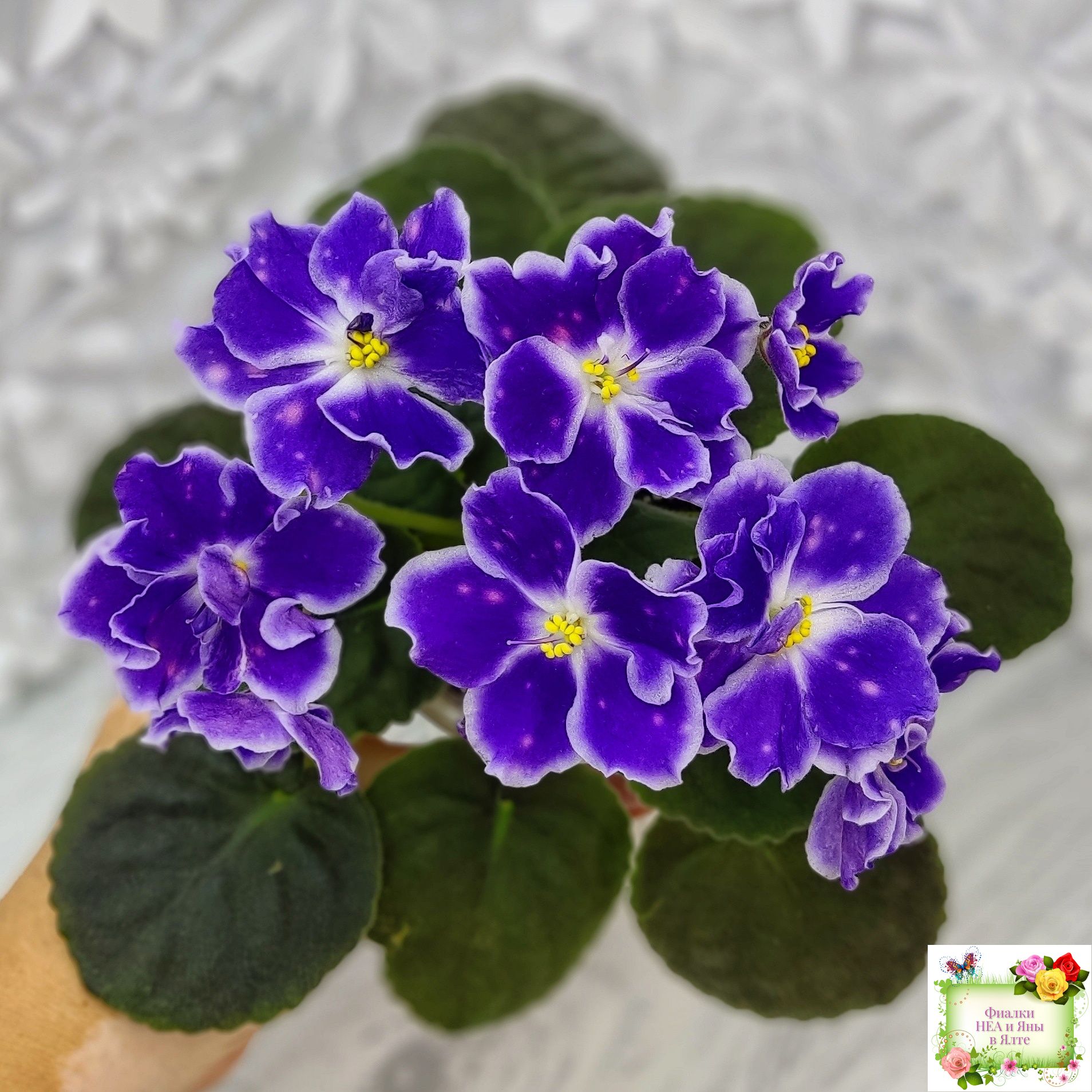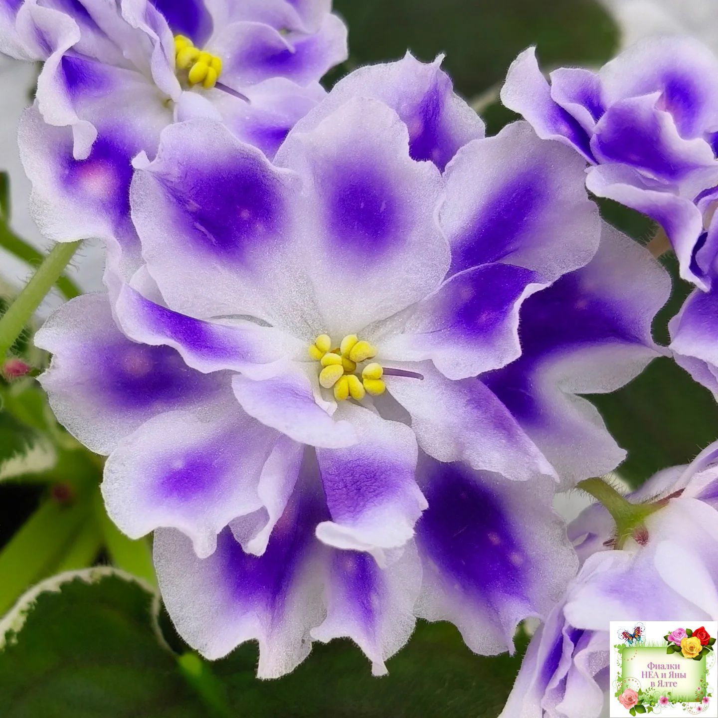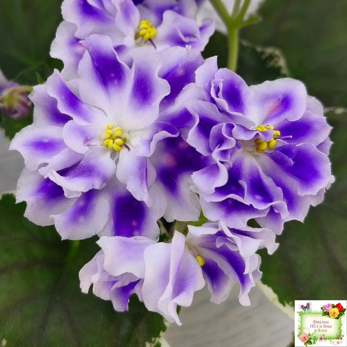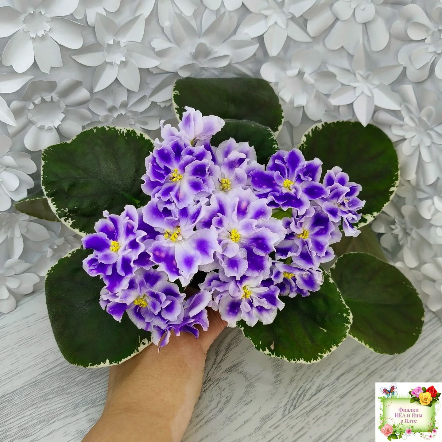 Крупные белые полумахровые звезды с фиолетовым напечатком, по которому рассыпаны розовые горошки фэнтези. Красивая пестролистная розетка.