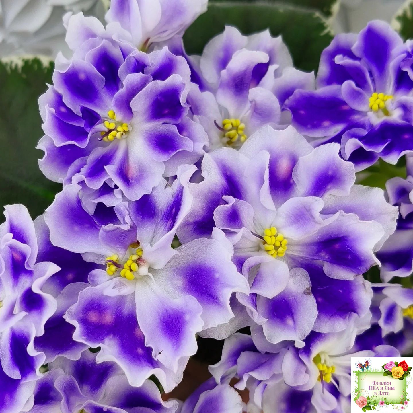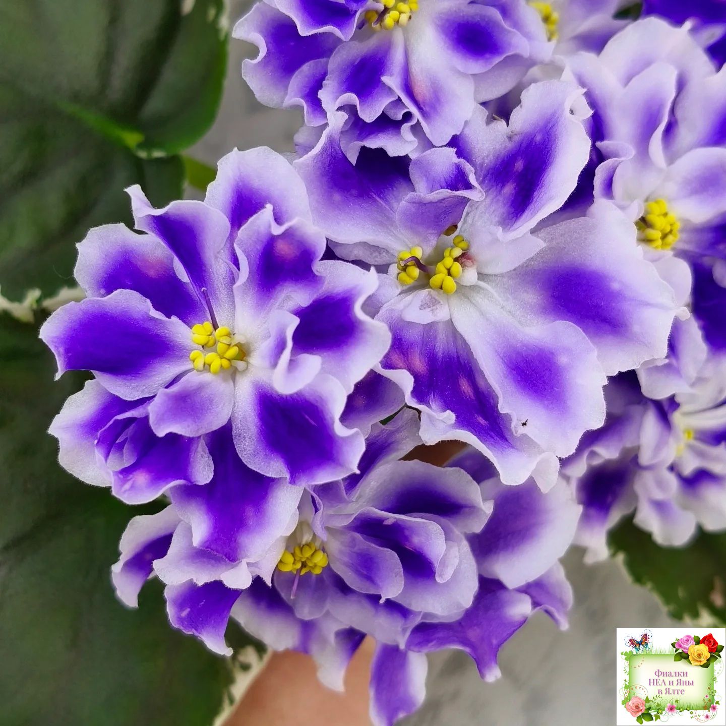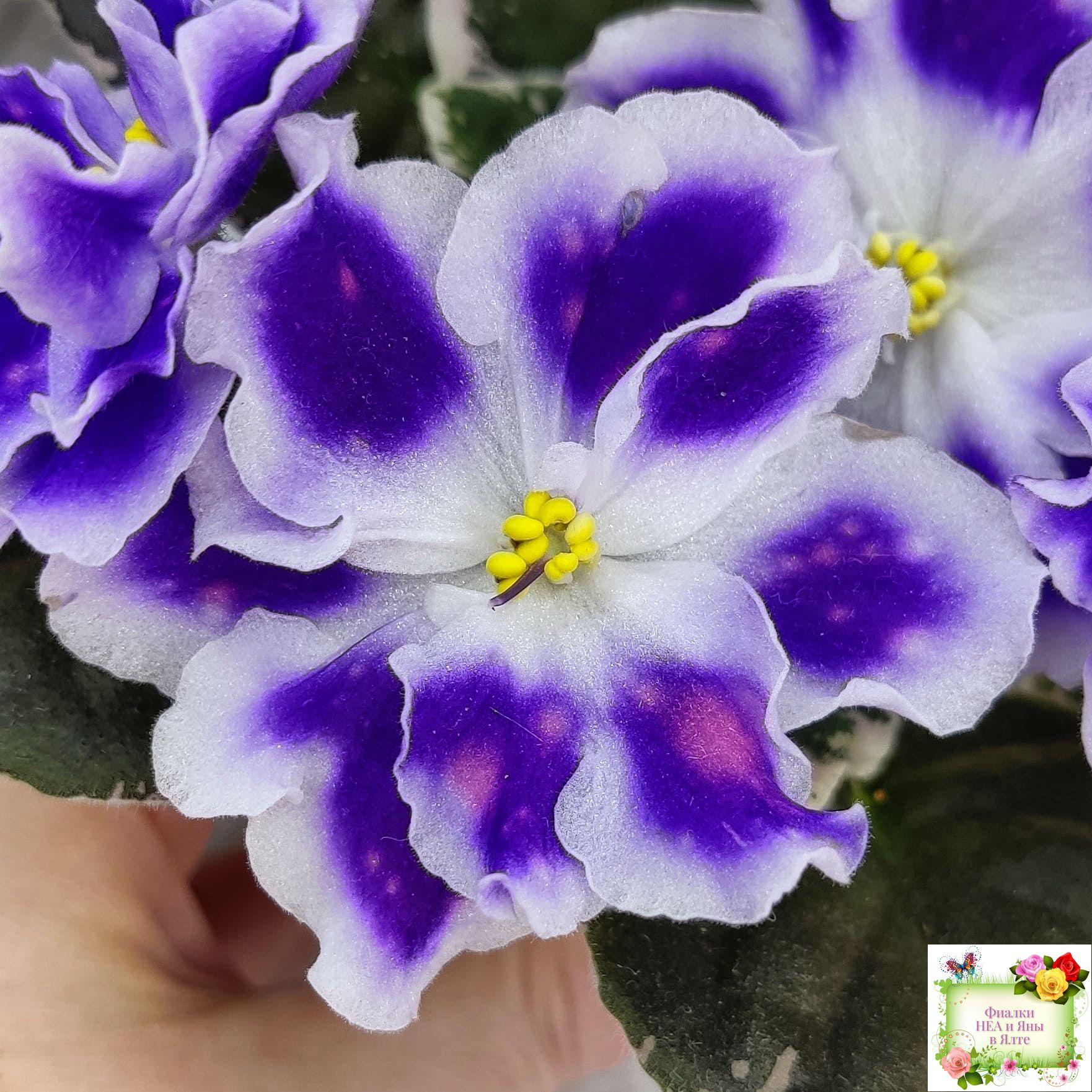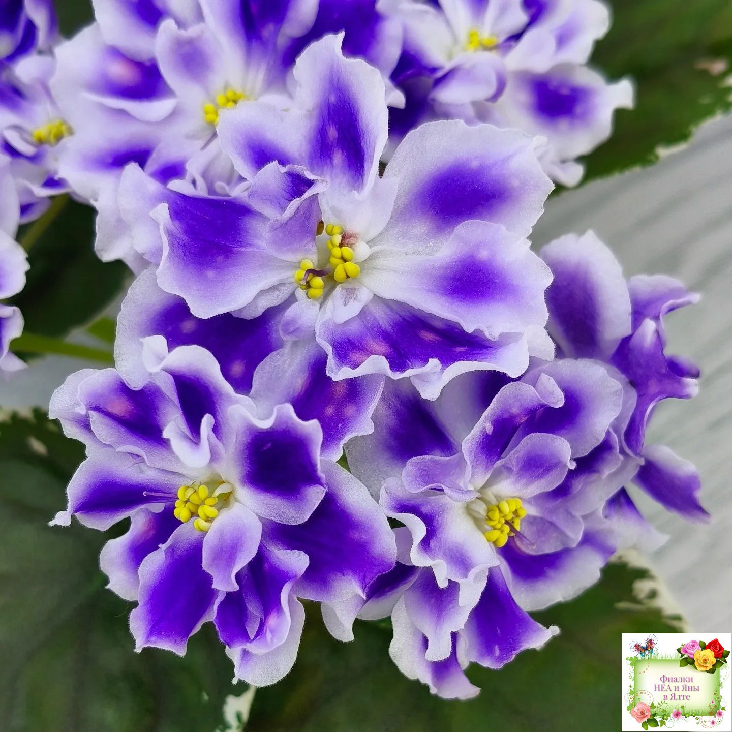 Крупные белые полумахровые звезды с фиолетовым напечатком, по которому рассыпаны розовые горошки фэнтези. Красивая пестролистная розетка.