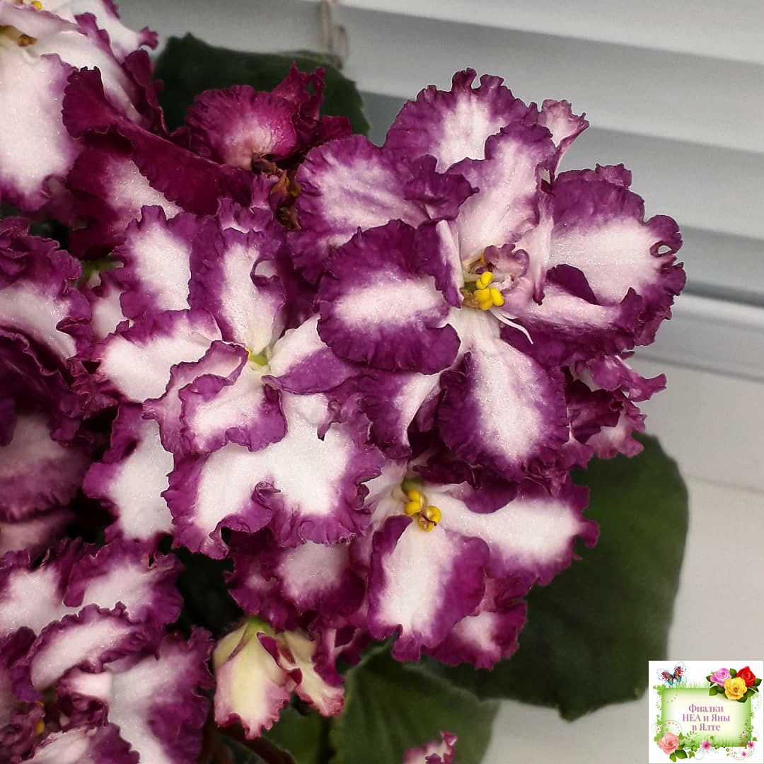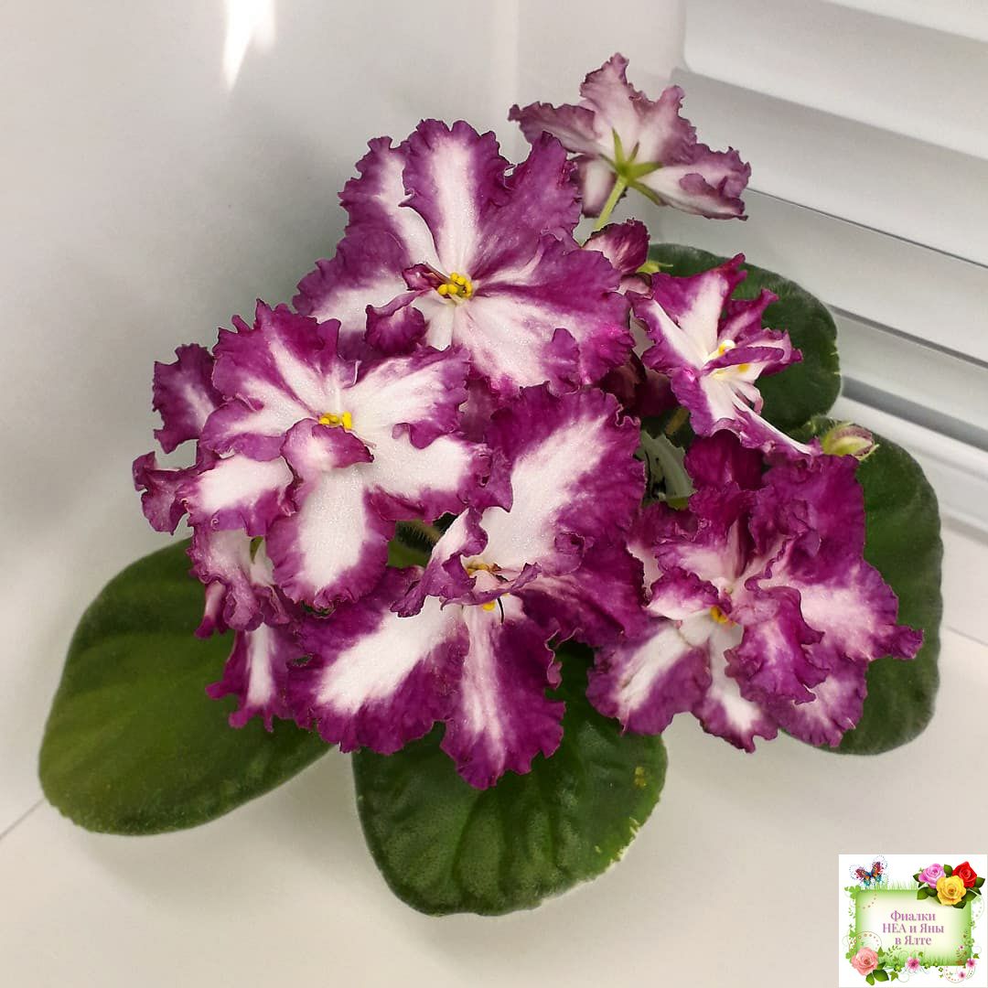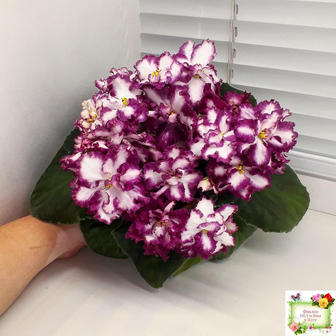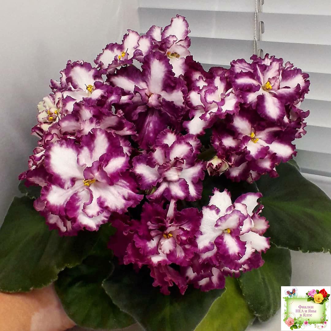 Крупные, яркие, контрастные, белые цветы с вариабельной красно-бордовой каймой. Стандартная пестролистная аккуратная розетка.