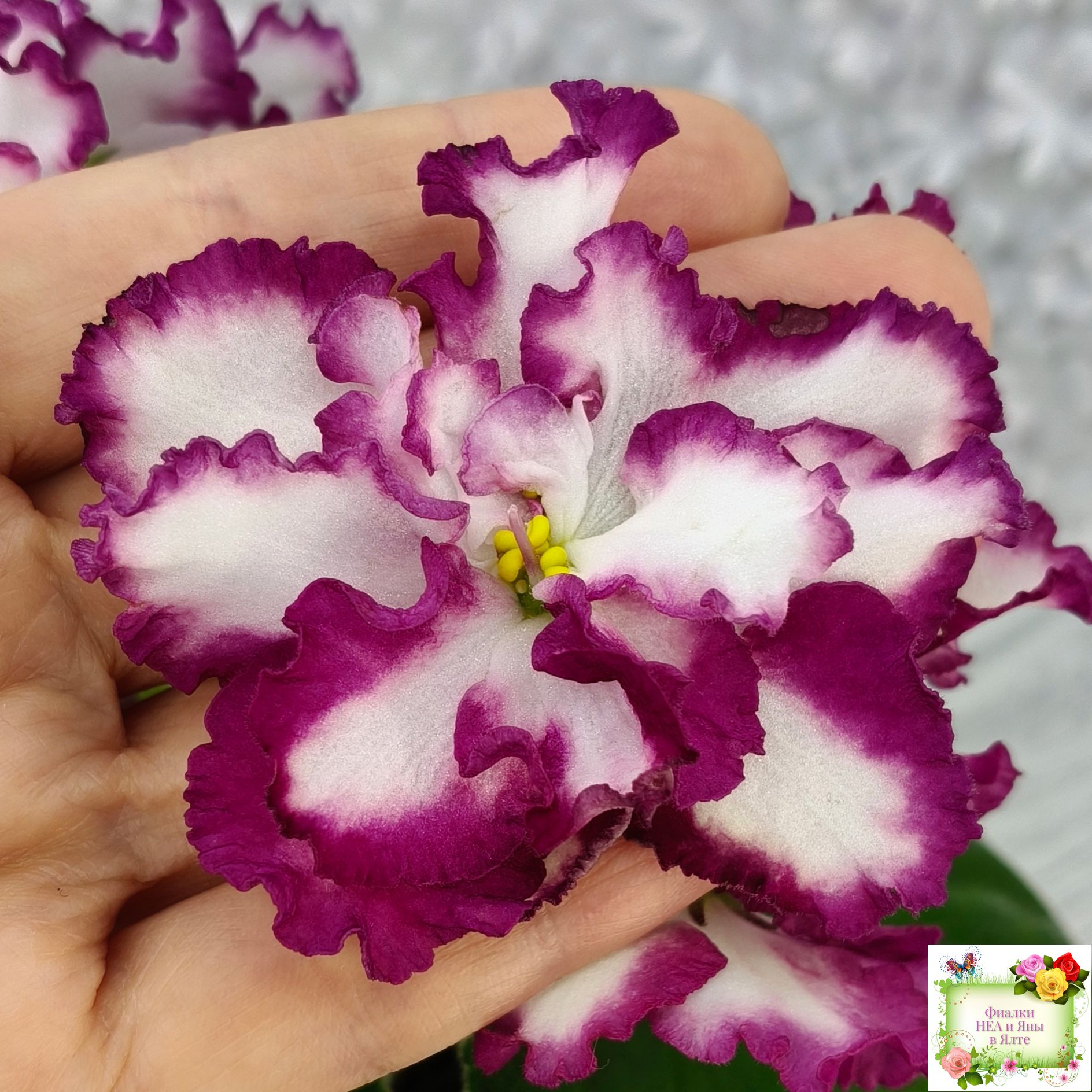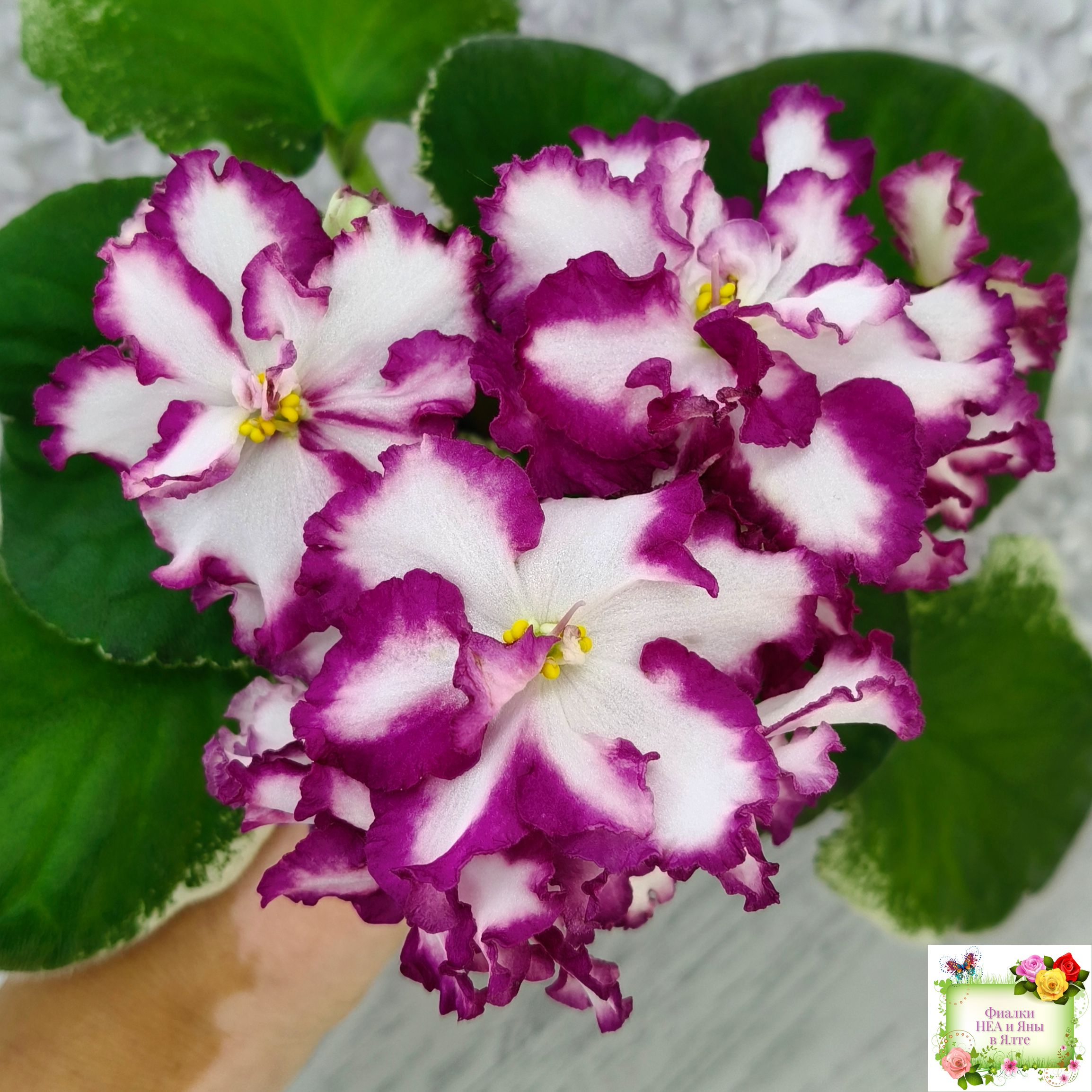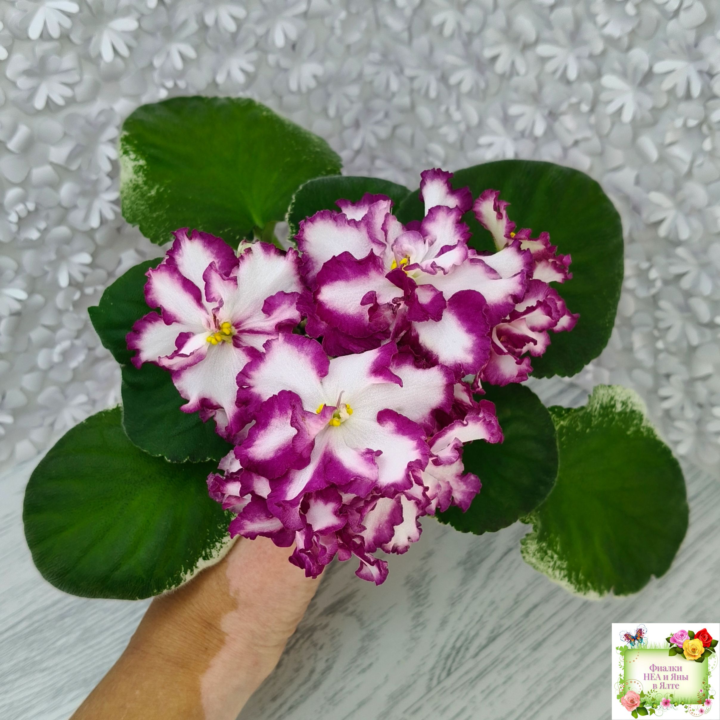 Крупные, яркие, контрастные, белые цветы с вариабельной красно-бордовой каймой. Стандартная пестролистная аккуратная розетка.