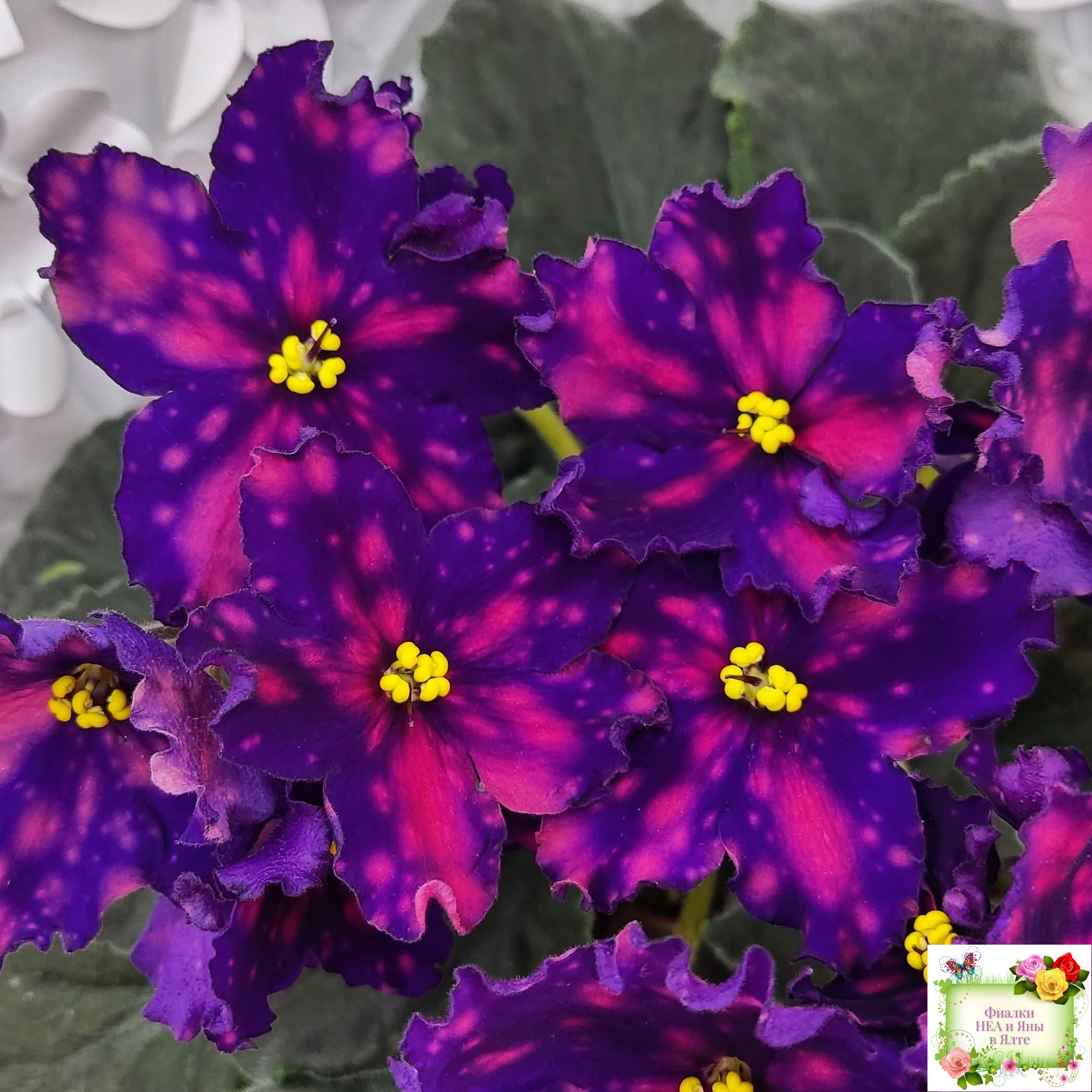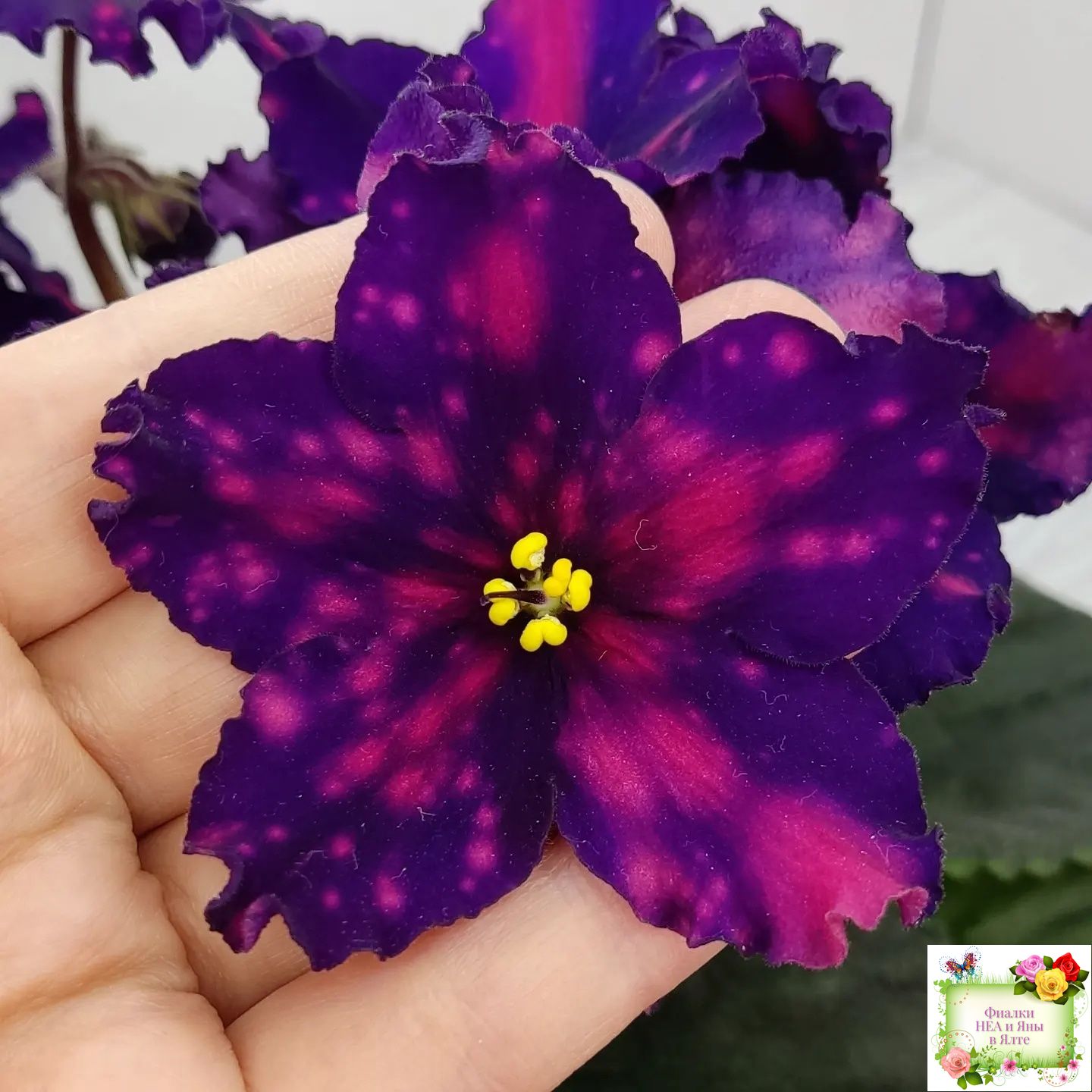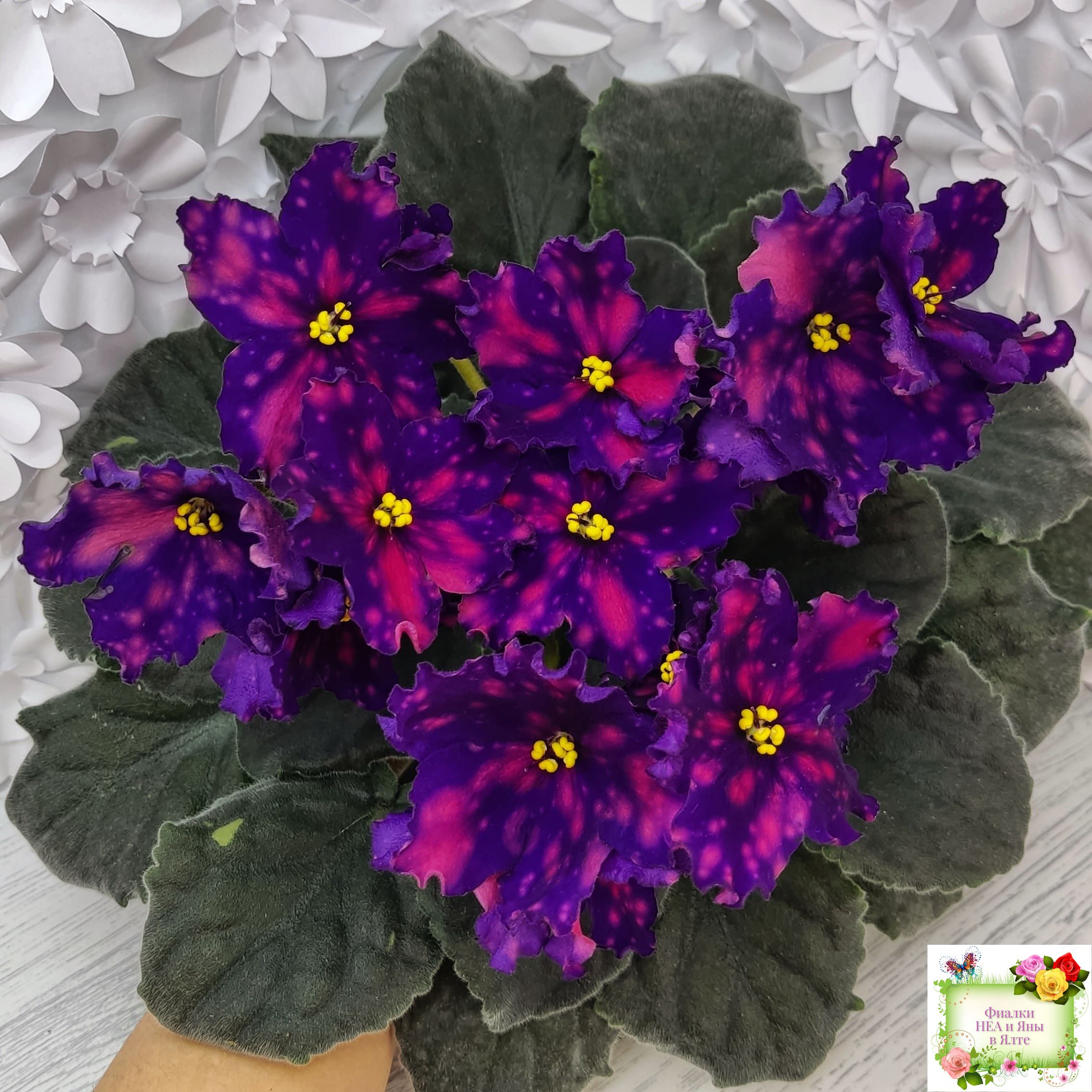 Цветок: Очень контрастные темно фиалотовые звезды с крупными и частыми розовыми горошинами