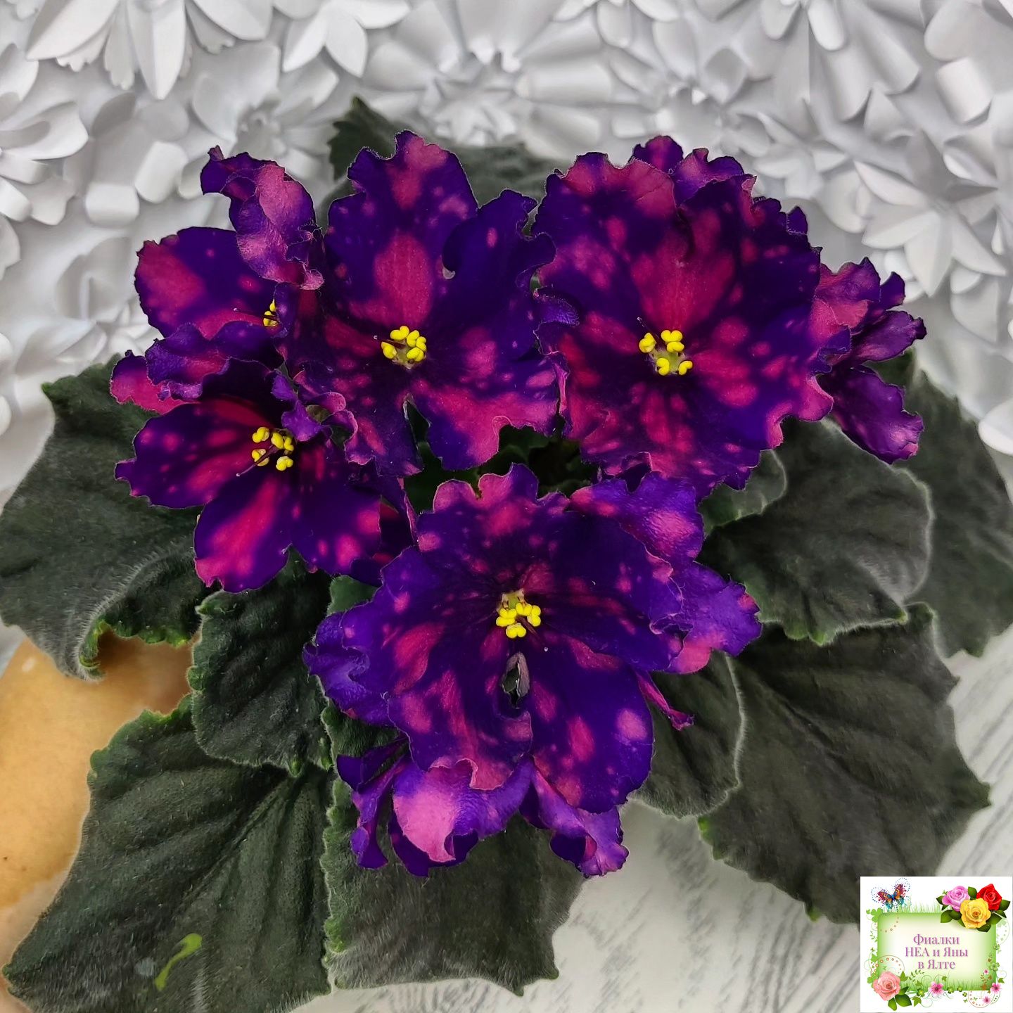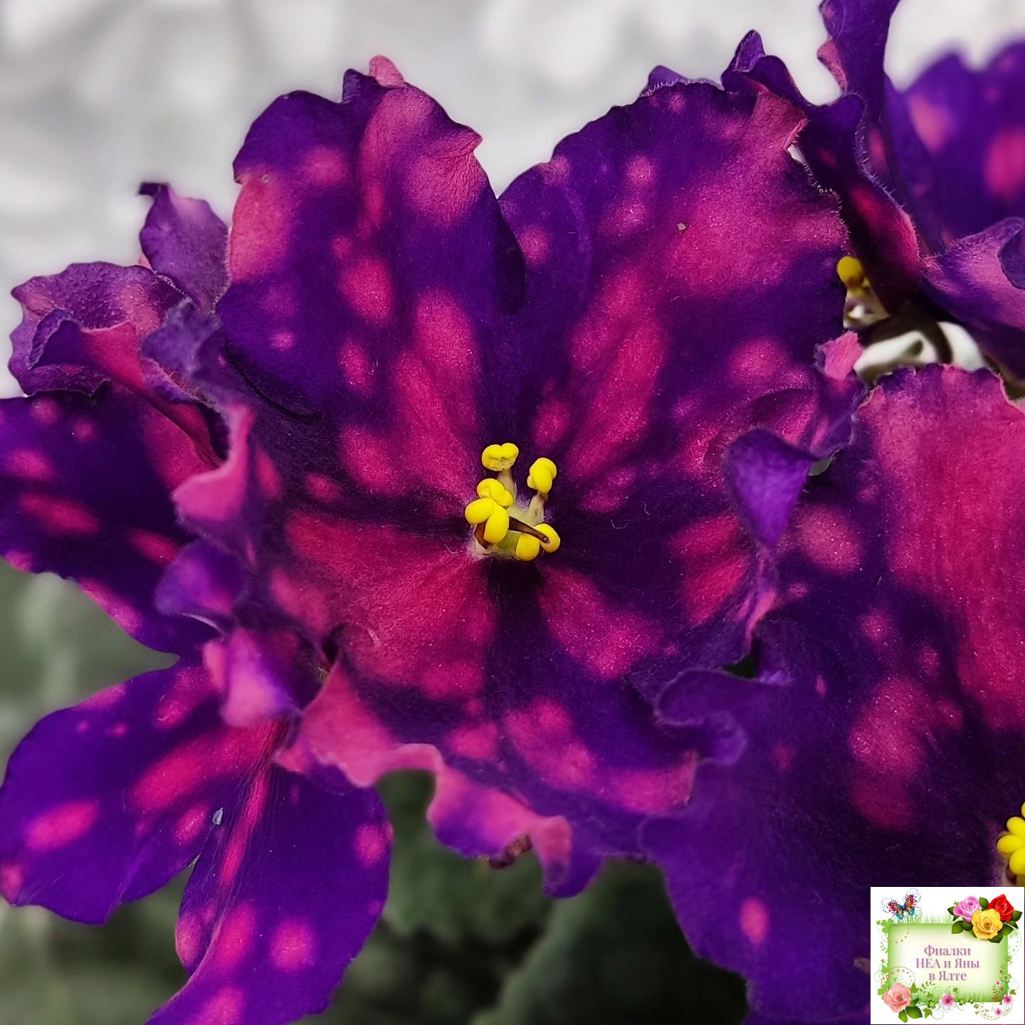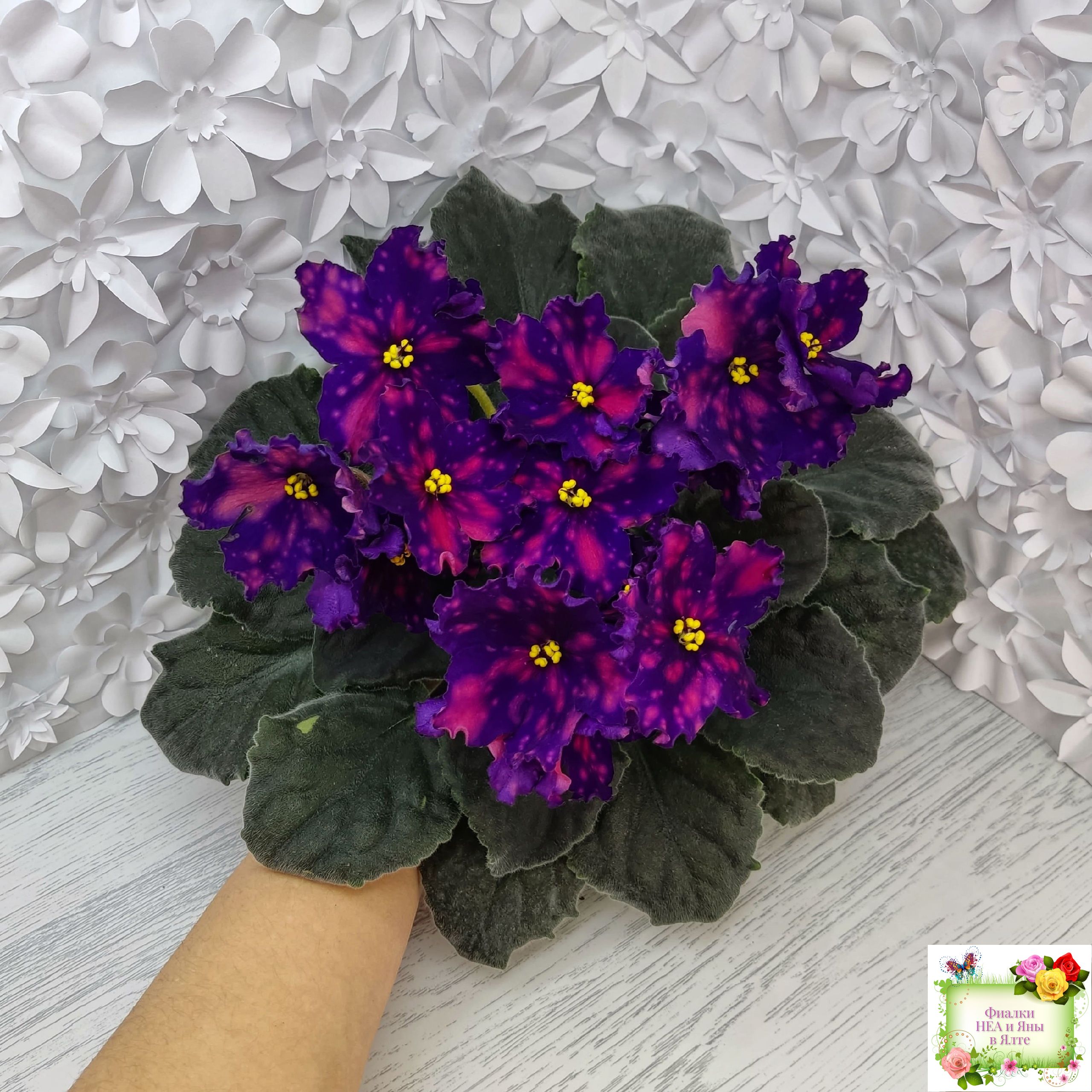 Цветок: Очень контрастные темно фиалотовые звезды с крупными и частыми розовыми горошинами